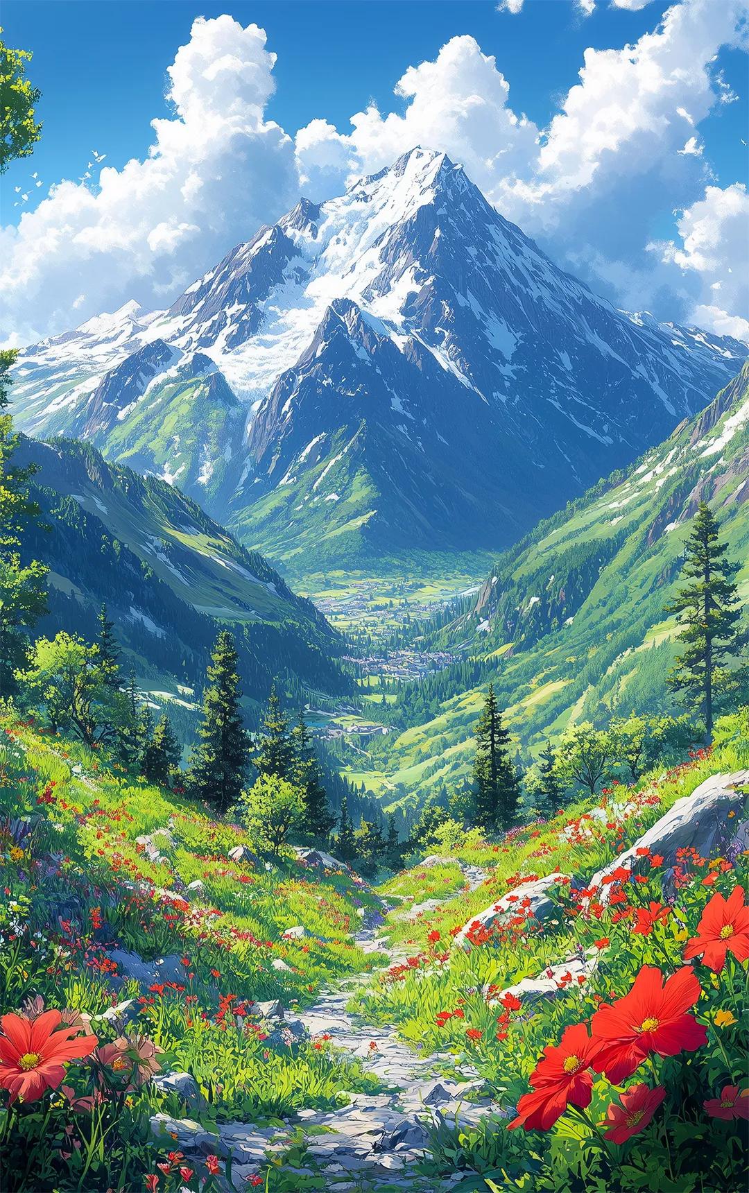Mountain Landscape, Alpine Scenery, Valley View, Nature Illustration iPhone Wallpaper Background with a maximum resolution of 1080x1720 px.