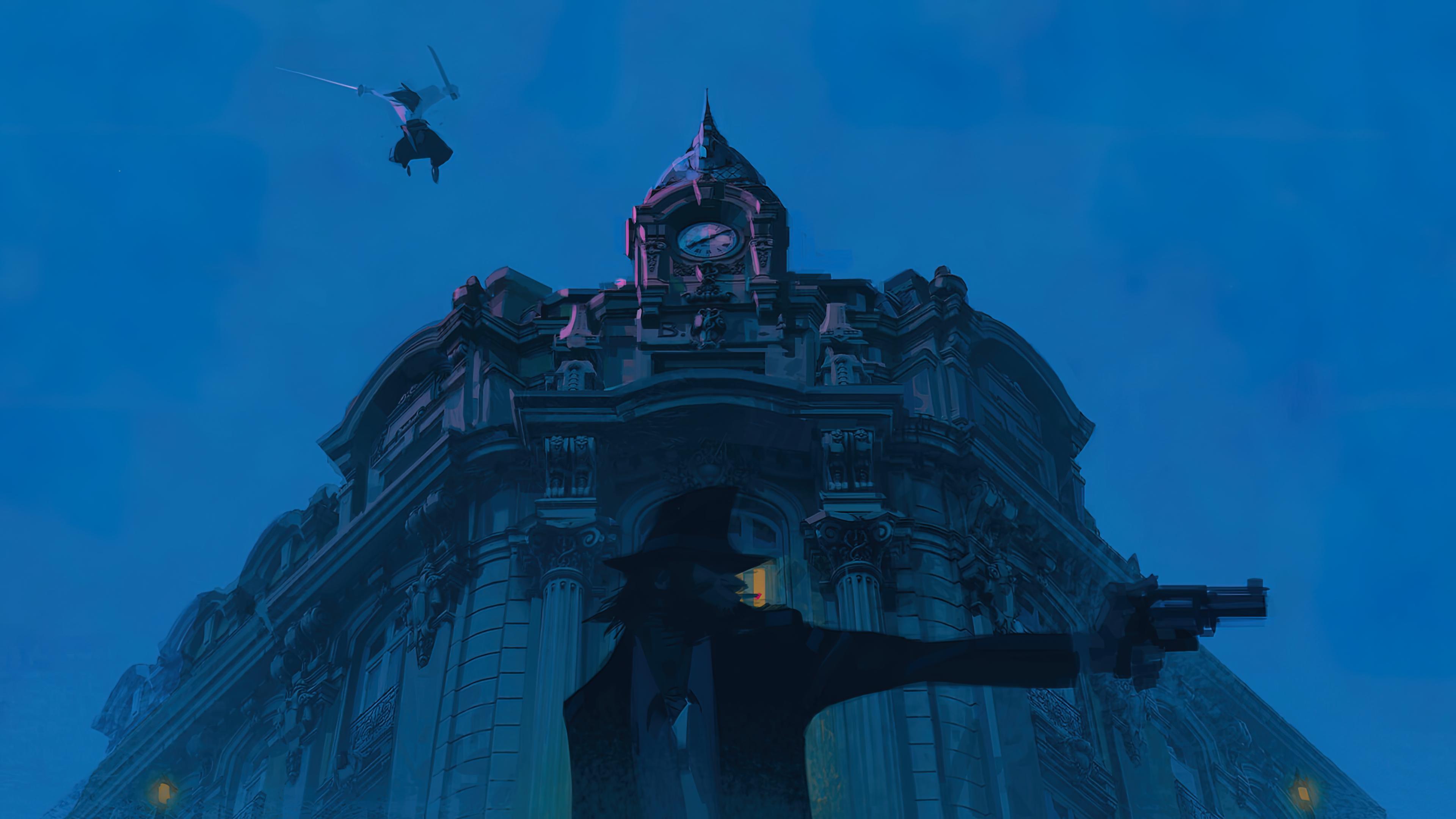 Noir, Assassin, Clocktower, Detective 4K Desktop Wallpaper