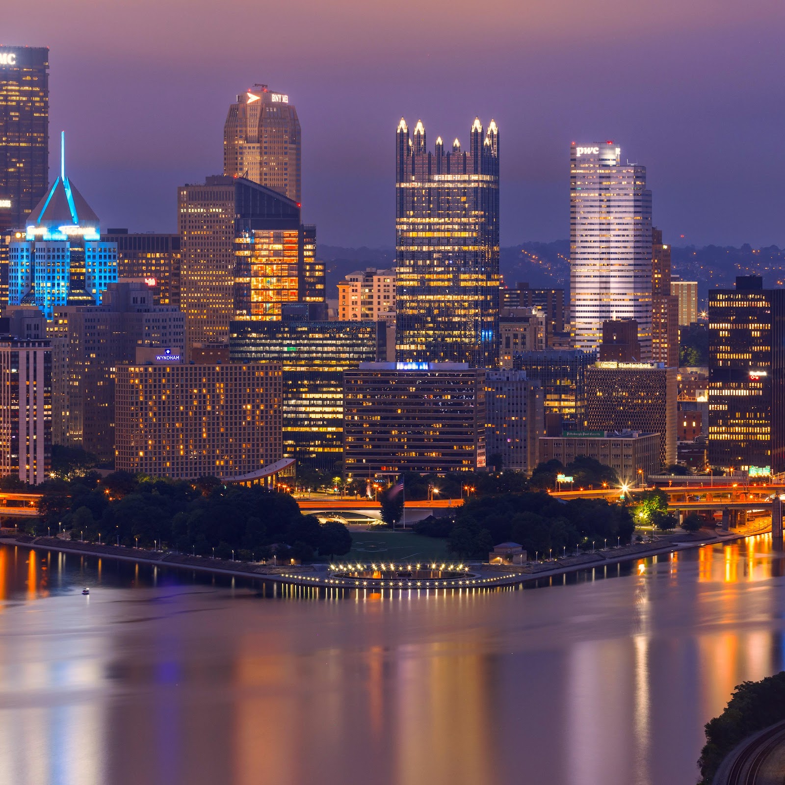Pittsburgh Skyline, Cityscape, Night Photography, Urban Scene 5K Desktop and Mobile Wallpaper Background with a maximum resolution of 6144x3456 px.