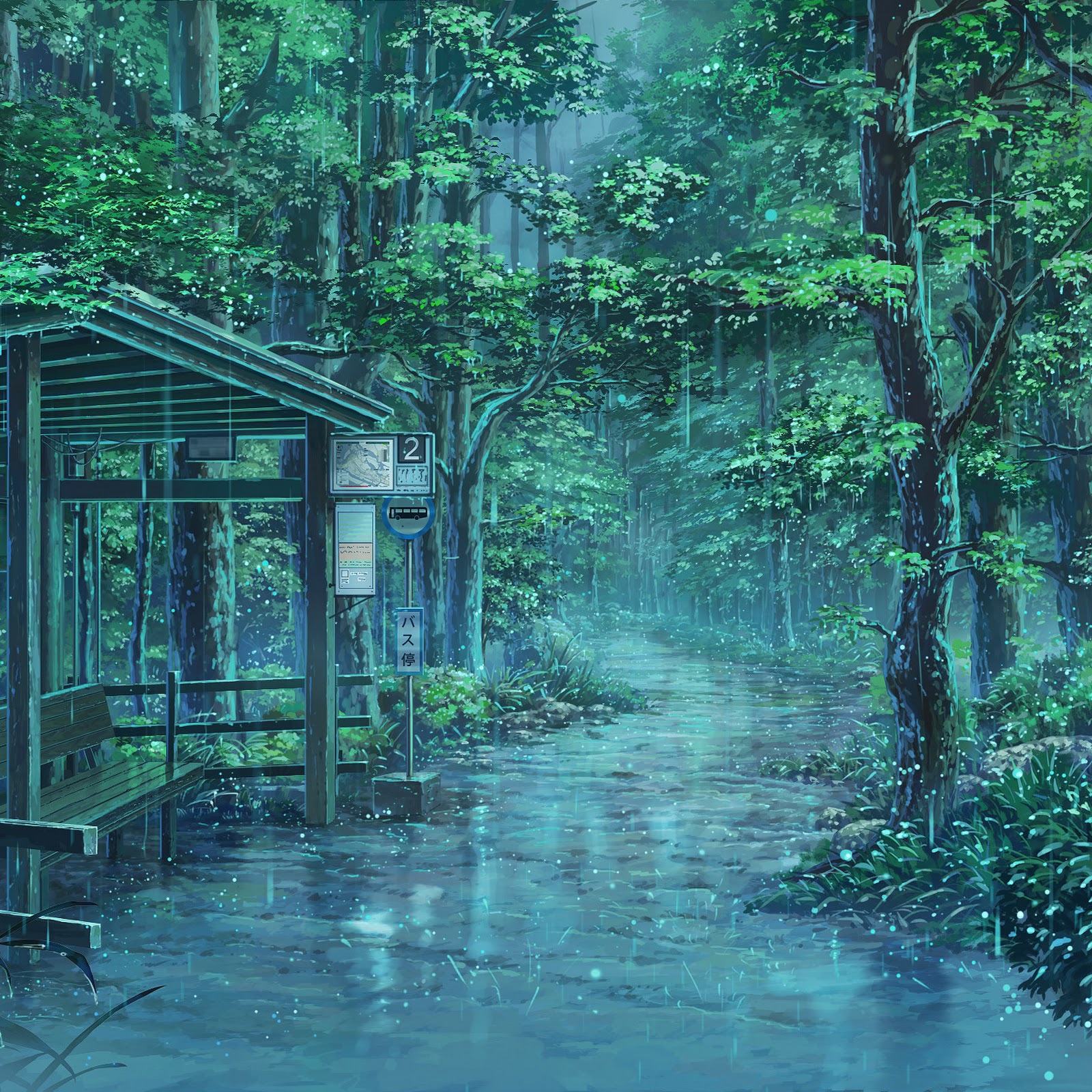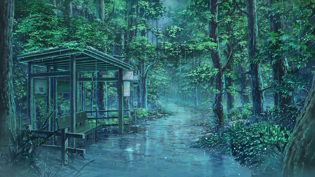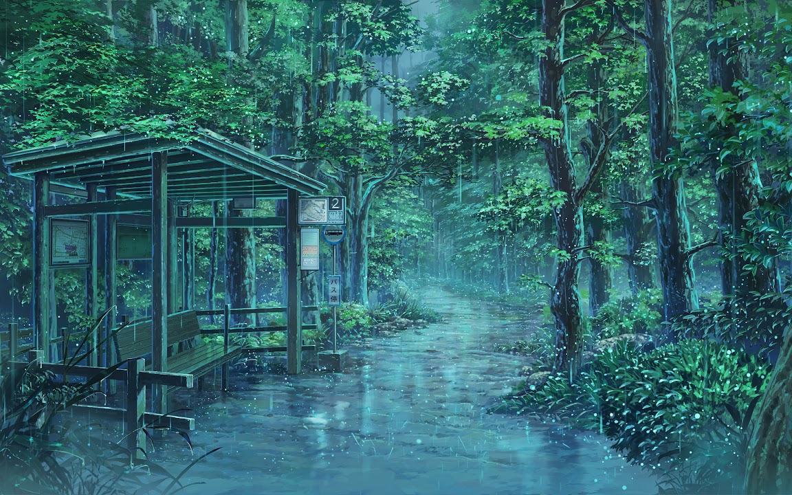 Rainy Forest, Bus Stop, Anime Landscape, Greenery Full HD Desktop Wallpaper