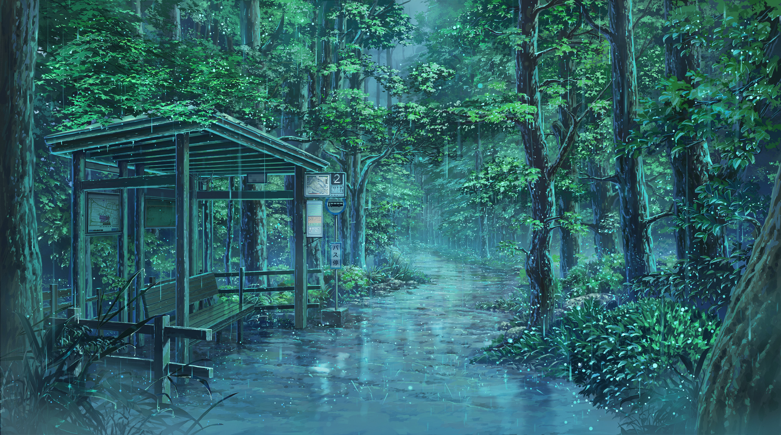 Rainy Forest, Bus Stop, Anime Landscape, Greenery Full HD Desktop and Mobile Wallpaper Background with a maximum resolution of 2560x1426 px.