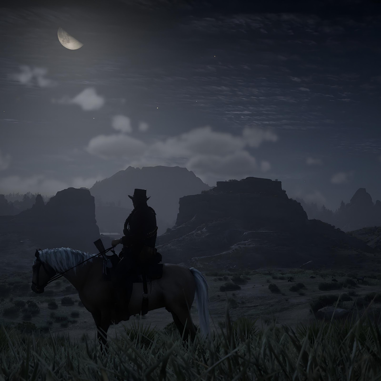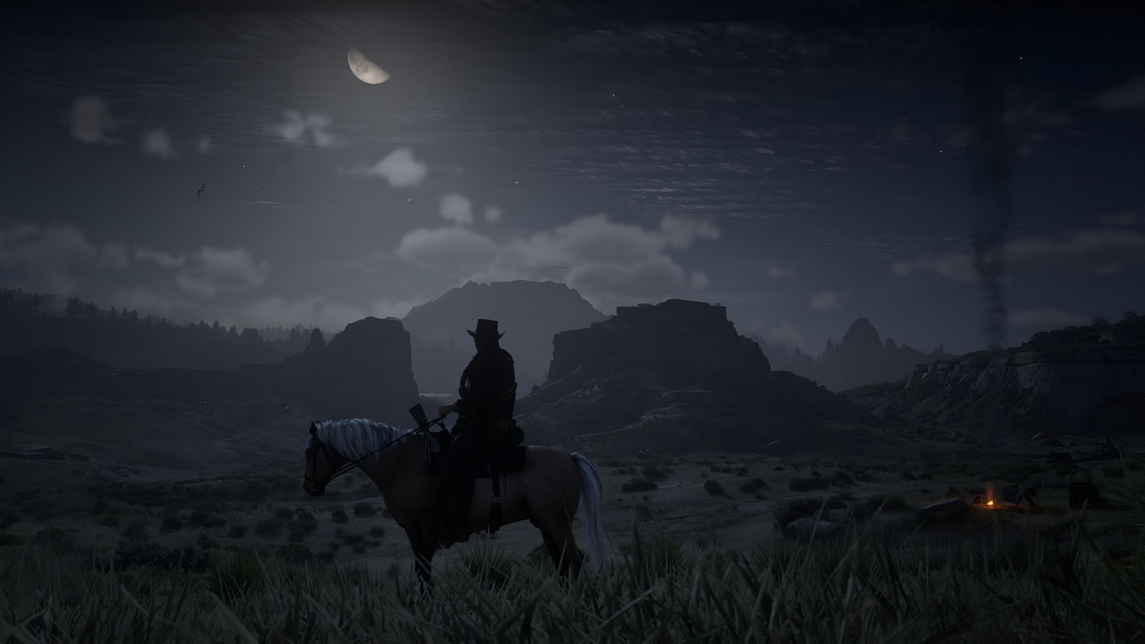 Red Dead Redemption, Cowboy, Night, Landscape 4K Desktop and Mobile Wallpaper Background with a maximum resolution of 3840x2160 px.