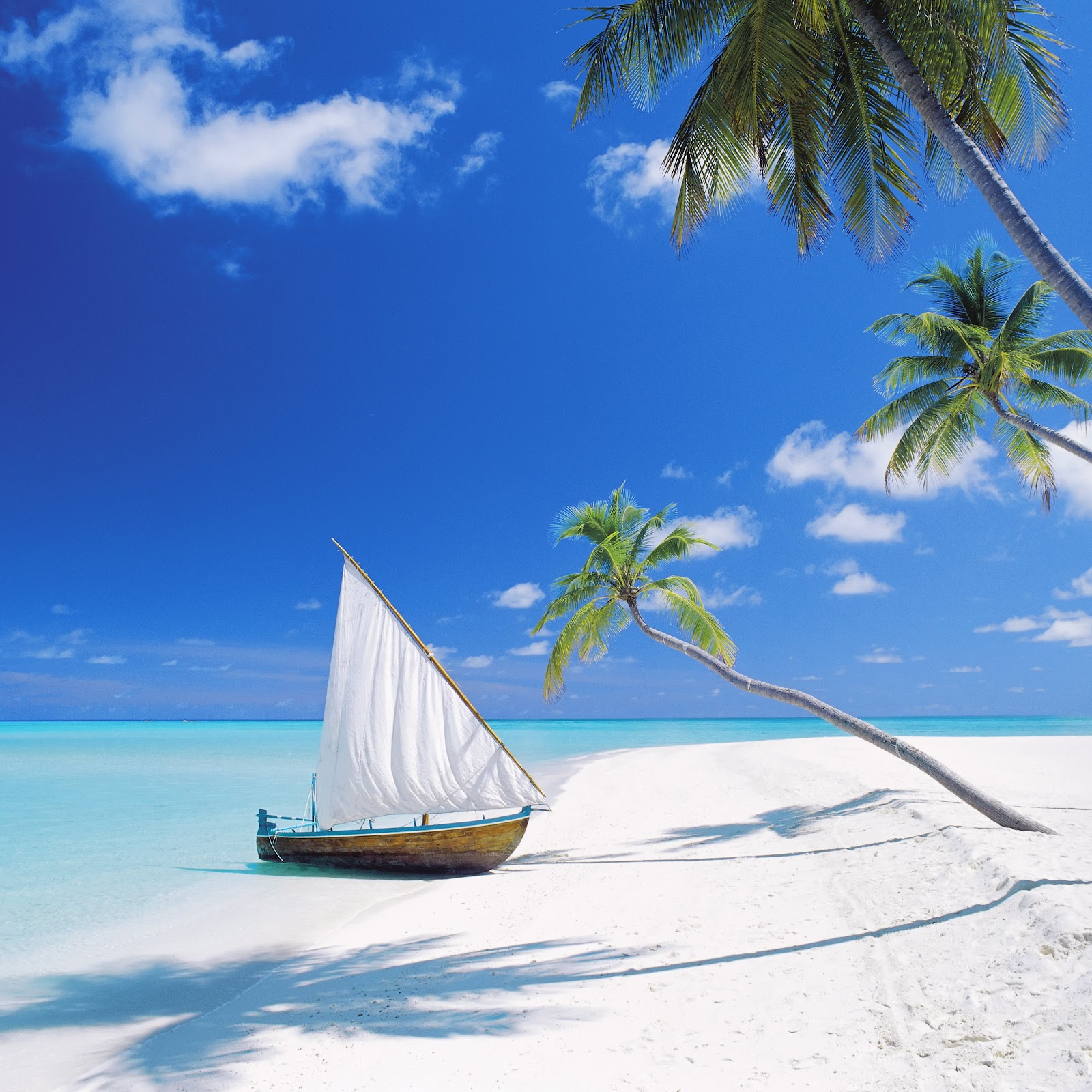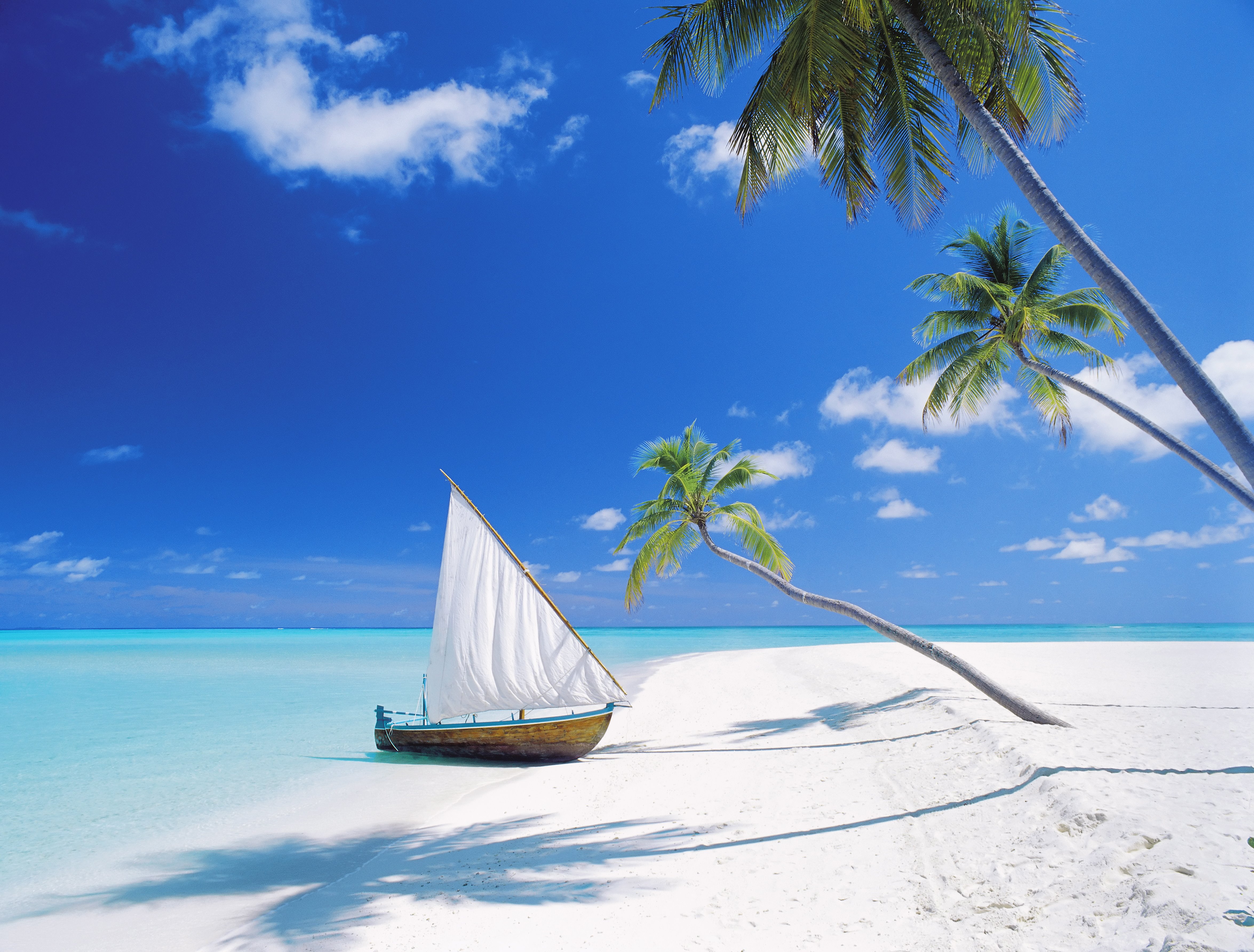Tropical Beach, Sailboat, Palm Trees, Exotic Destination 4K Desktop and Mobile Wallpaper Background with a maximum resolution of 4701x3568 px.