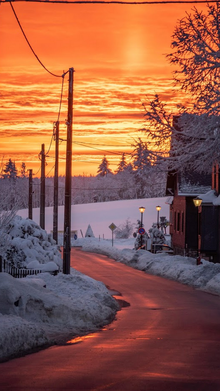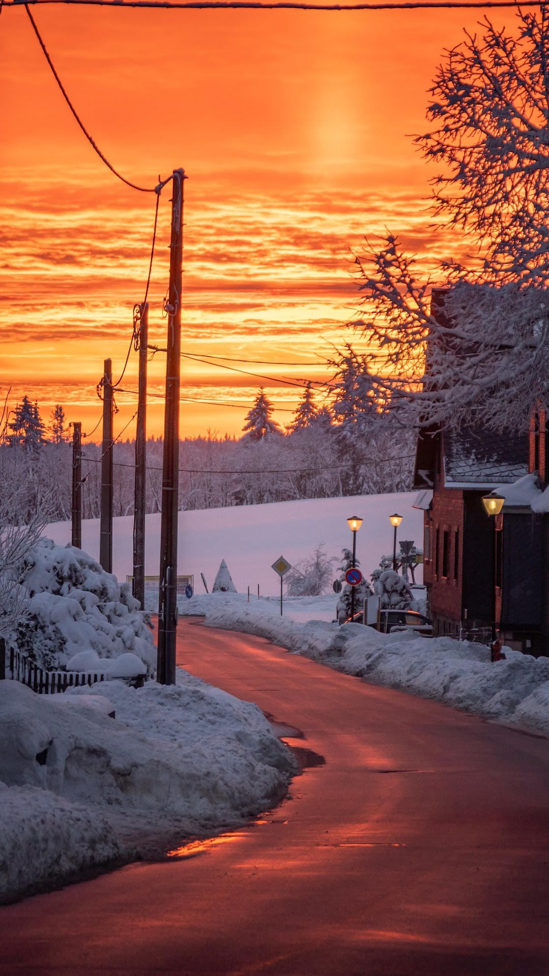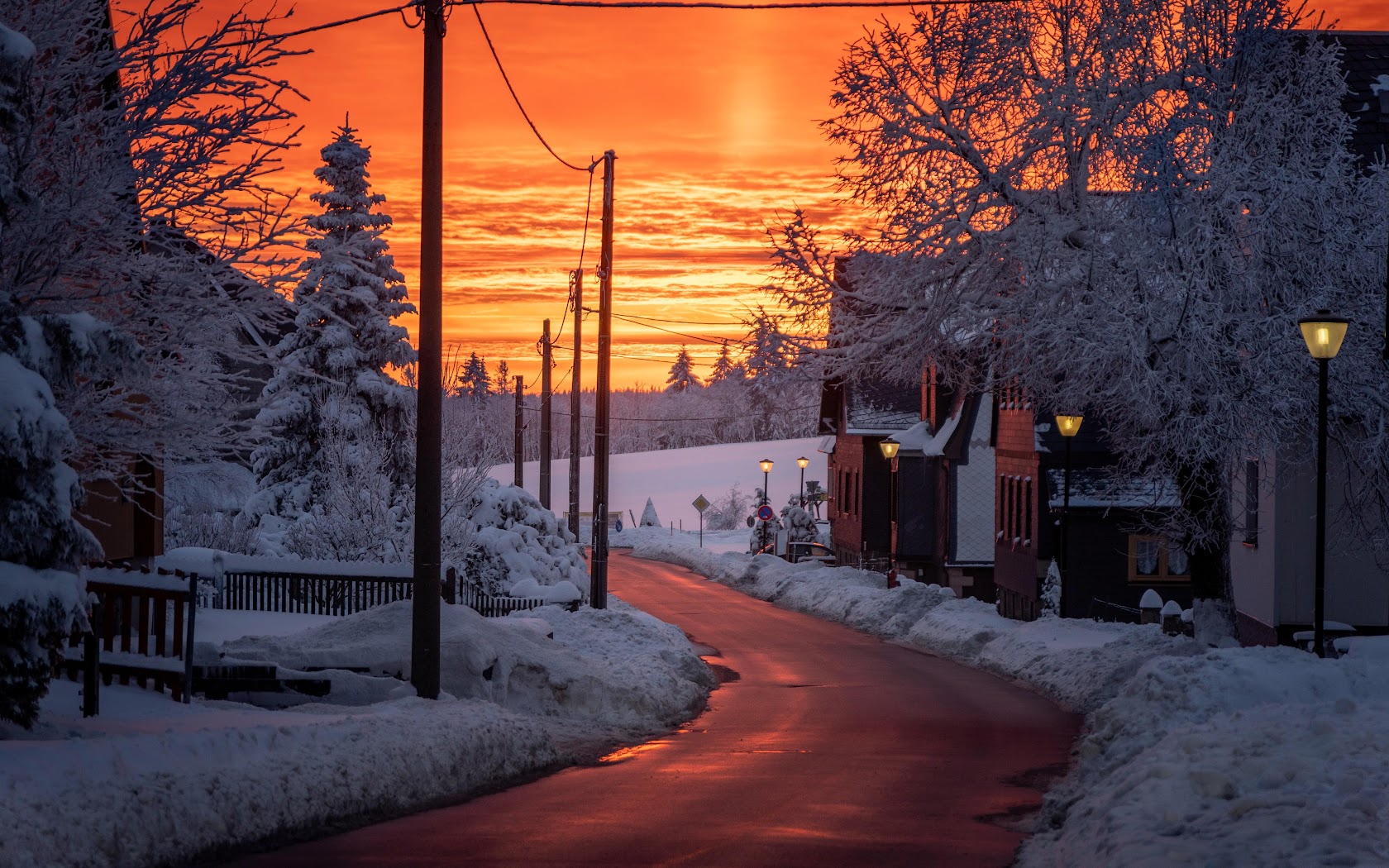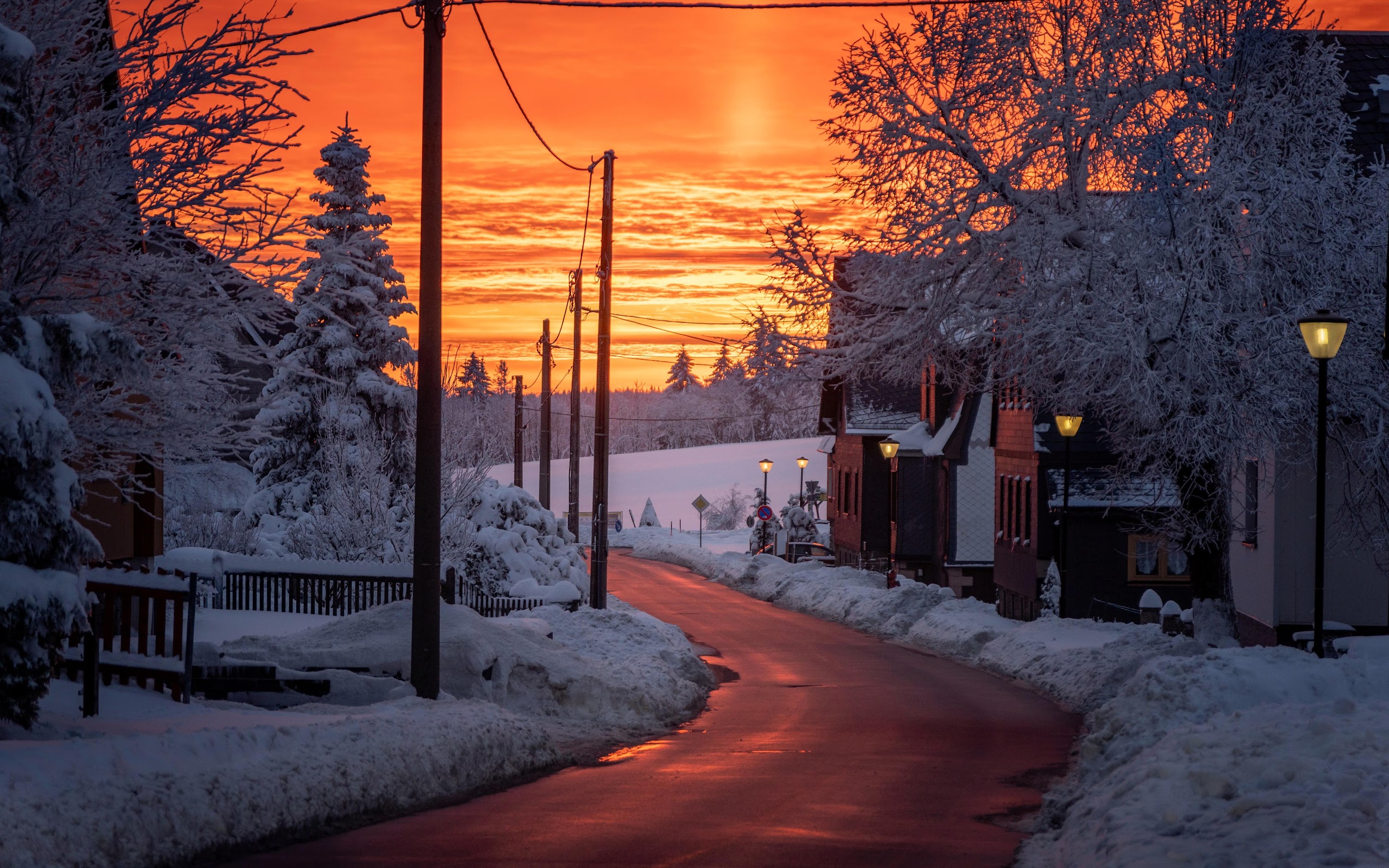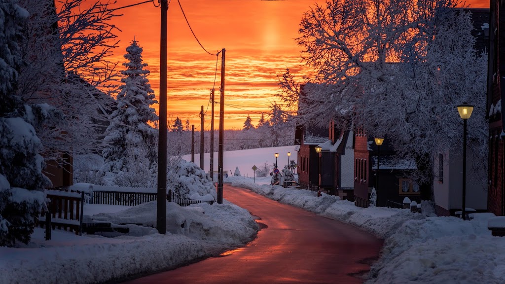 Winter Landscape, Snowy Village, Sunset Sky, Scenic View 5K Desktop Wallpaper