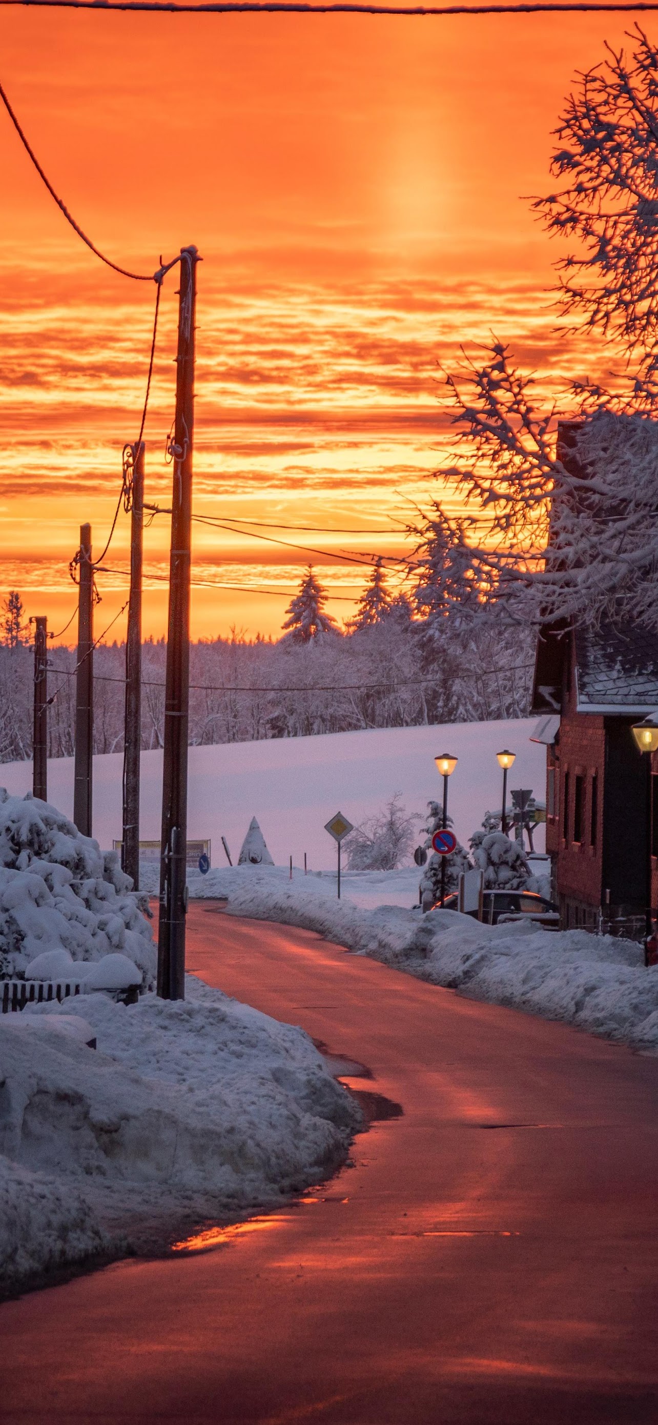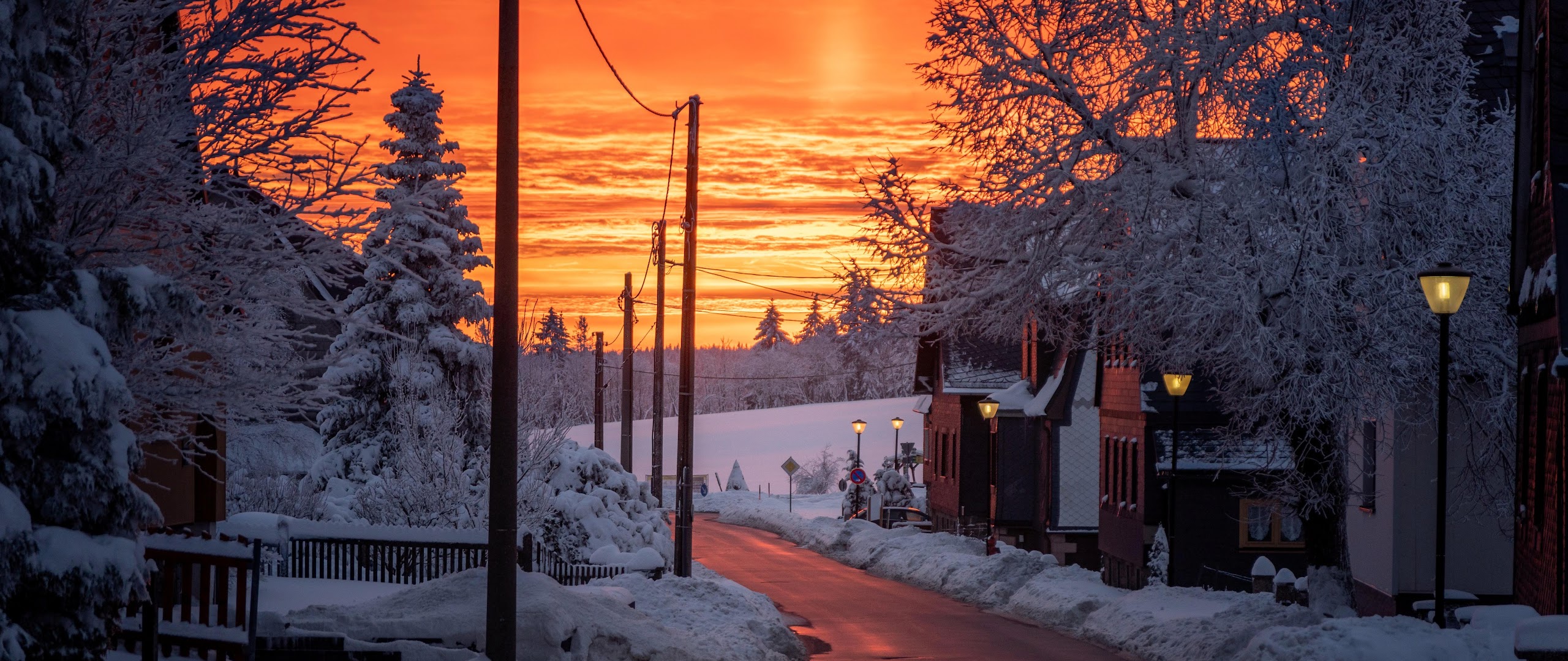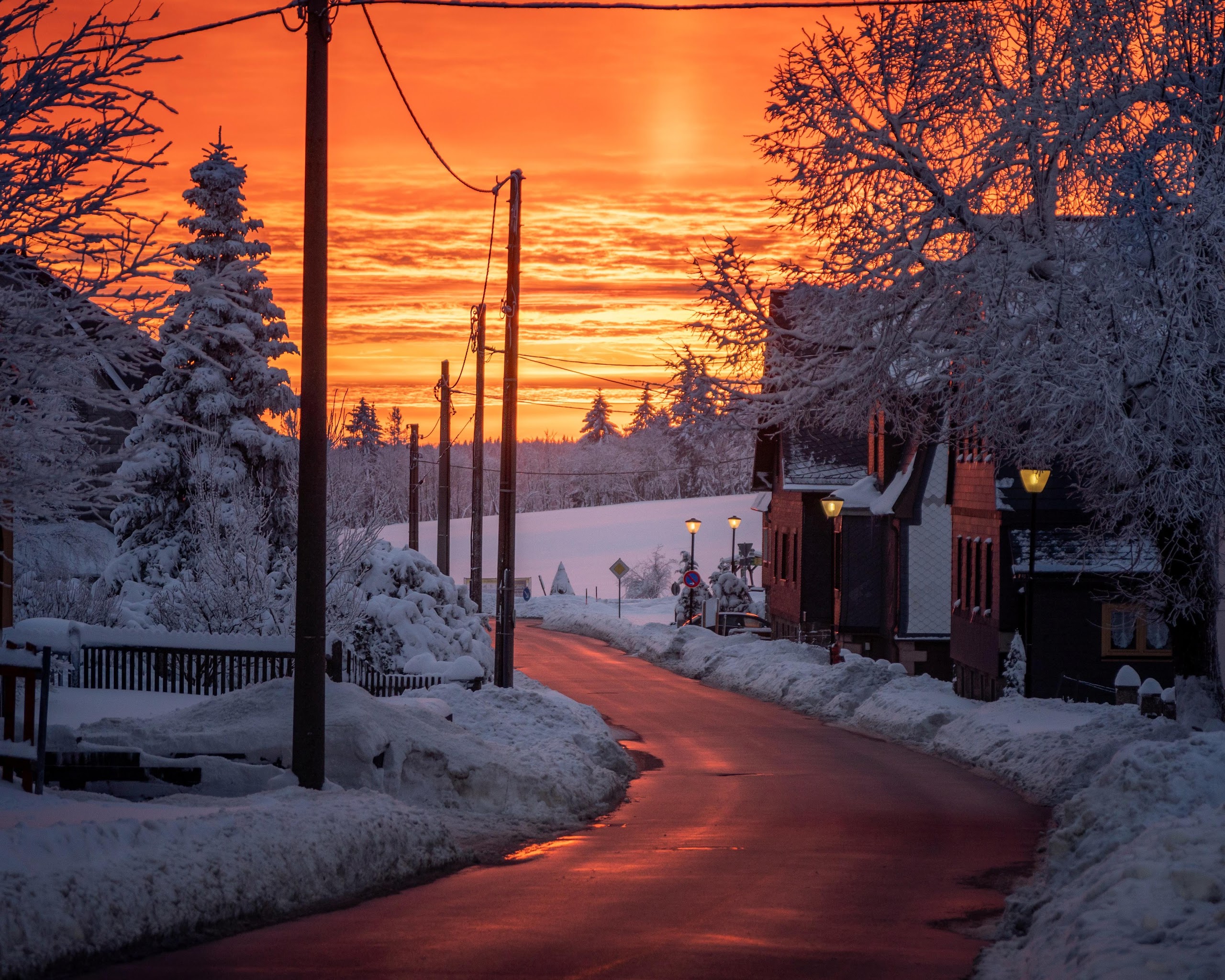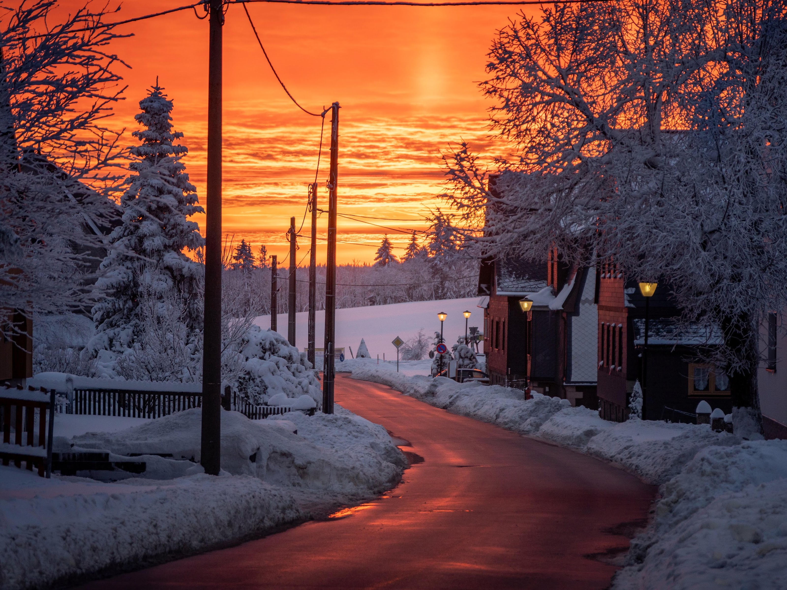 Winter Landscape, Snowy Village, Sunset Sky, Scenic View 5K Desktop and Mobile Wallpaper Background with a maximum resolution of 6000x3491 px.