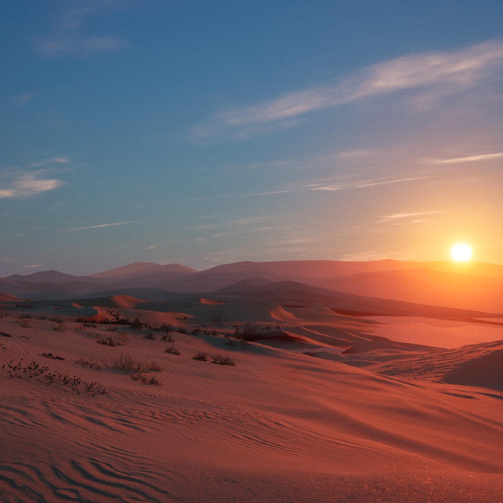 Desert Landscape, Sunrise, Sand Dunes, Arid Scenery 2K Desktop Wallpaper