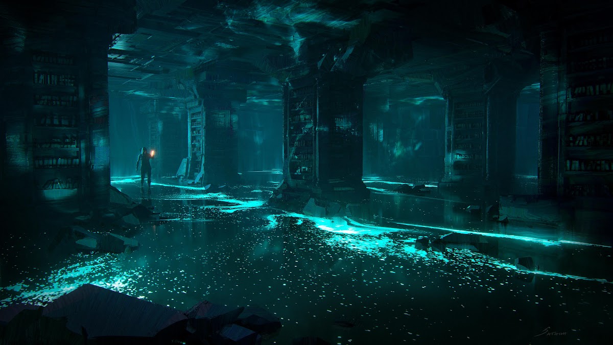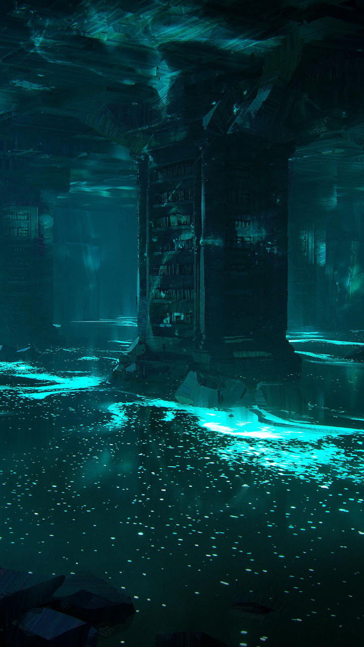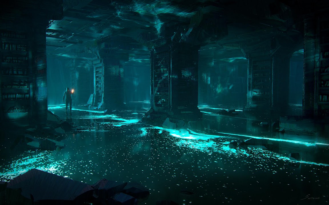 Flooded Library, Fantasy Art, Underground, Ruins 4K Desktop Wallpaper