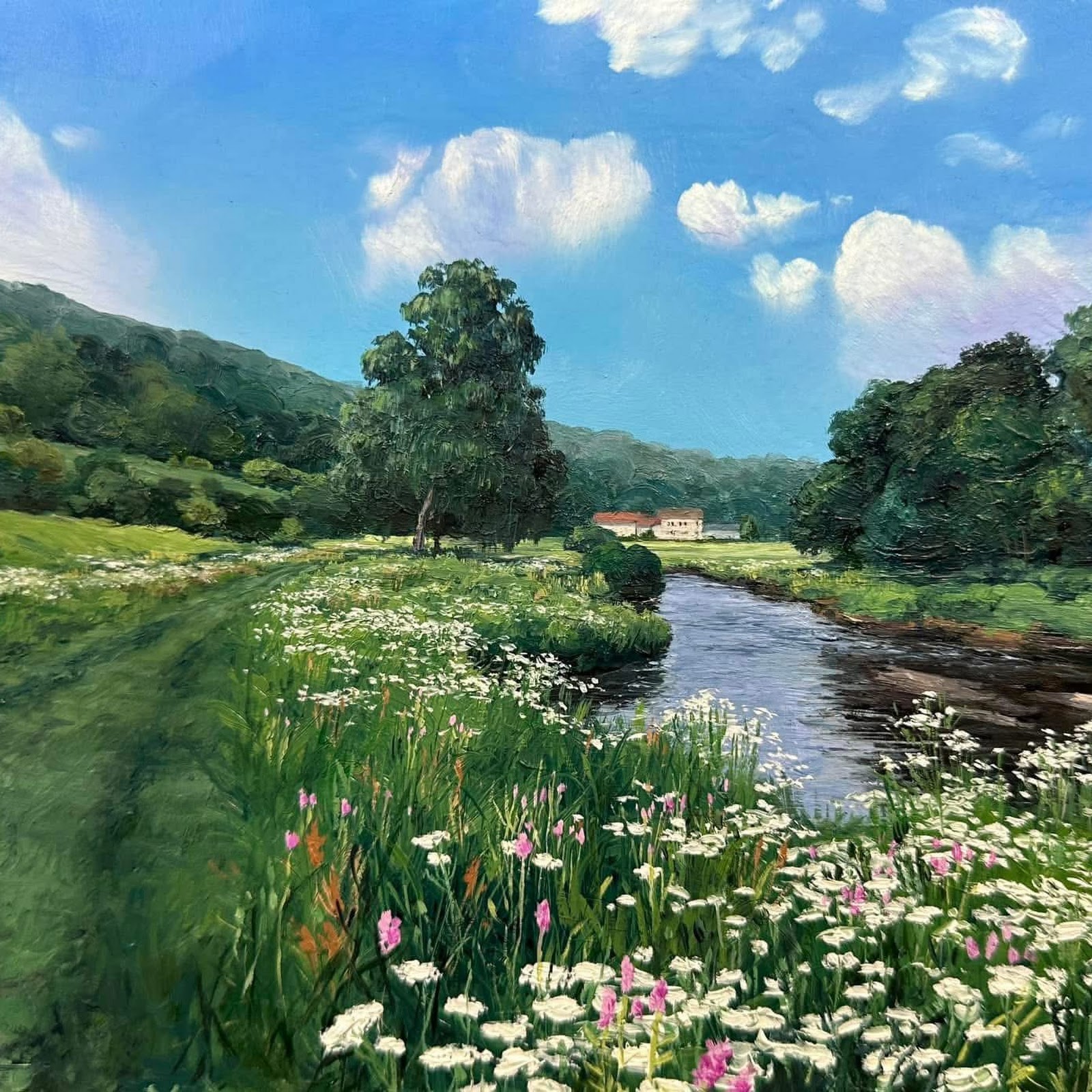 Landscape Painting, Oil On Canvas, River Scenery, Floral Meadow Full HD Desktop and Mobile Wallpaper Background with a maximum resolution of 2048x1390 px.