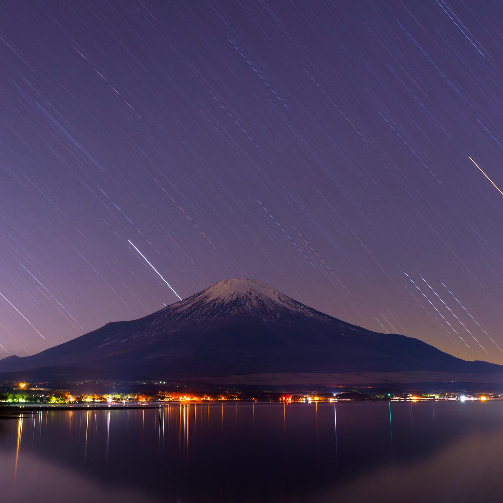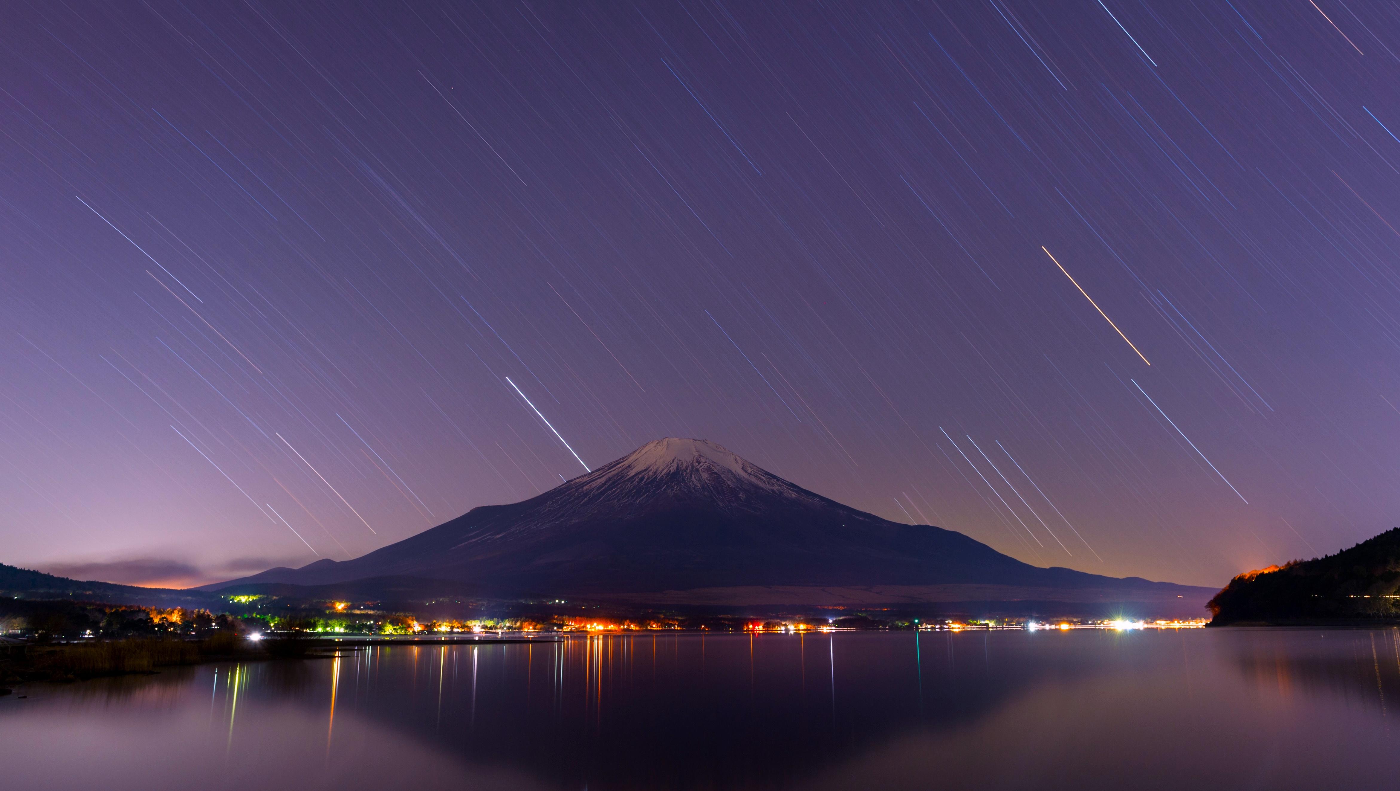 Mount Fuji, Star Trails, Night Photography, Lake Scenery 4K Desktop and Mobile Wallpaper Background with a maximum resolution of 4684x2646 px.