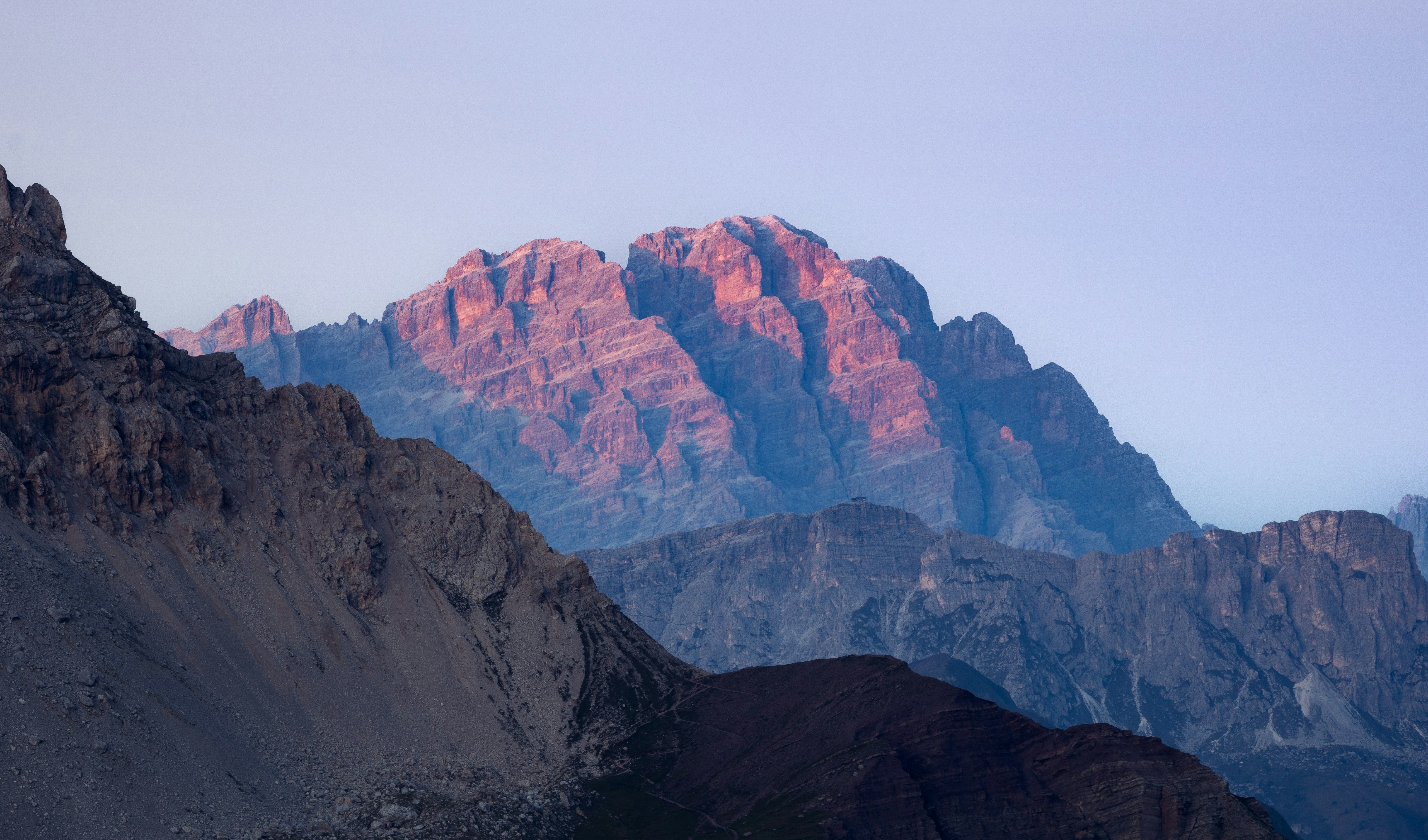 Mountain Range, Dolomites, Mountain Peak, Sunrise 5K Desktop and Mobile Wallpaper Background with a maximum resolution of 5122x3014 px.
