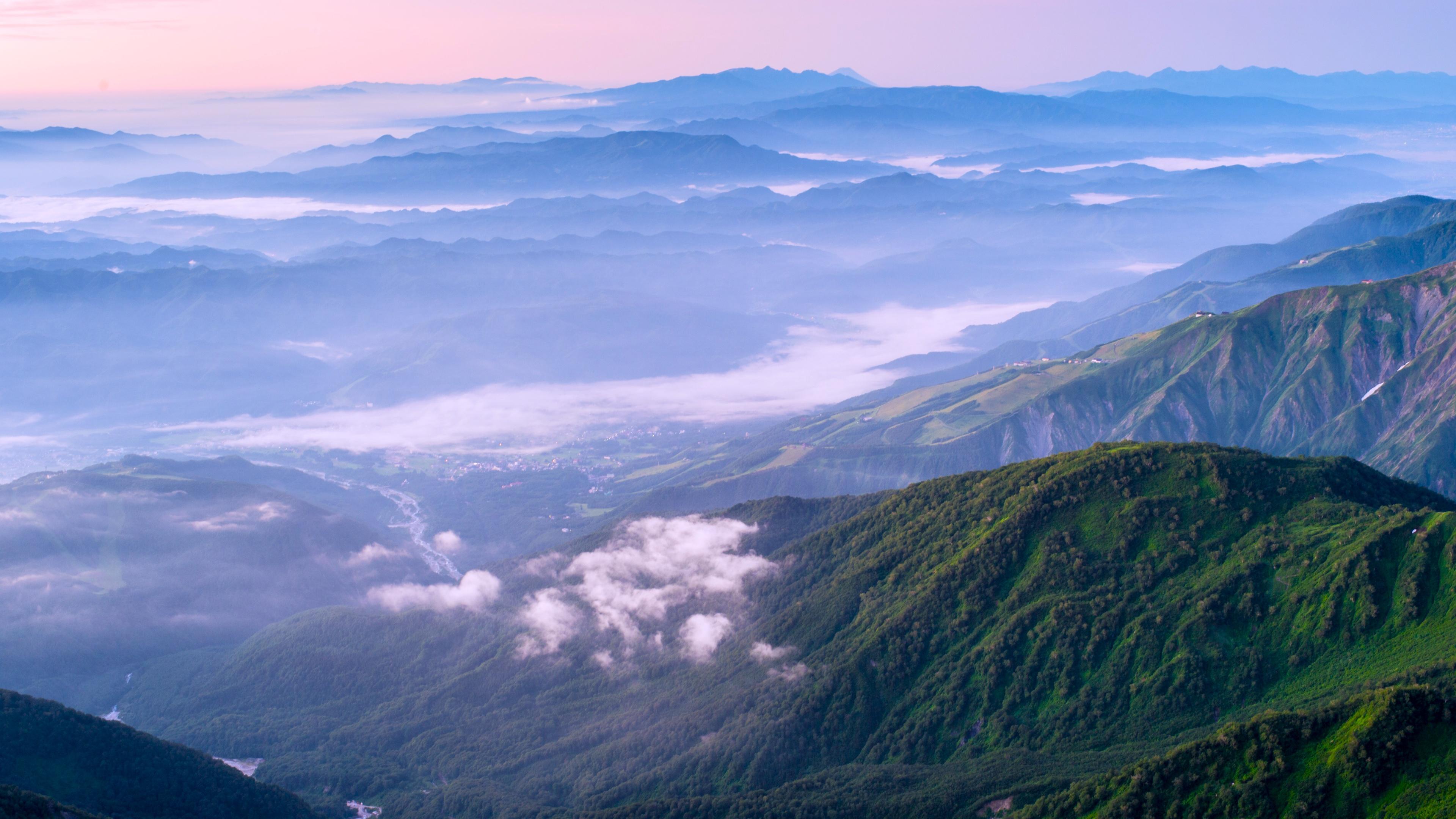 Mountain Range, Scenic Landscape, Fog, Aerial View 4K Desktop and Mobile Wallpaper Background with a maximum resolution of 3840x2160 px.