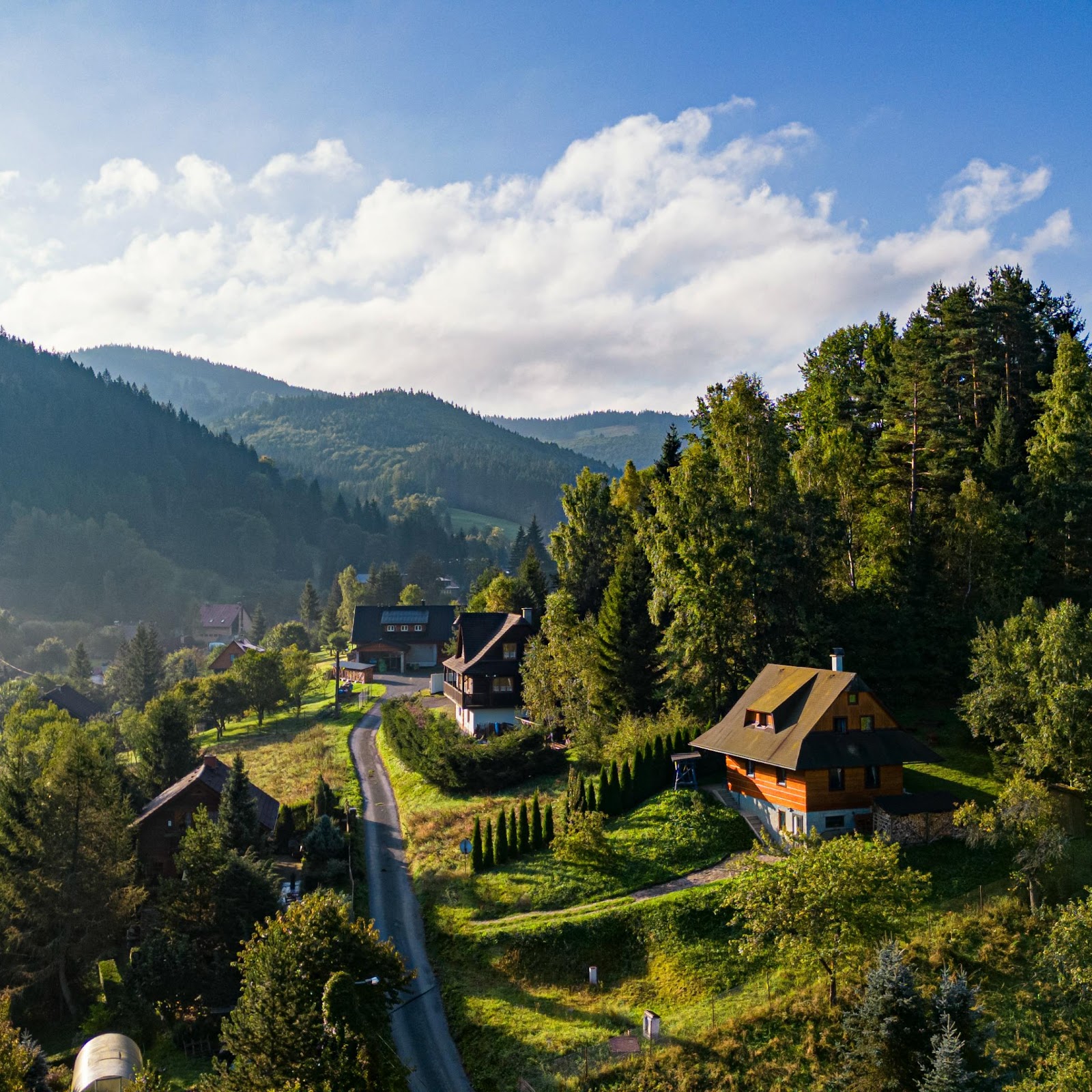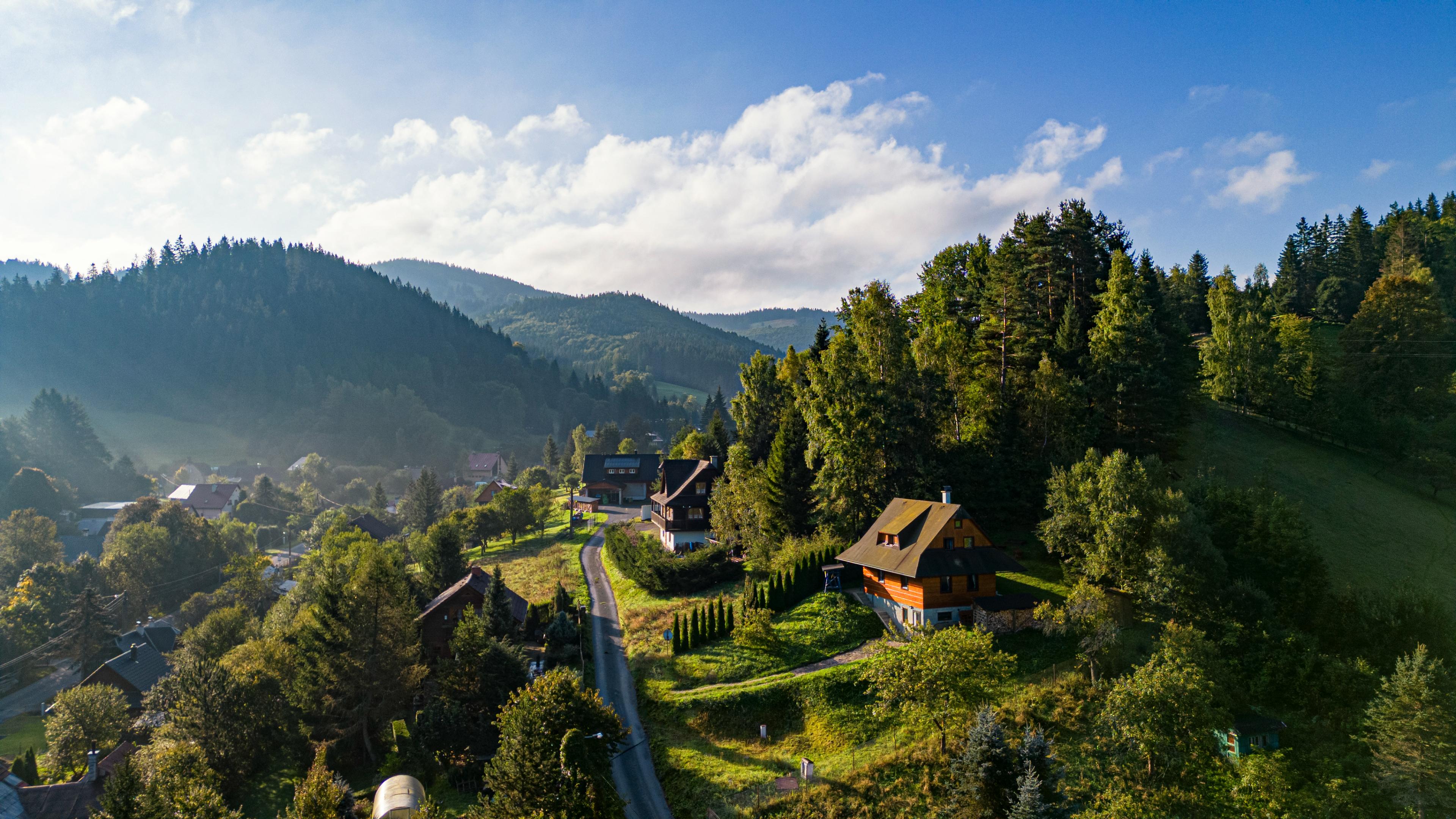 Mountain Village, Forest Landscape, Rural Scenery, Aerial View 4K Desktop and Mobile Wallpaper Background with a maximum resolution of 3840x2160 px.
