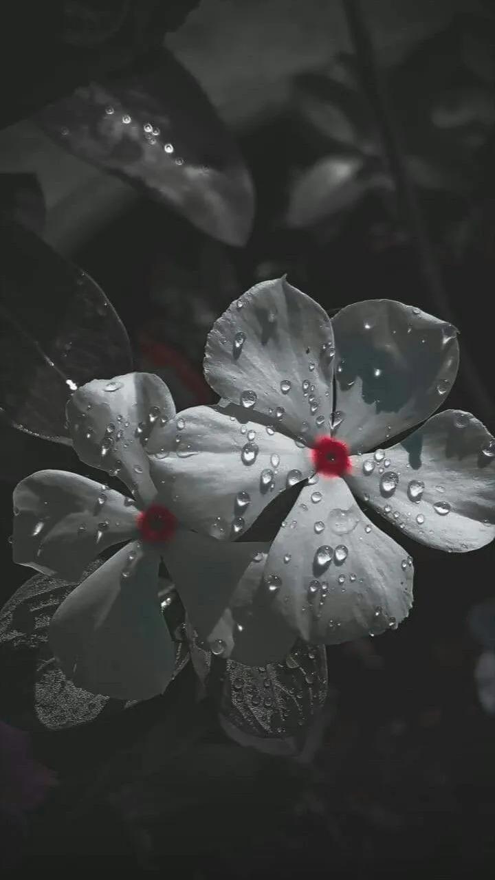 Periwinkle Flower, Water Droplets, Floral Close-Up, Monochrome Photography iPhone Wallpaper Background with a maximum resolution of 720x1280 px.