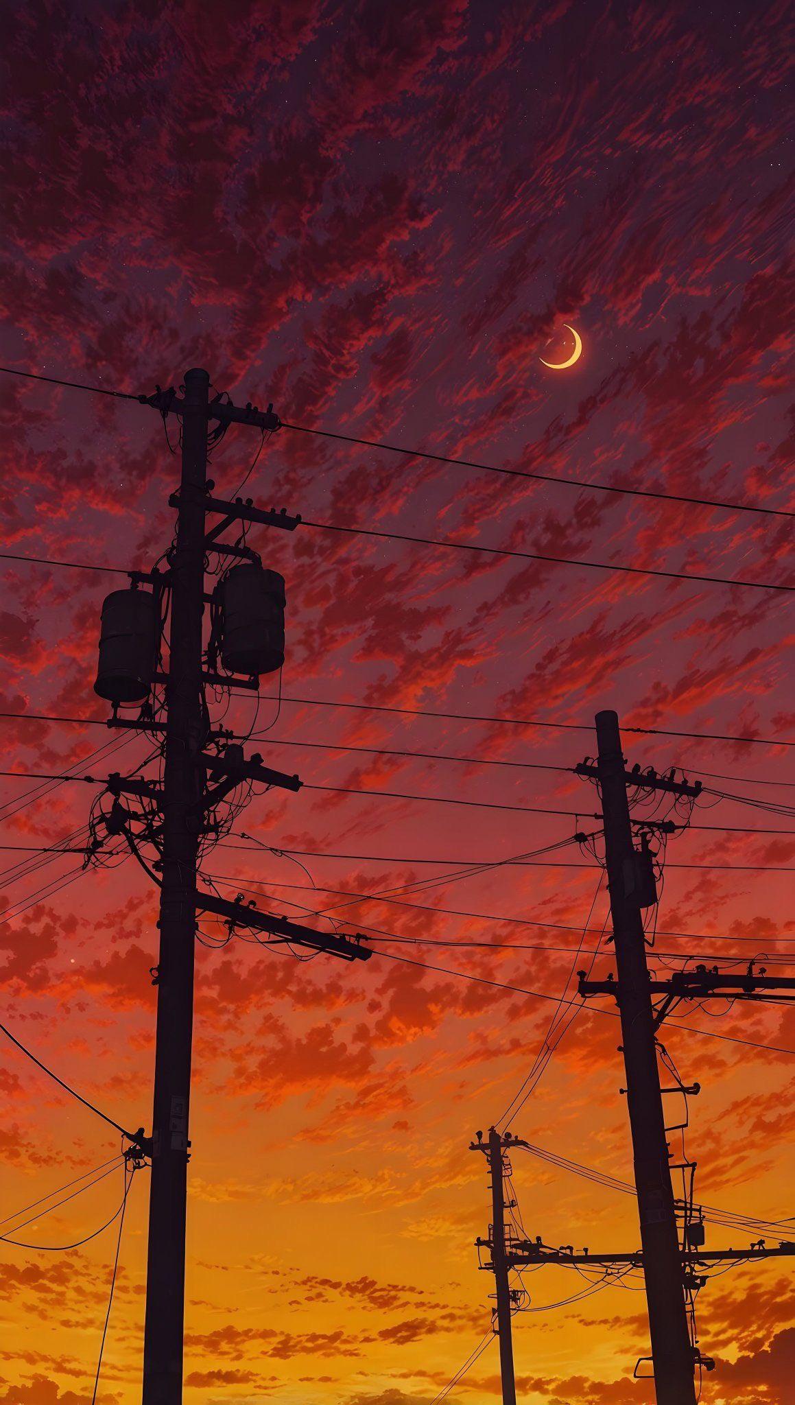 Sunset, Sky, Moon, Powerlines Full HD iPhone Phone Wallpaper