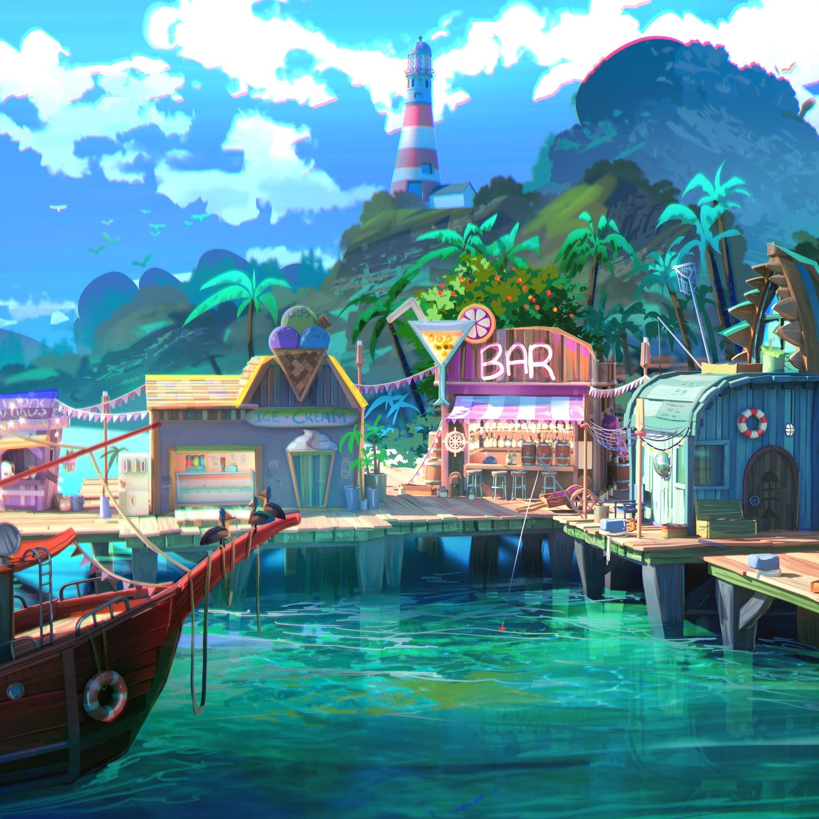 Tropical Island, Seaside Town, Coastal Illustration, Cartoon Landscape 4K Desktop Wallpaper