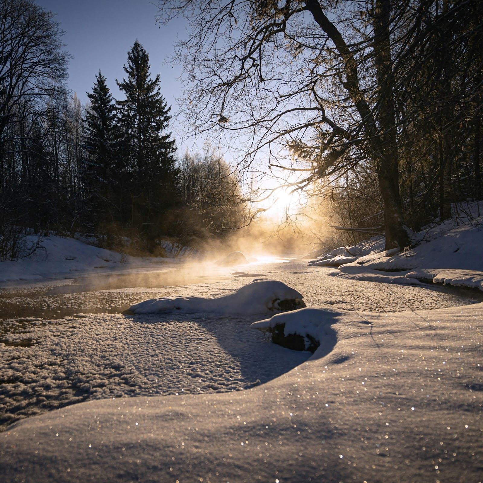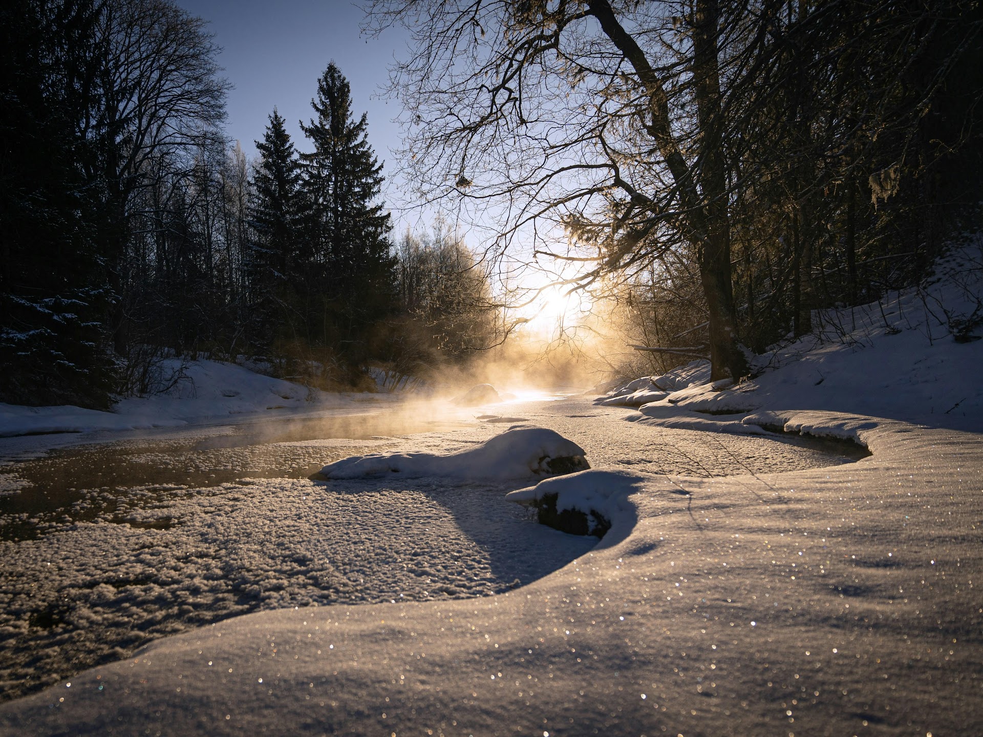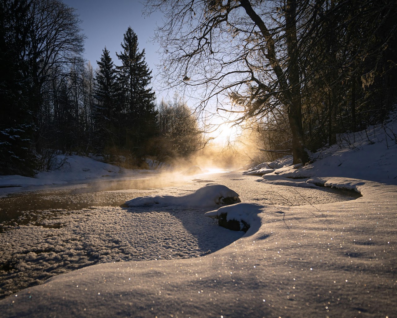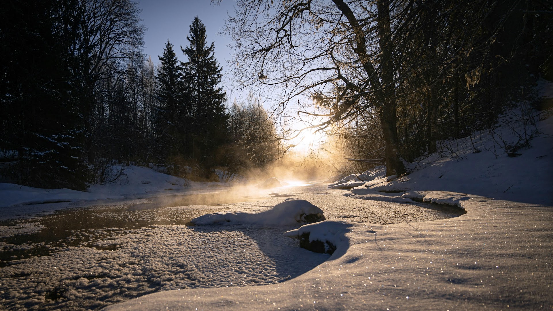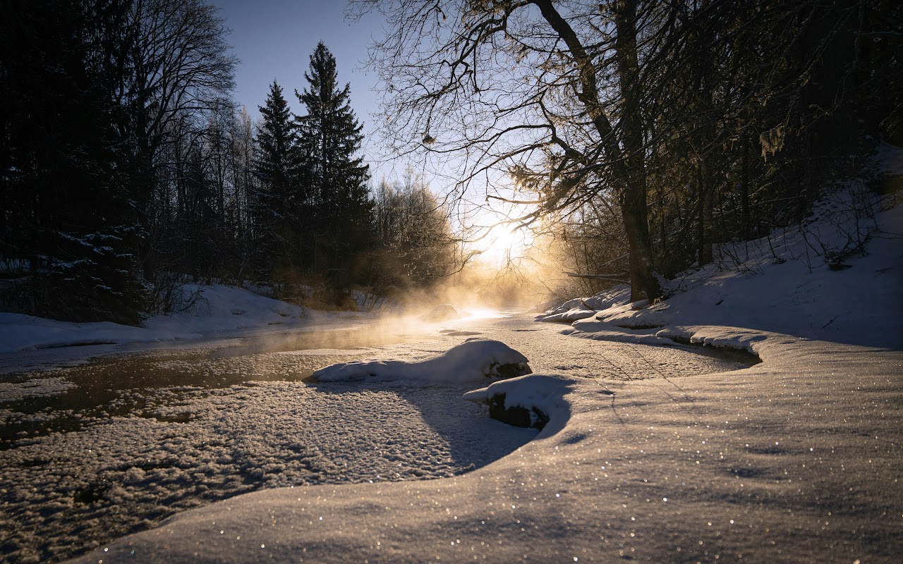 Winter Landscape, Frozen River, Misty Scenery, Cold Weather 4K Desktop Wallpaper
