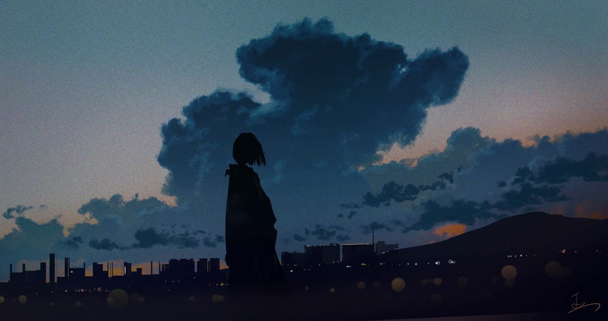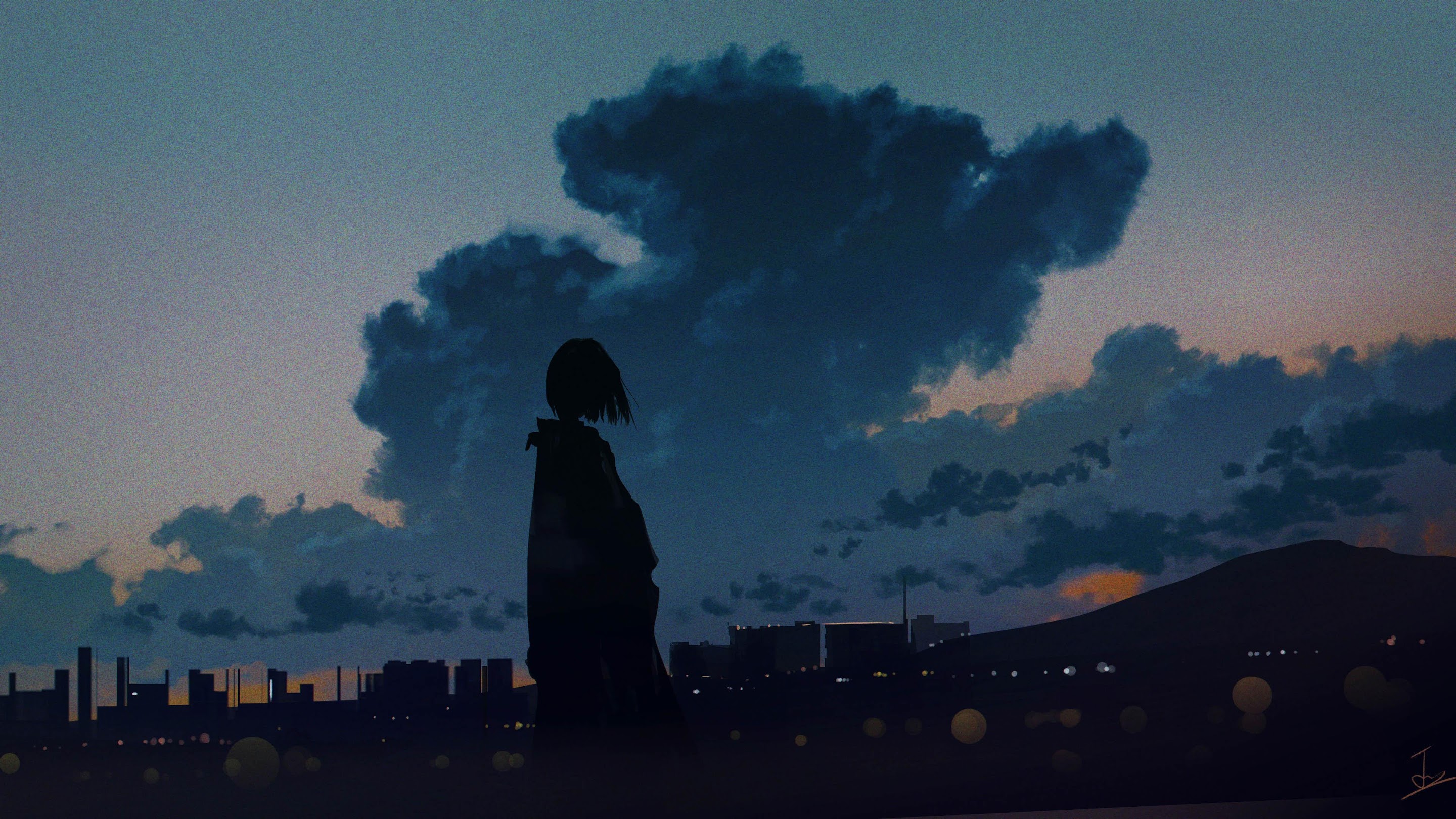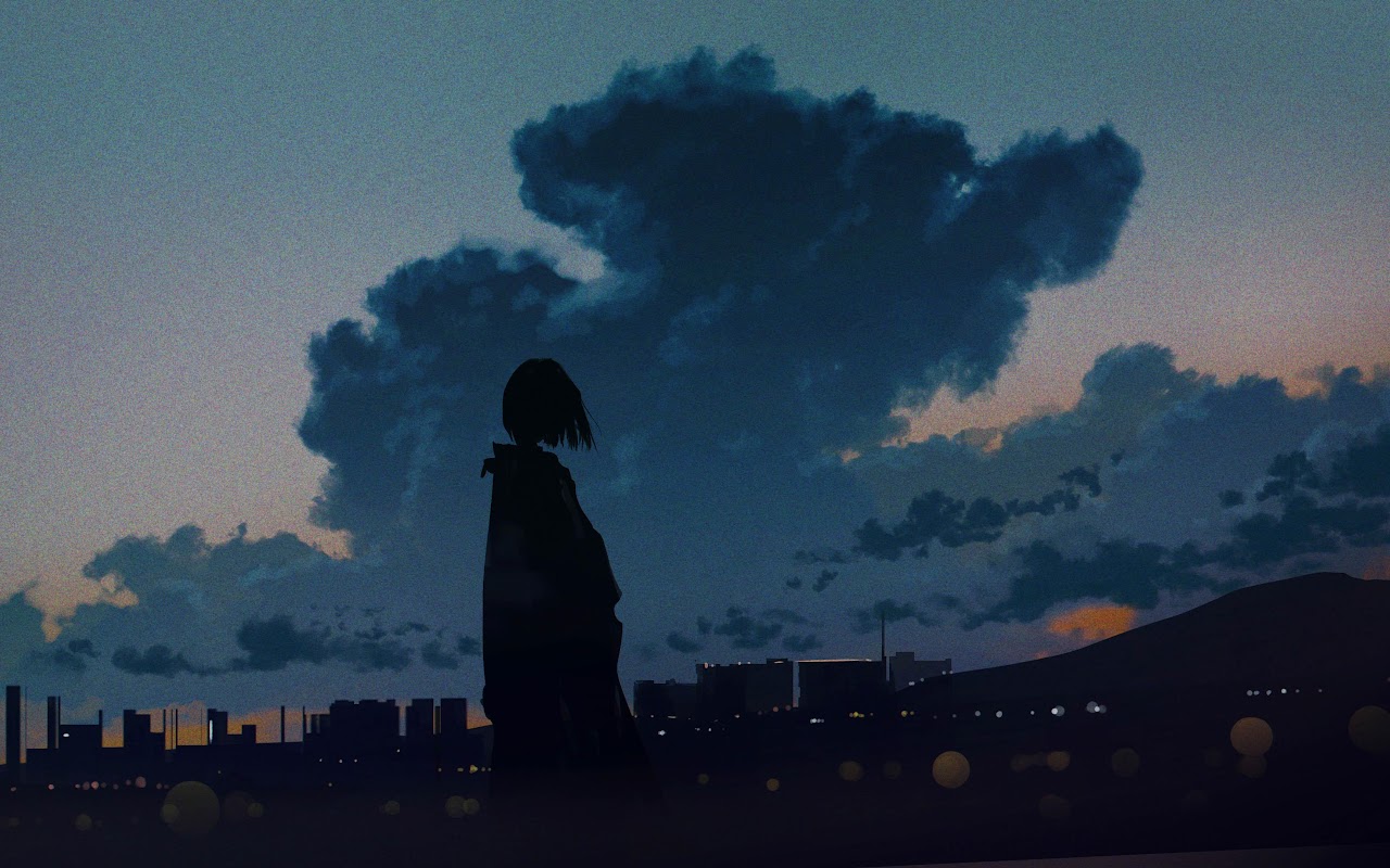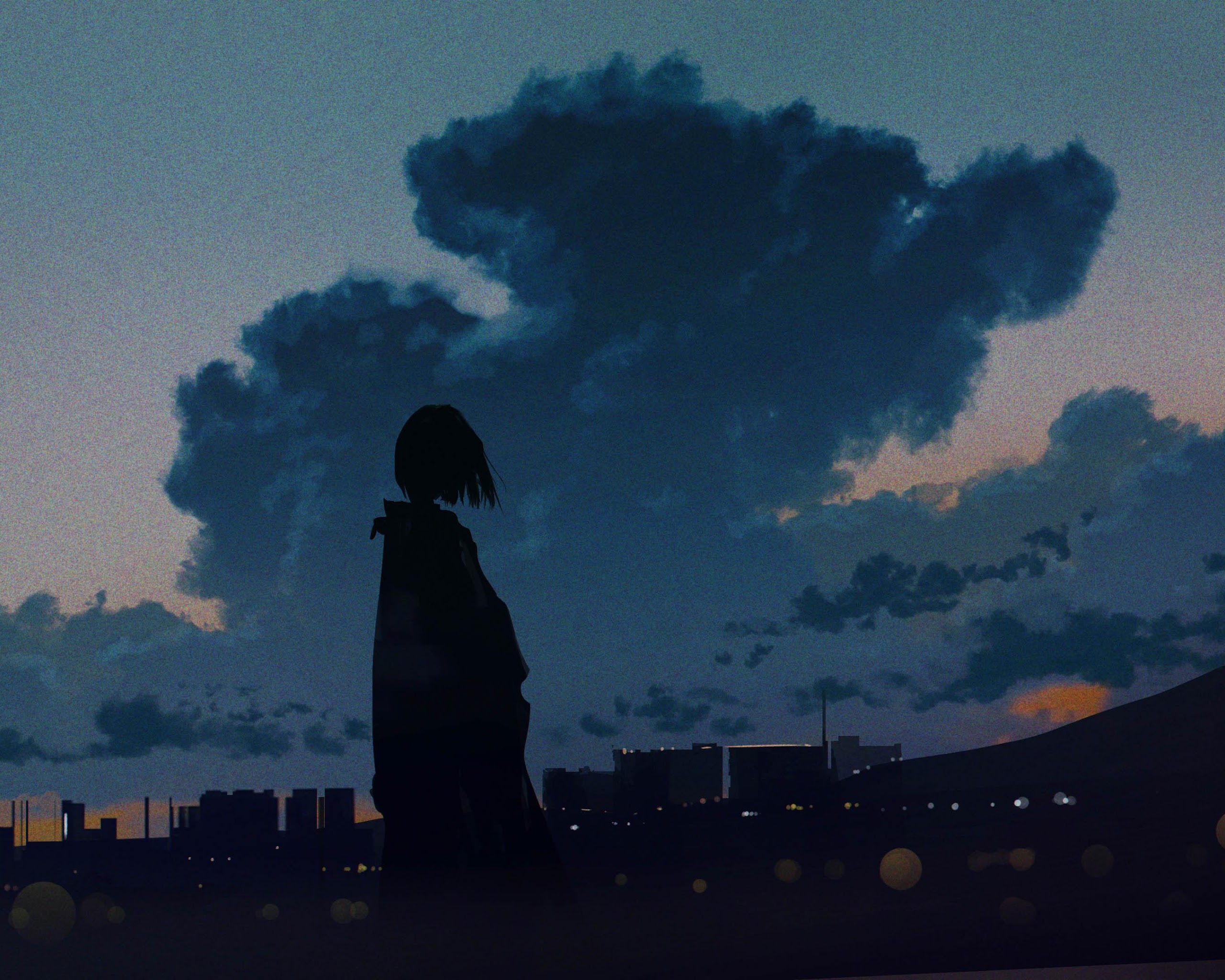 Anime Art, Twilight Sky, Cityscape Silhouette, Moody Aesthetic 4K Desktop Wallpaper