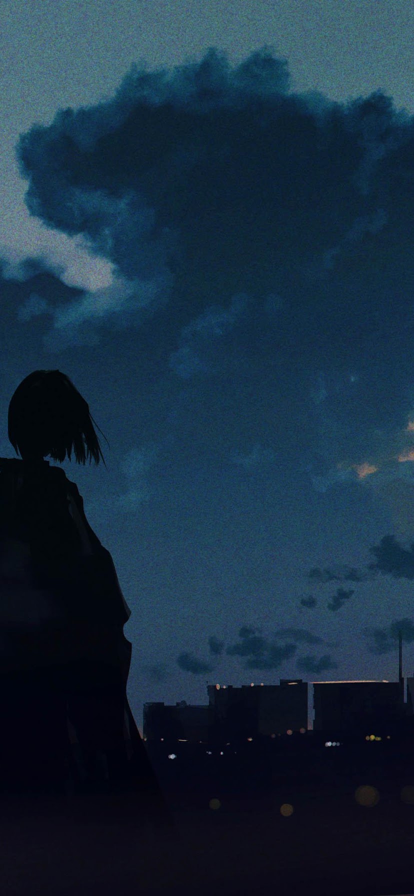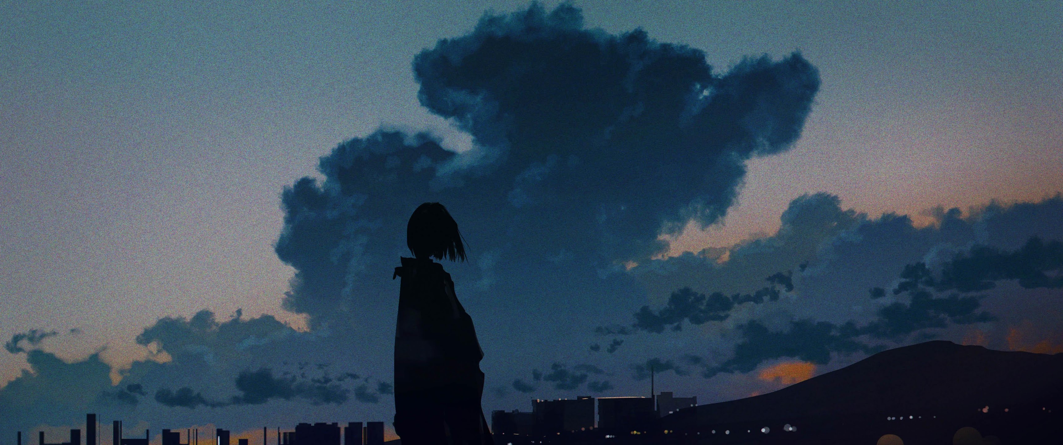 Anime Art, Twilight Sky, Cityscape Silhouette, Moody Aesthetic 4K Desktop and Mobile Wallpaper Background with a maximum resolution of 4096x2160 px.