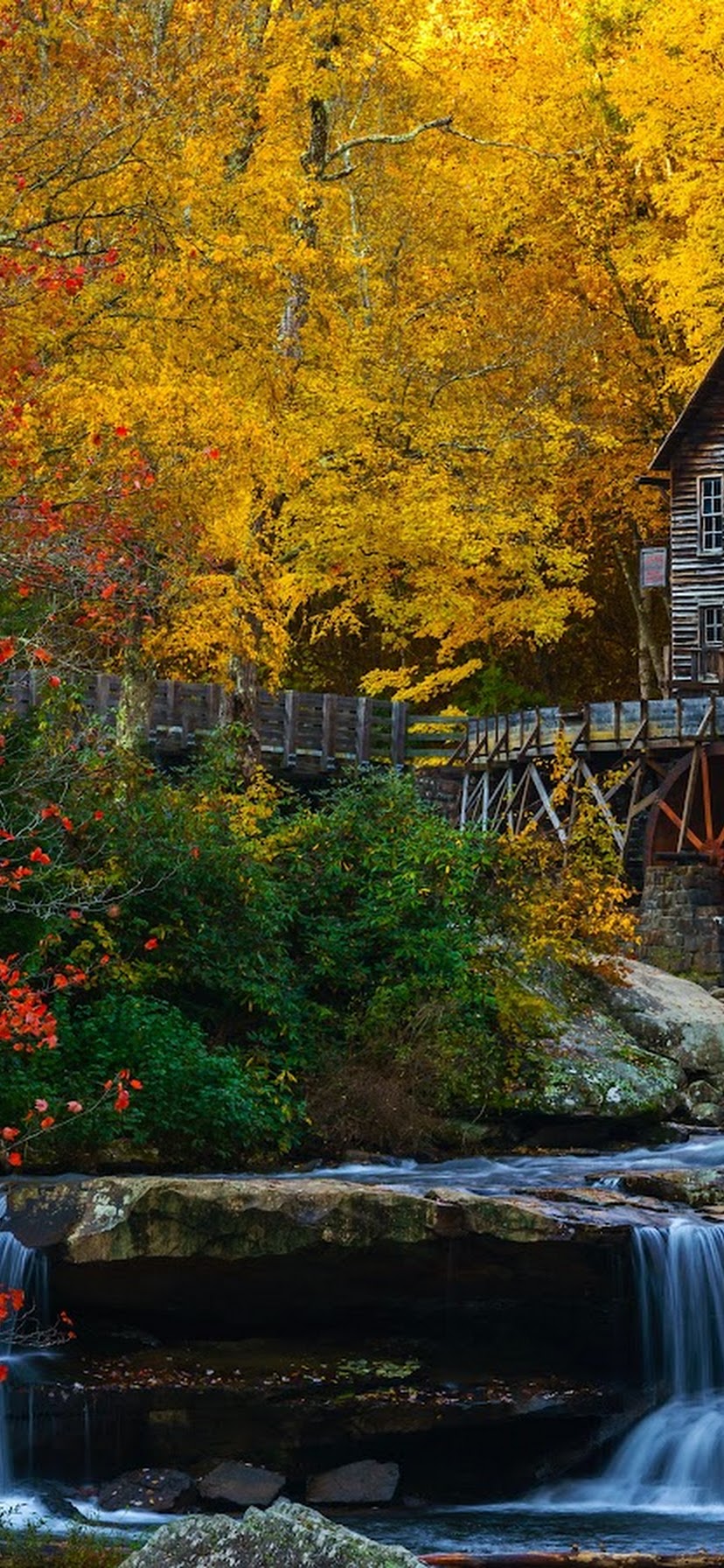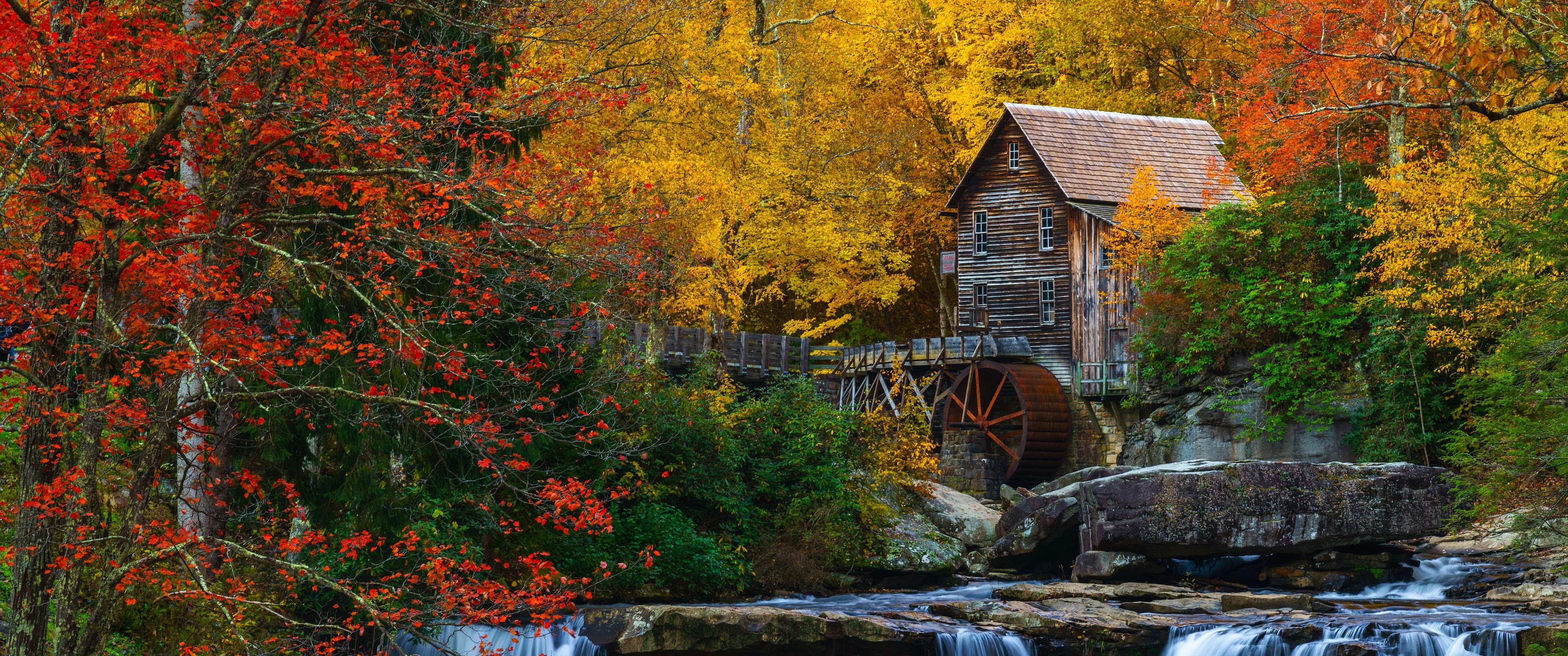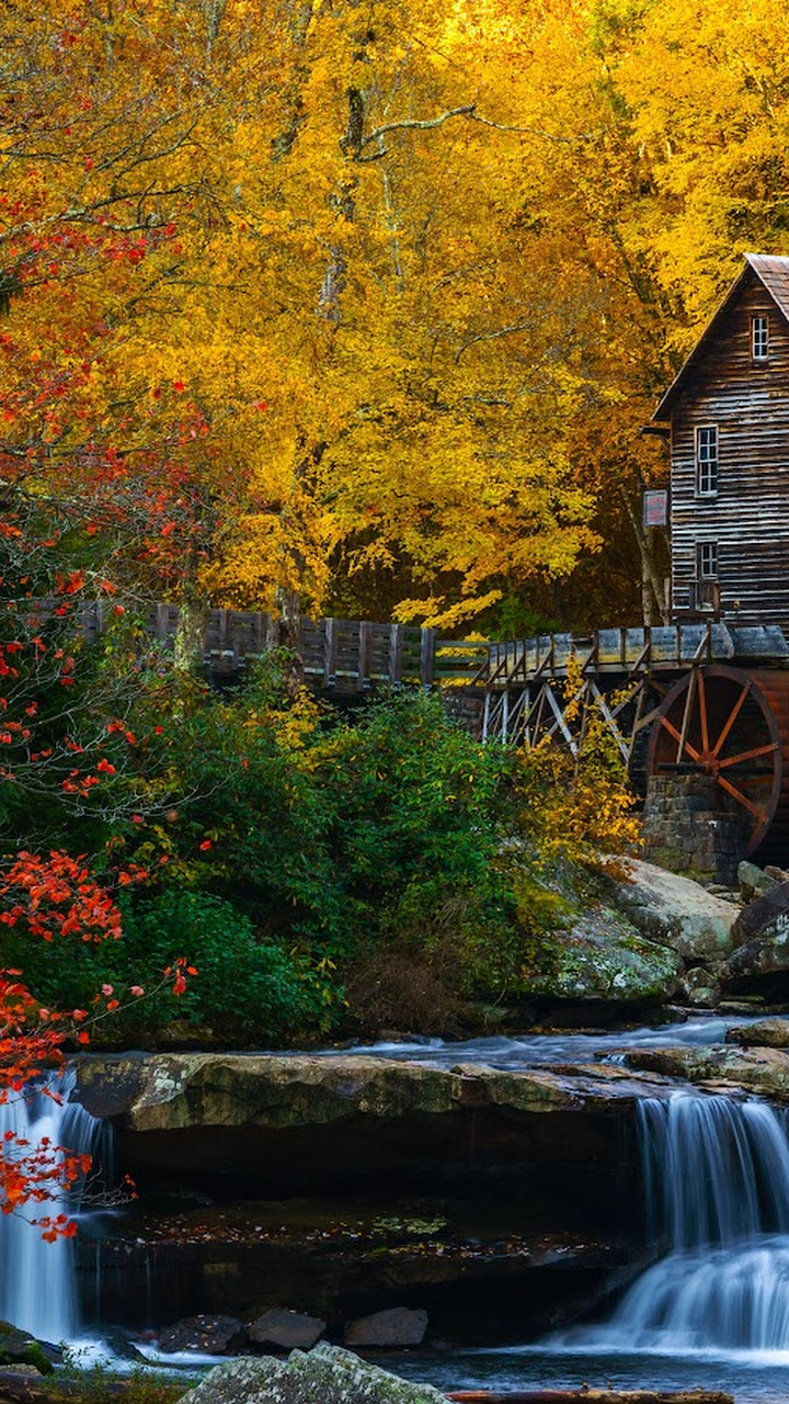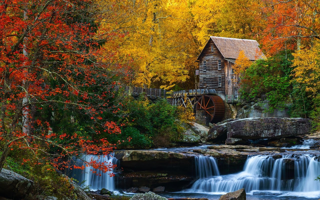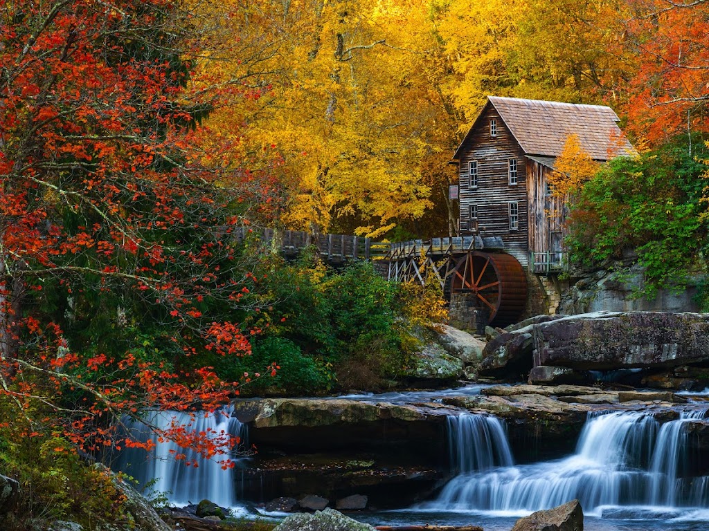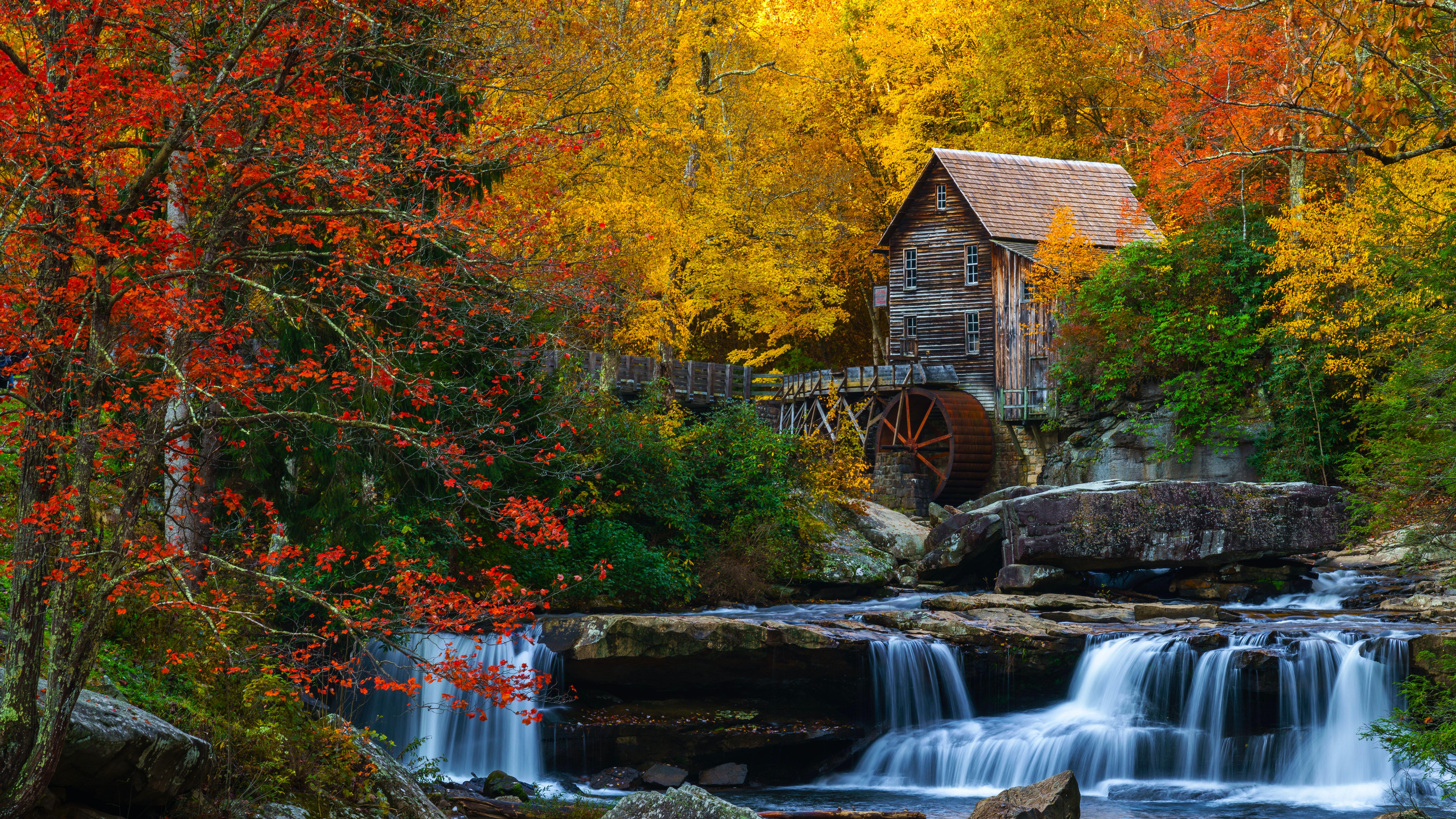 Autumn Scenery, Waterfall, Grist Mill, Glade Creek 5K Desktop Wallpaper