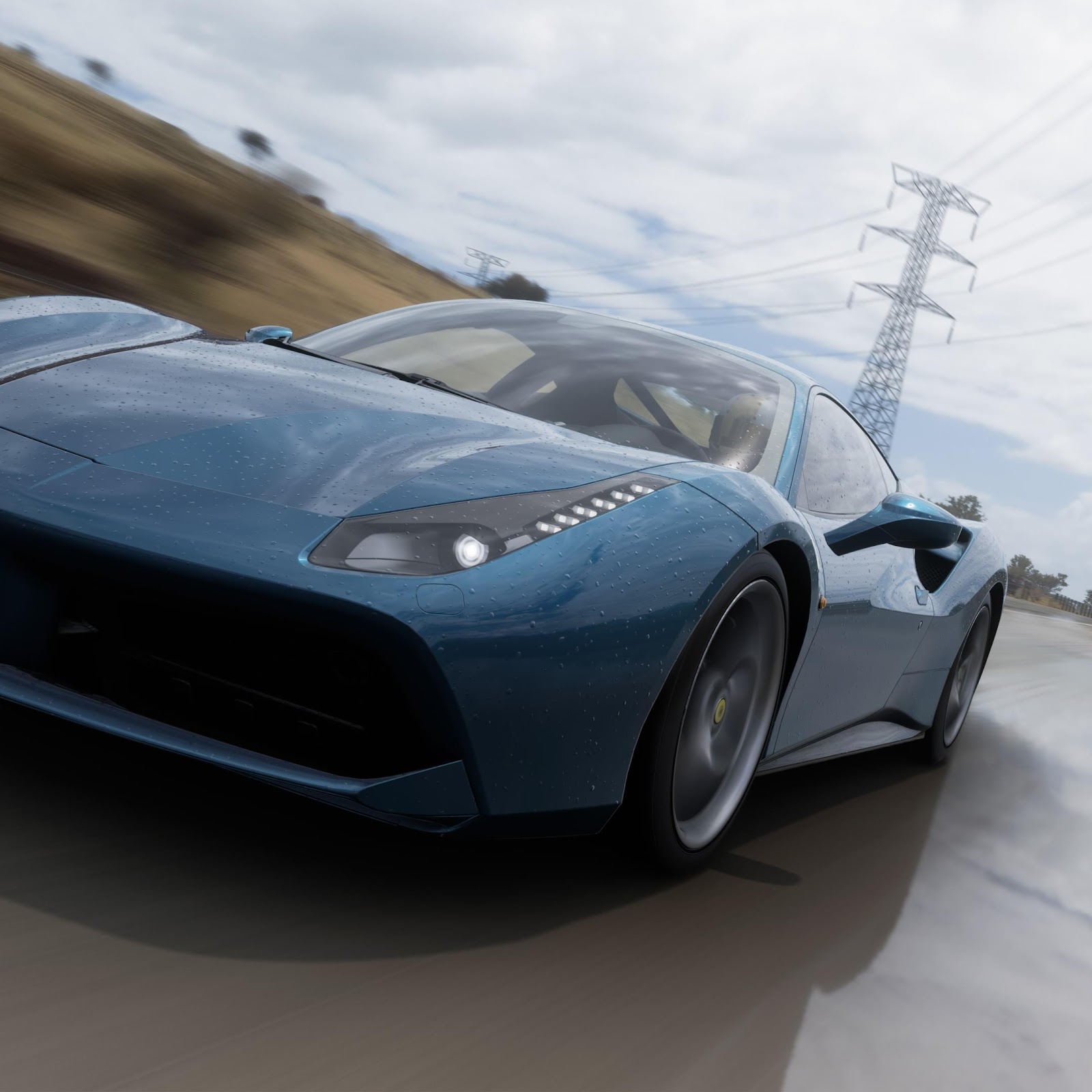 A blue Ferrari sports car is speeding down a wet highway under a cloudy sky with heavy motion blur.