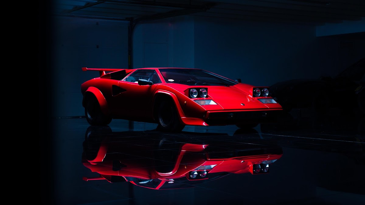 A red Lamborghini Countach sits in a dark, moody garage showing a stunning reflection on the polished black floor.