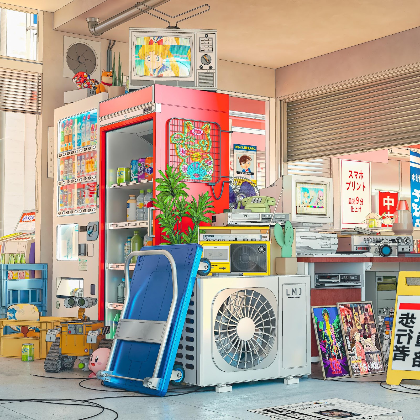 A cluttered Japanese convenience store interior filled with vending machines, old TVs, and retro electronics in a detailed anime style.