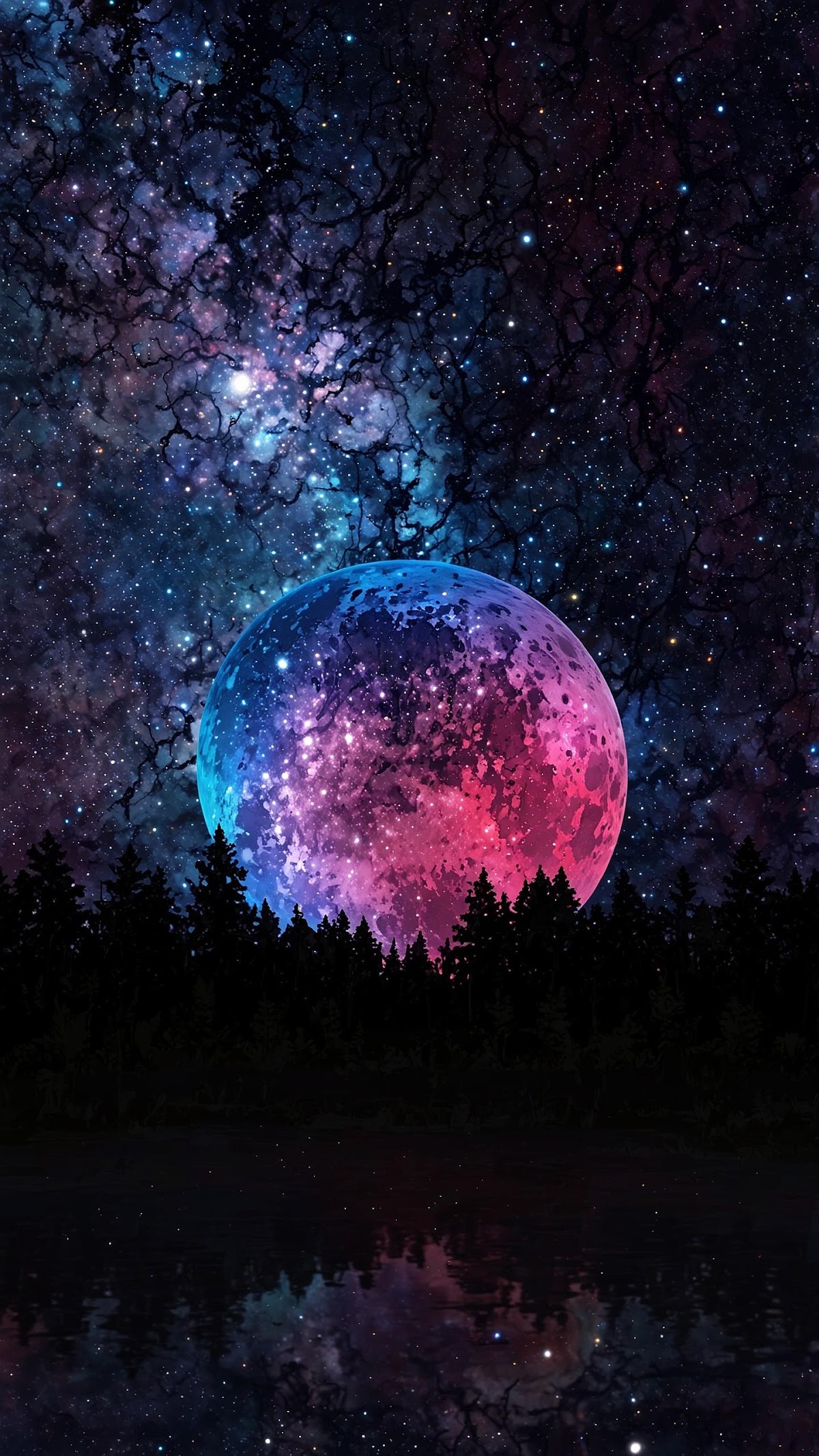 Colorful Moon Over Forest Reflection 2K iPhone Wallpaper A large colorful planet hangs over a dark treeline, showing a stunning reflection in the still water below. he829 433.21 KB 1440x2560 Download original File Size: Dimensions: Resolution: 2K Format: Mobile ID: Black Fantasy Forest Nebula Planet Reflection Space