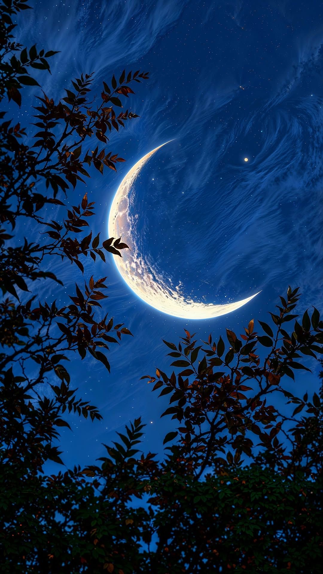 Crescent Moon, Night Sky, Tree Silhouette, Celestial Full HD iPhone Wallpaper Background with a maximum resolution of 1080x1920 px.