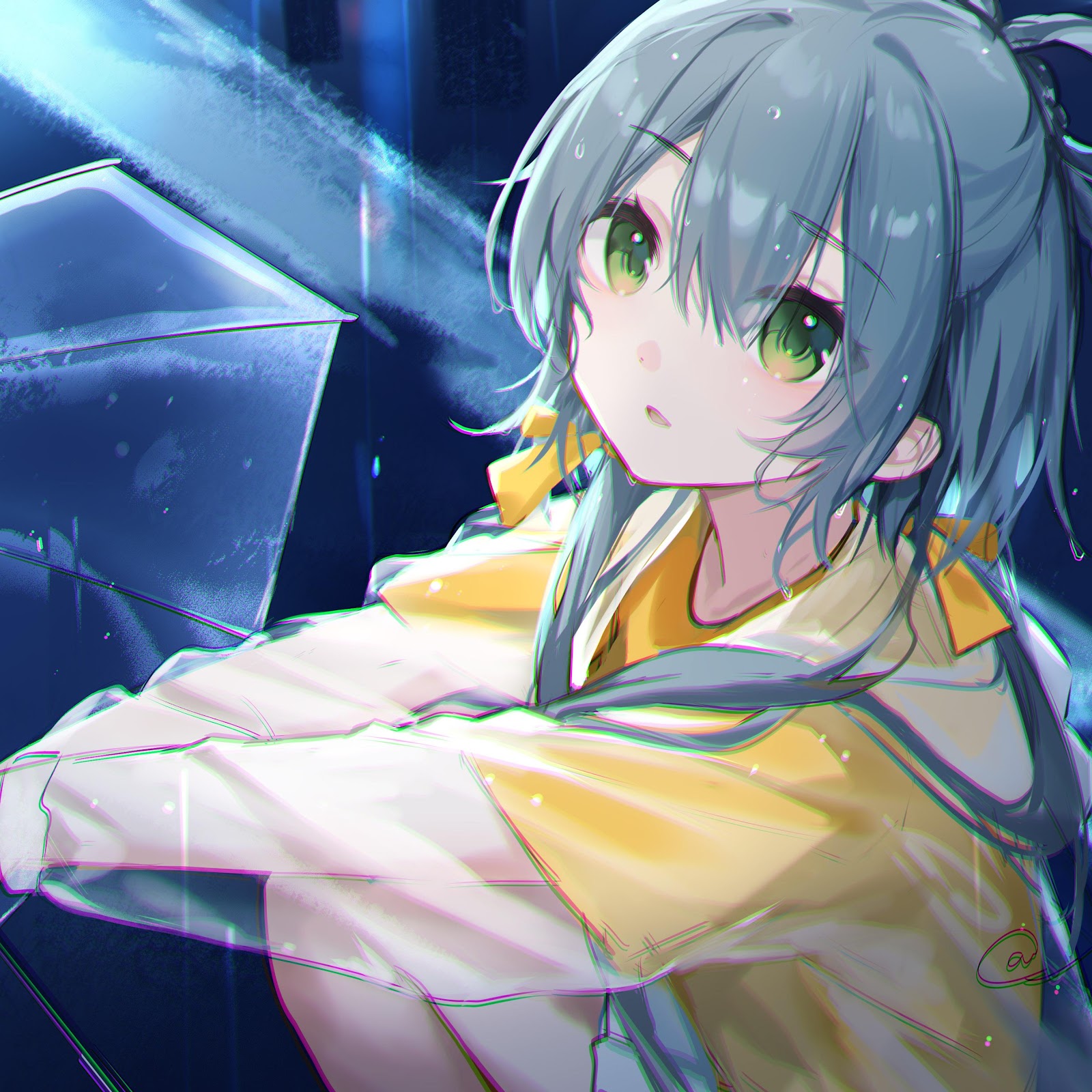 A cute anime girl with green eyes sits under a clear umbrella showing the reflection of a dark blue night city.