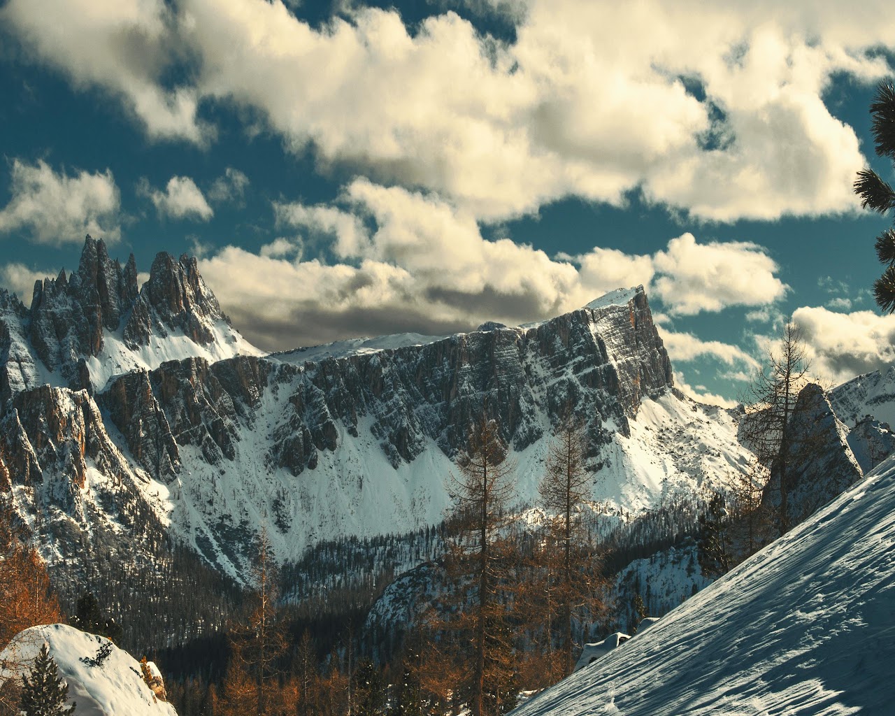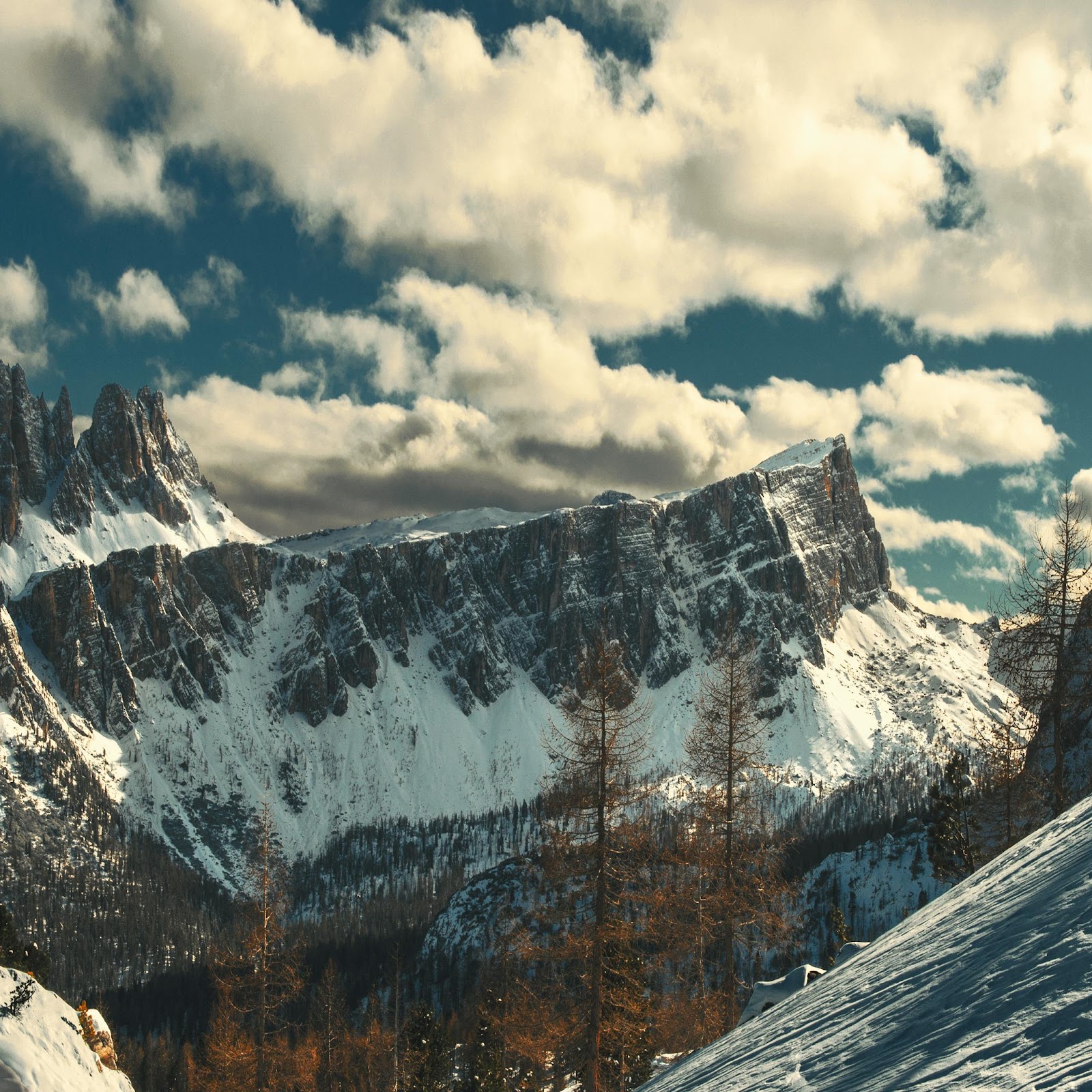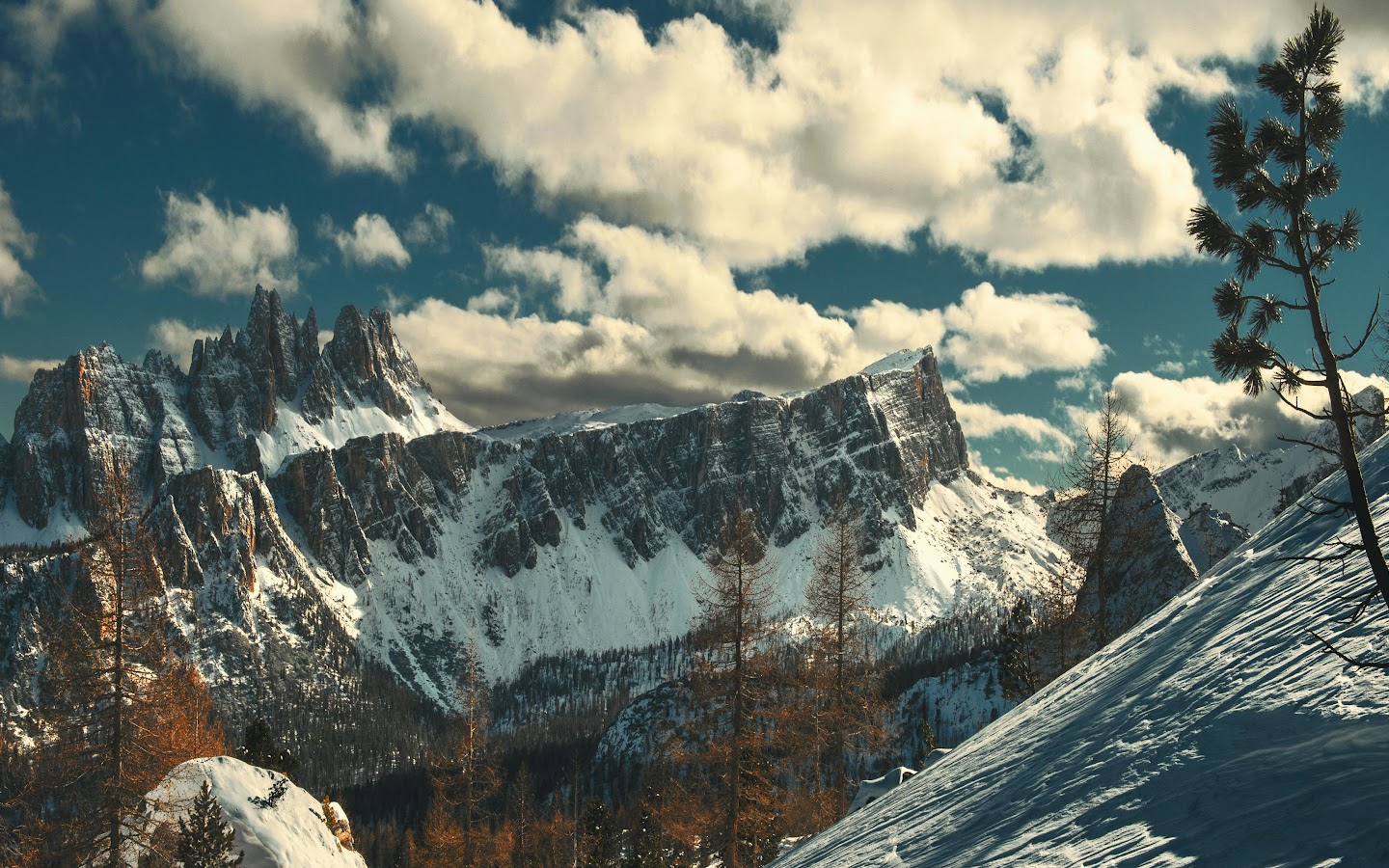 Dramatic rocky peaks rise above a snowy slope, set against a deep blue winter sky with large cotton clouds.