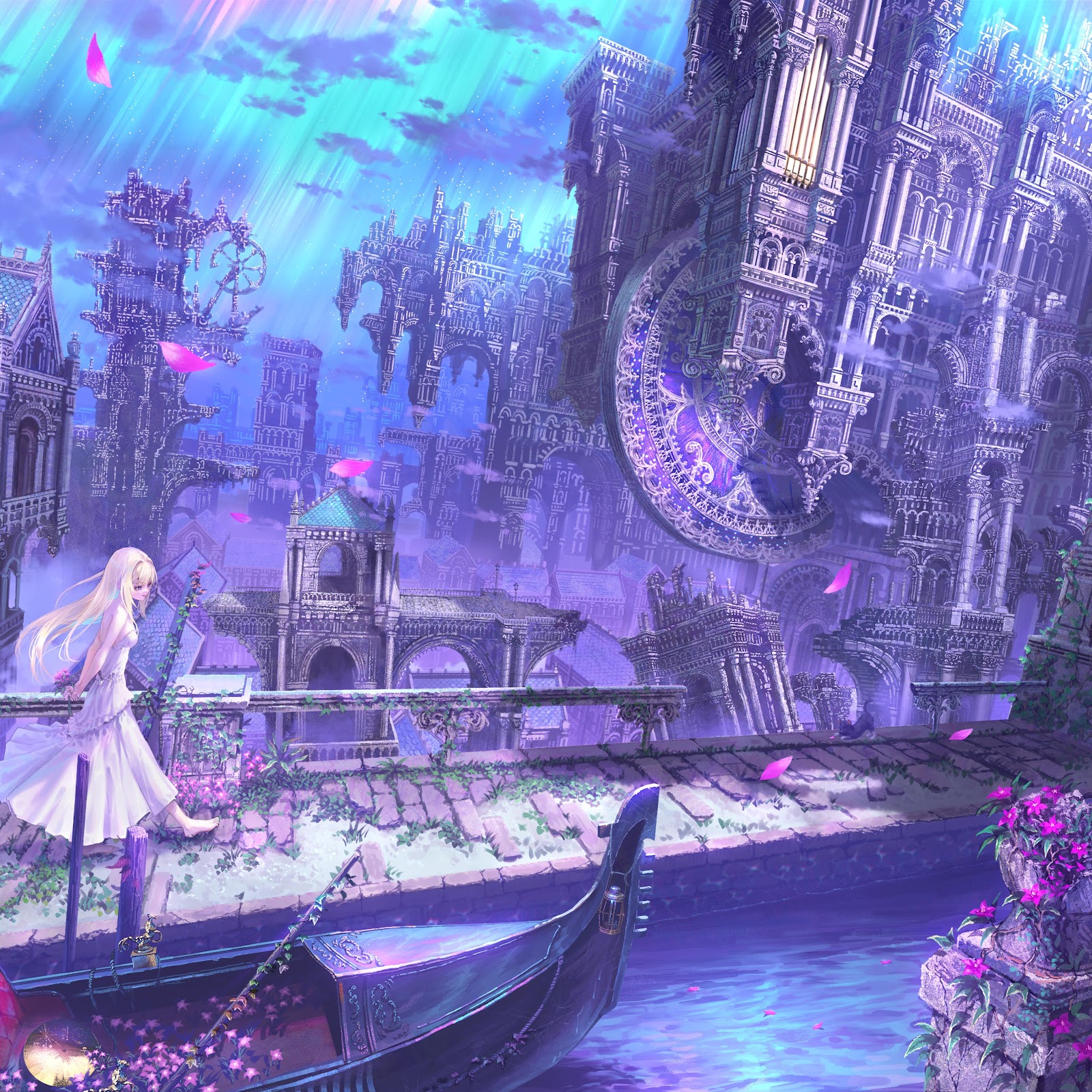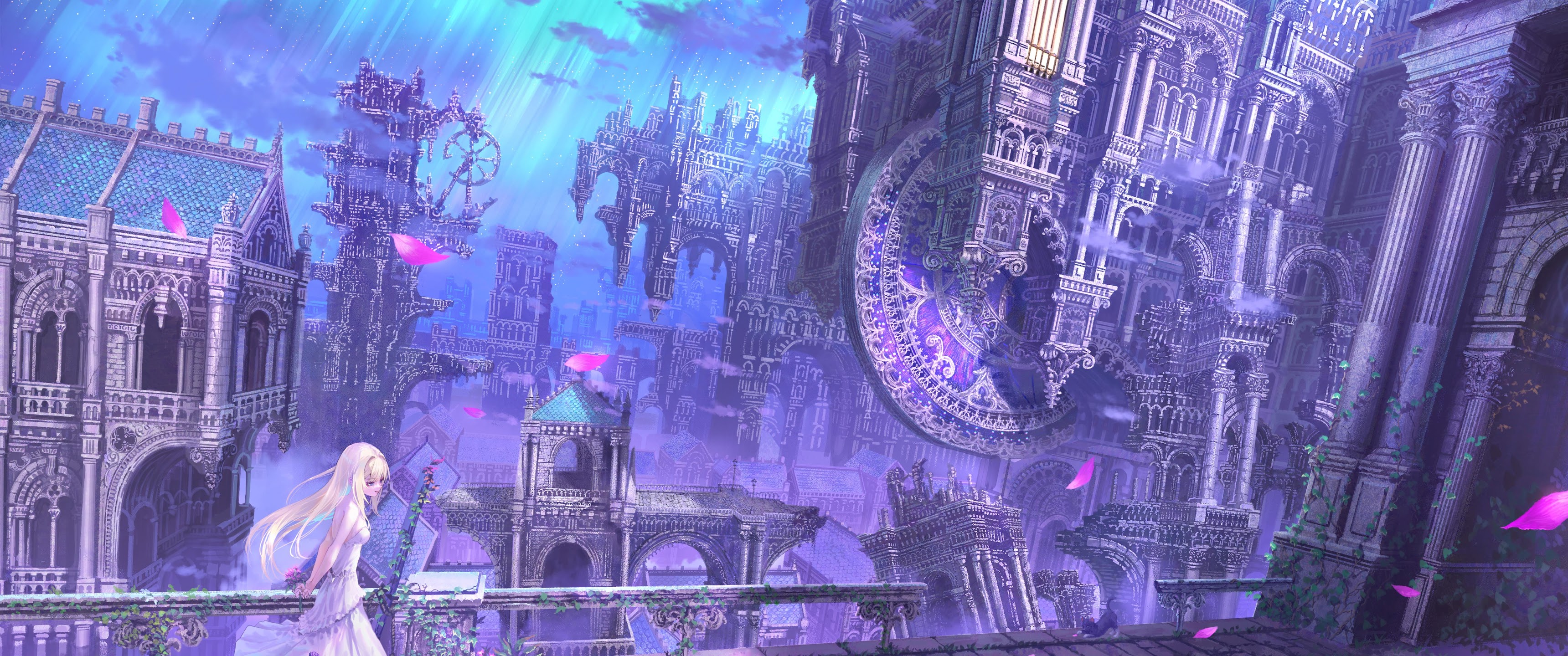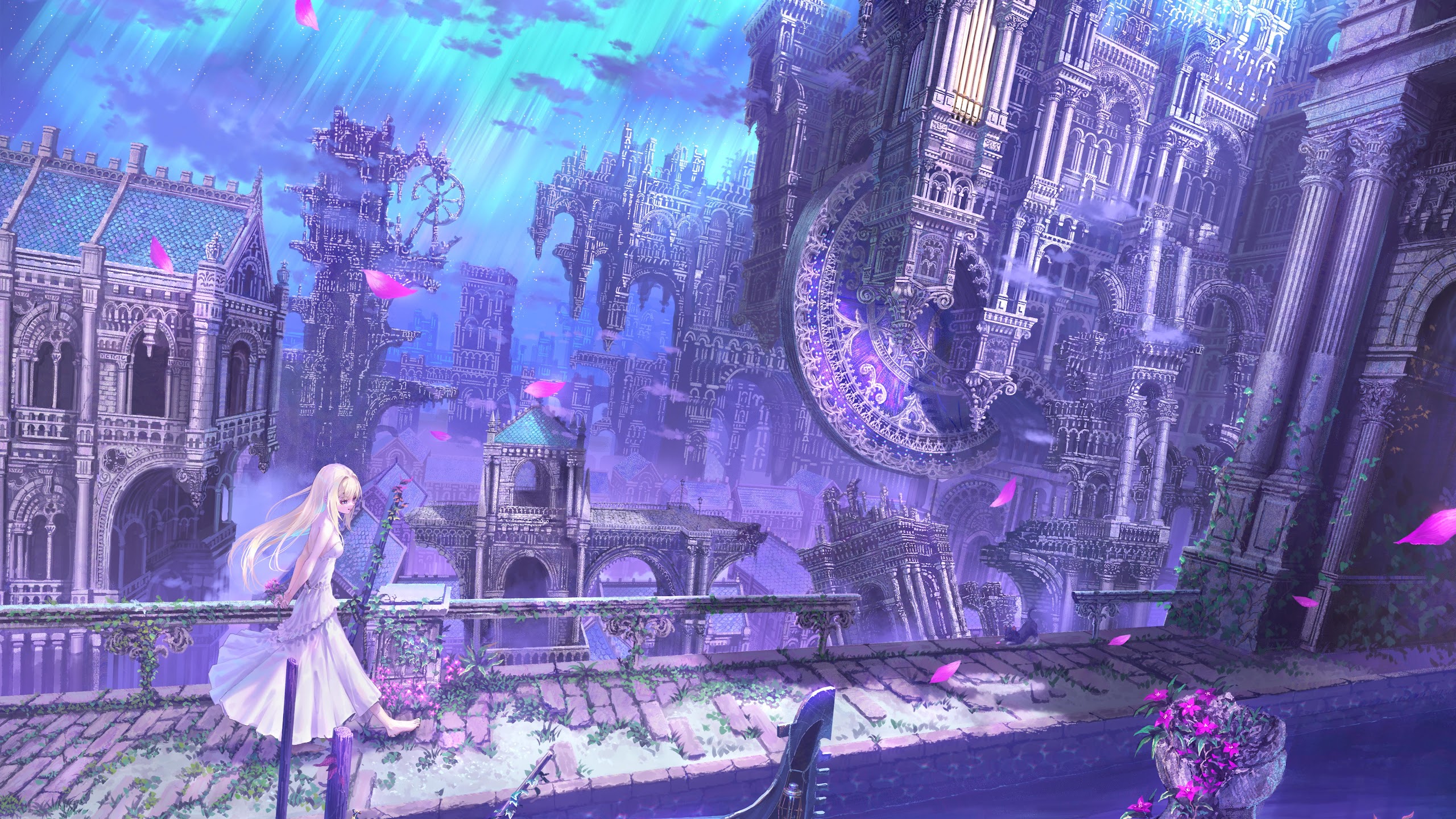 Fantasy Landscape, Anime Art, Venice Inspired, Purple Aesthetic 5K Desktop and Mobile Wallpaper Background with a maximum resolution of 5788x4093 px.
