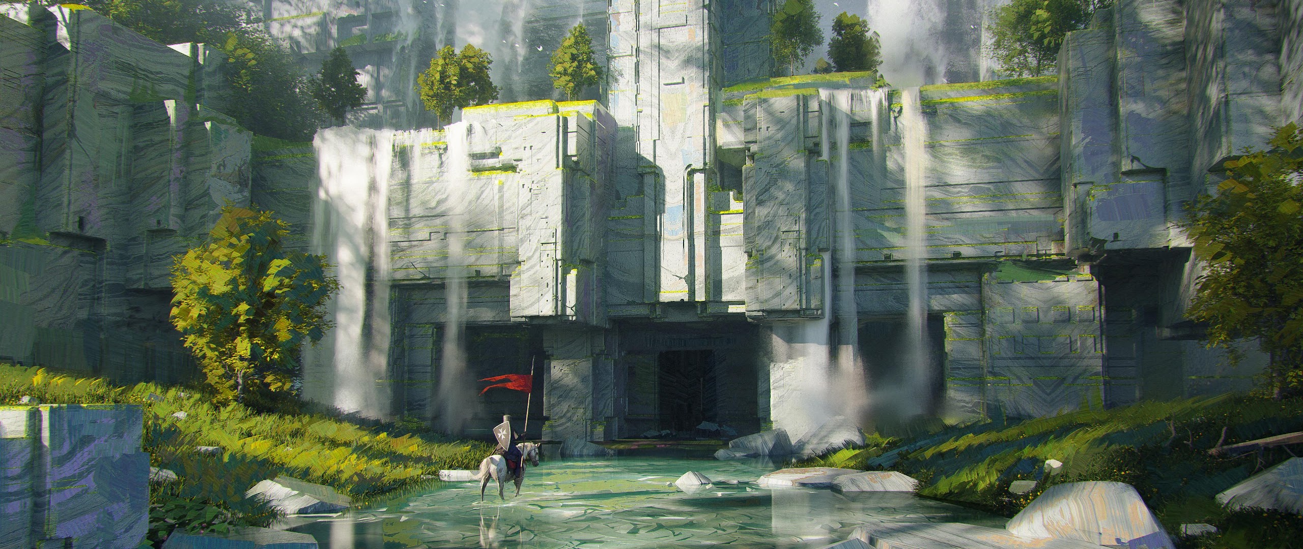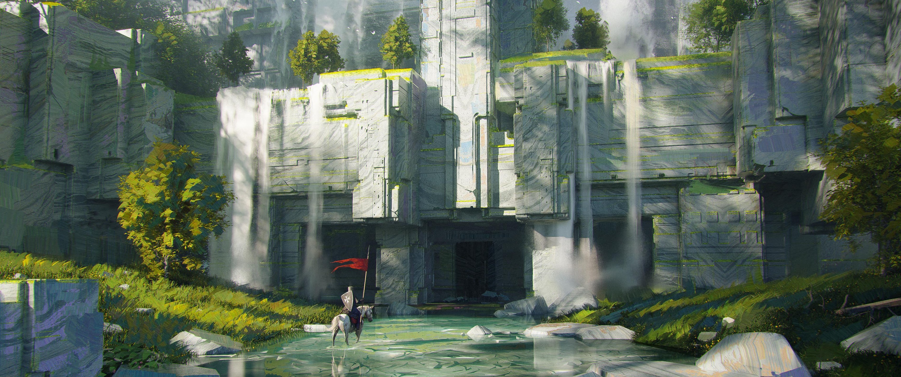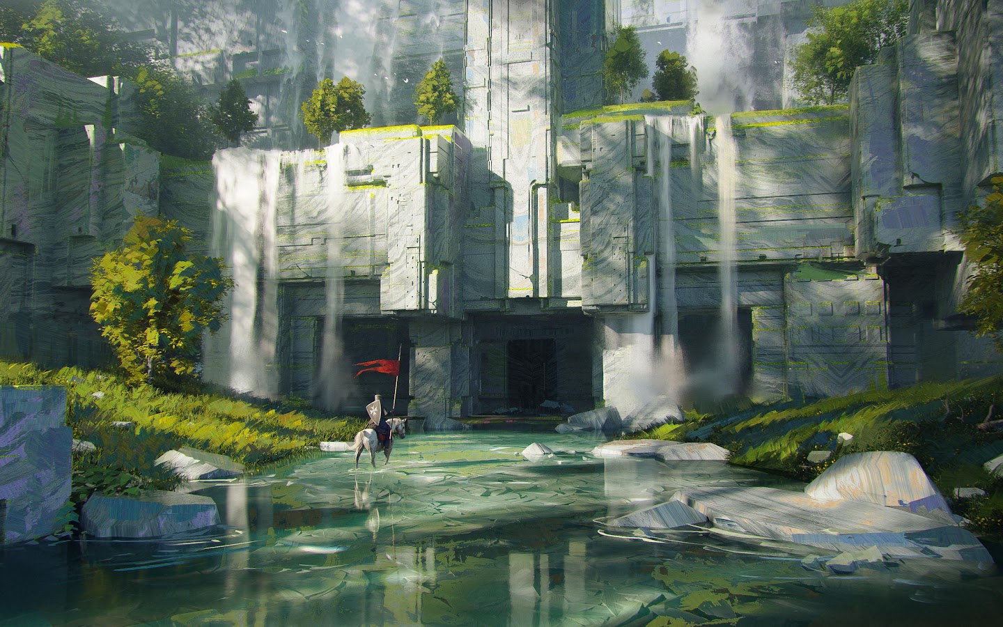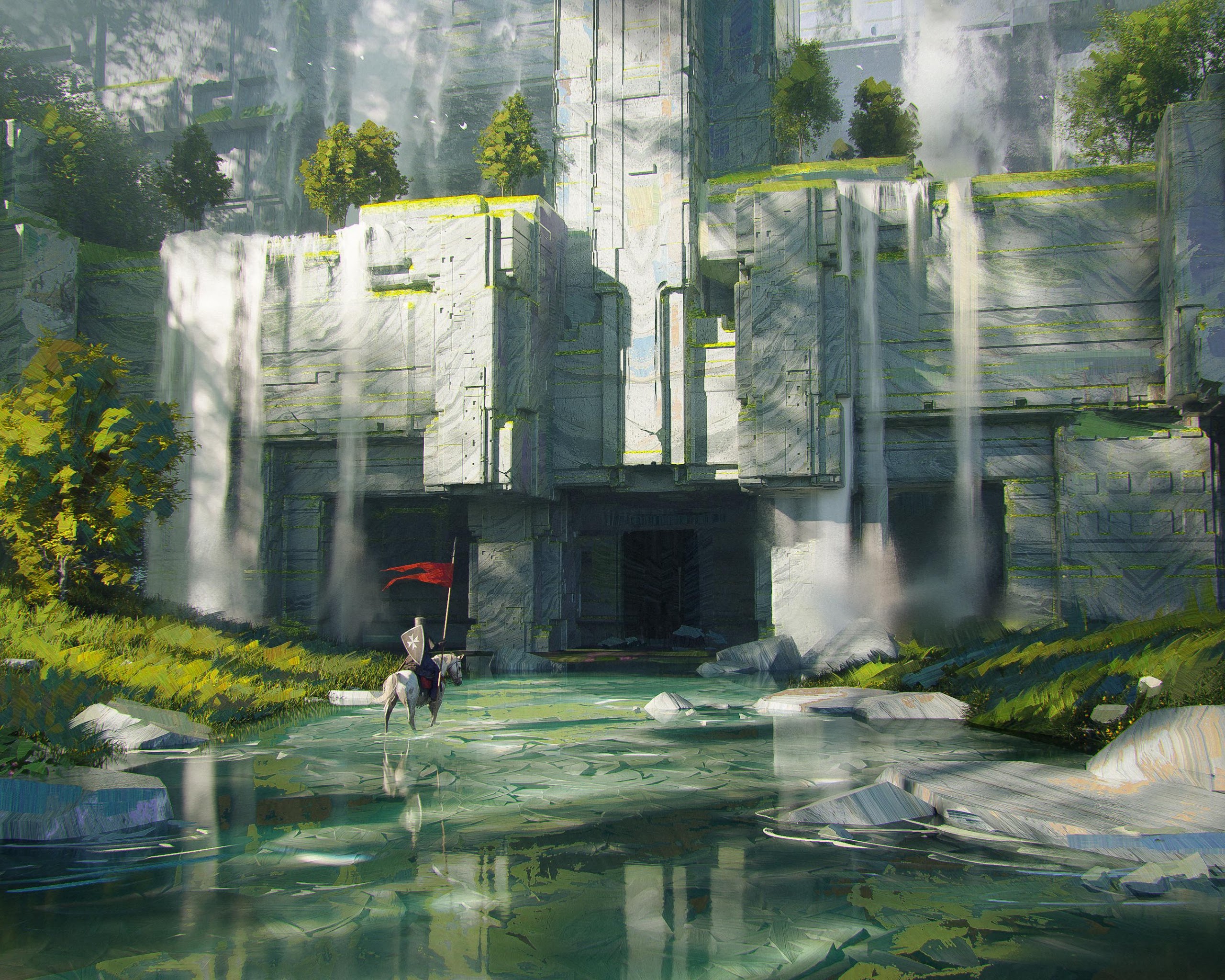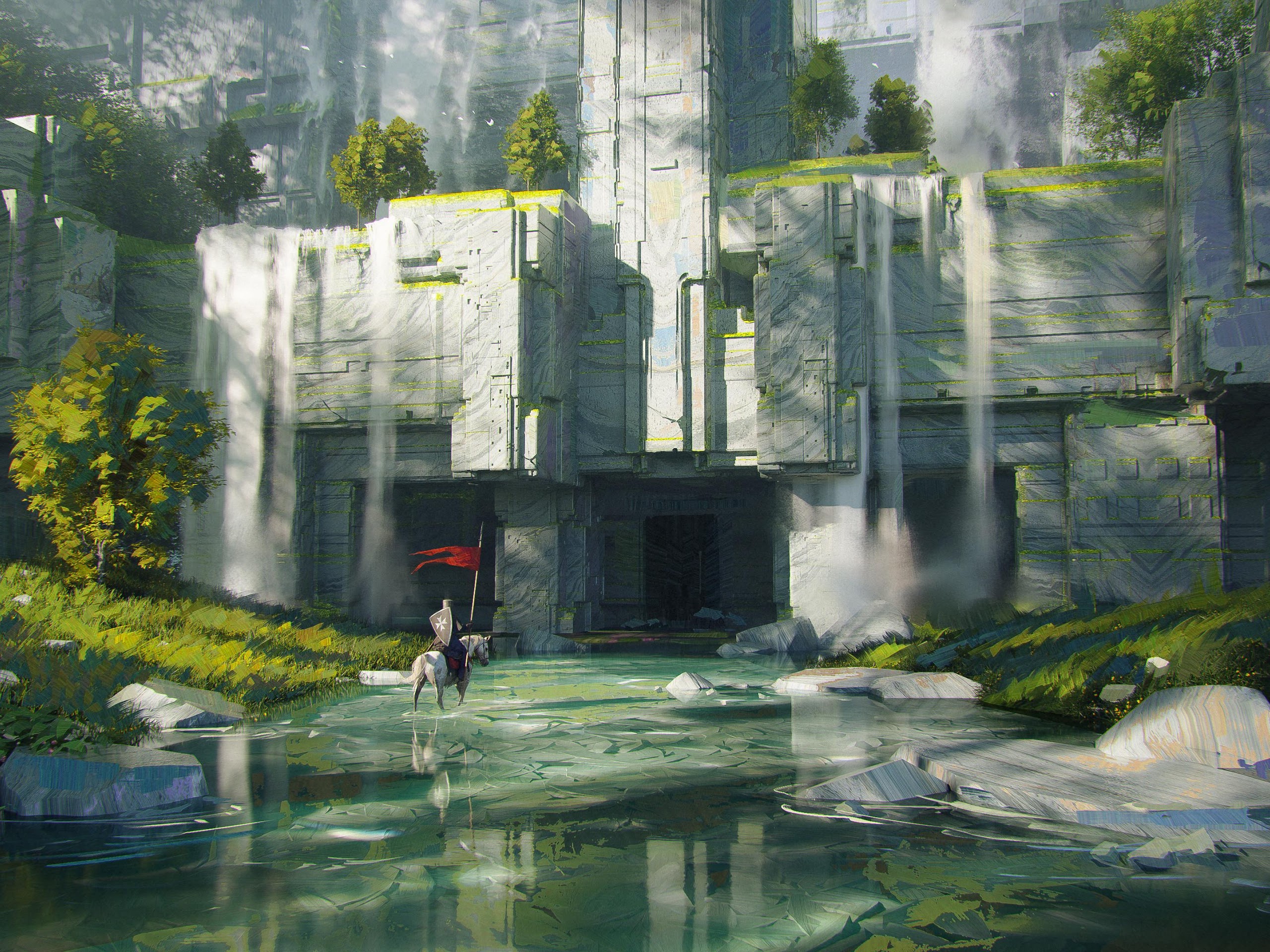 Fantasy Landscape, Waterfall, Knight, Concept Art 4K Desktop Wallpaper