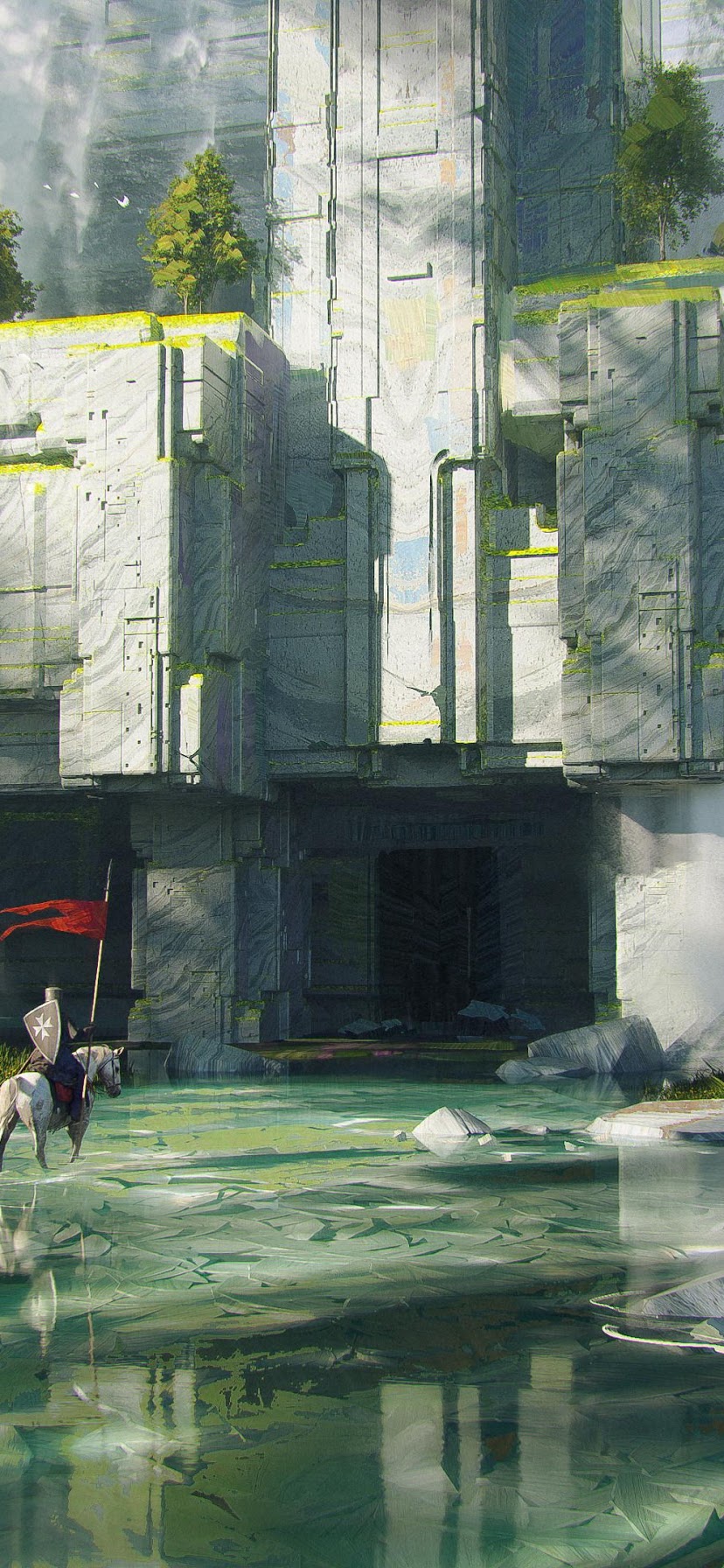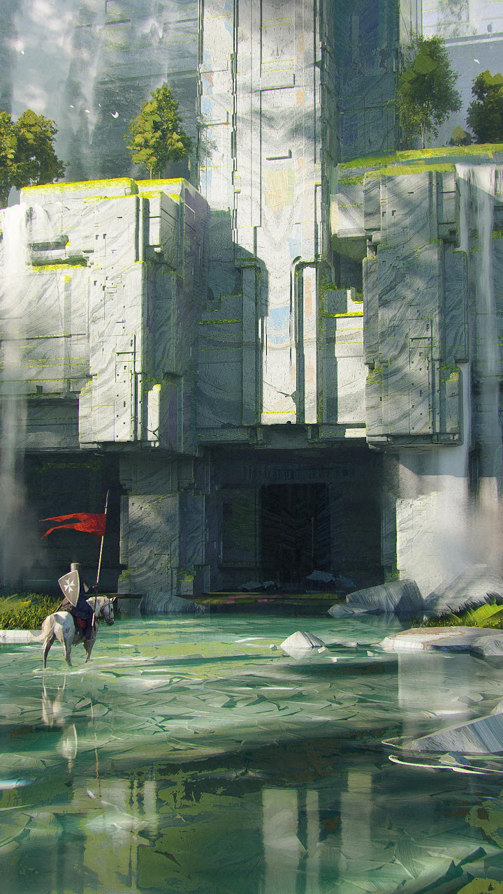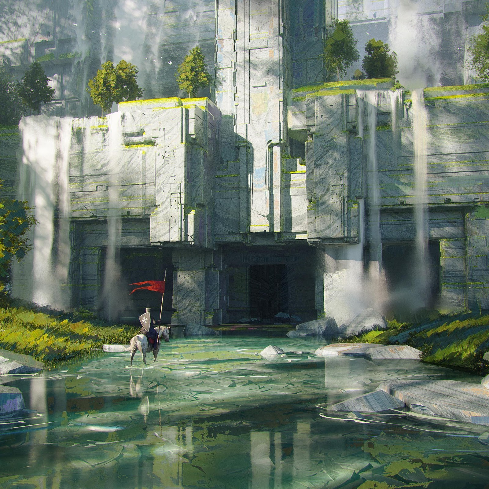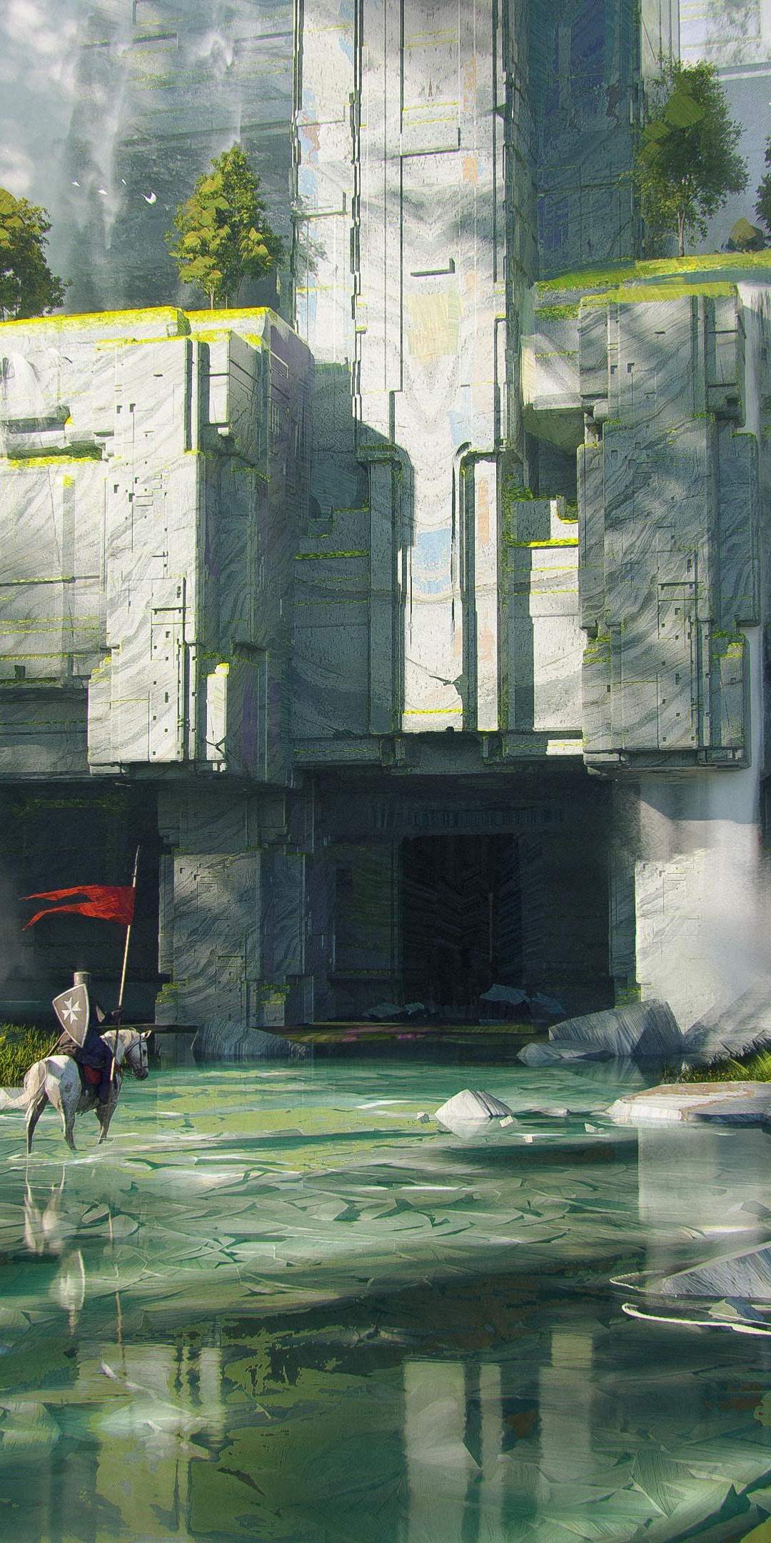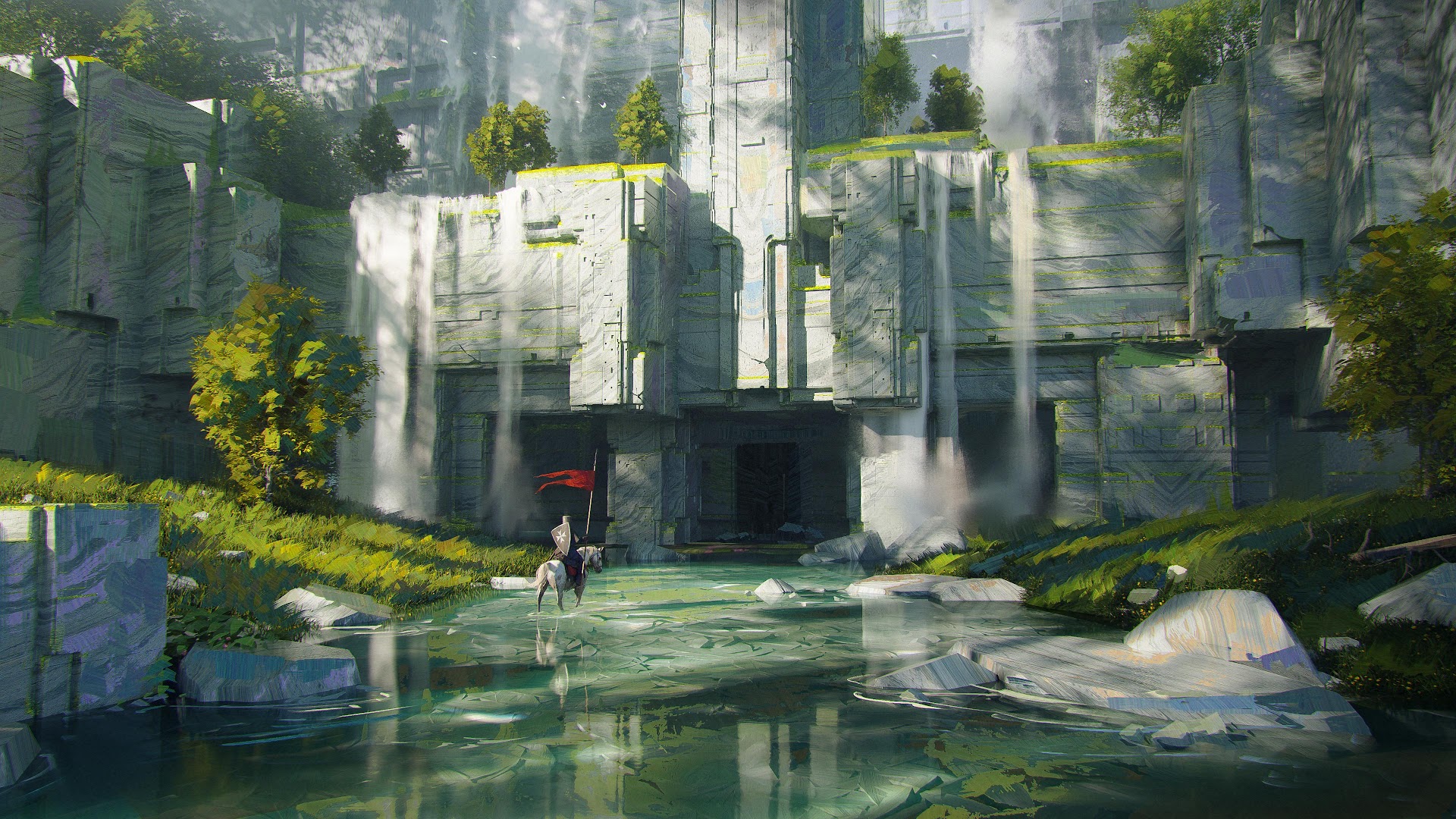 Fantasy Landscape, Waterfall, Knight, Concept Art 4K Desktop Wallpaper