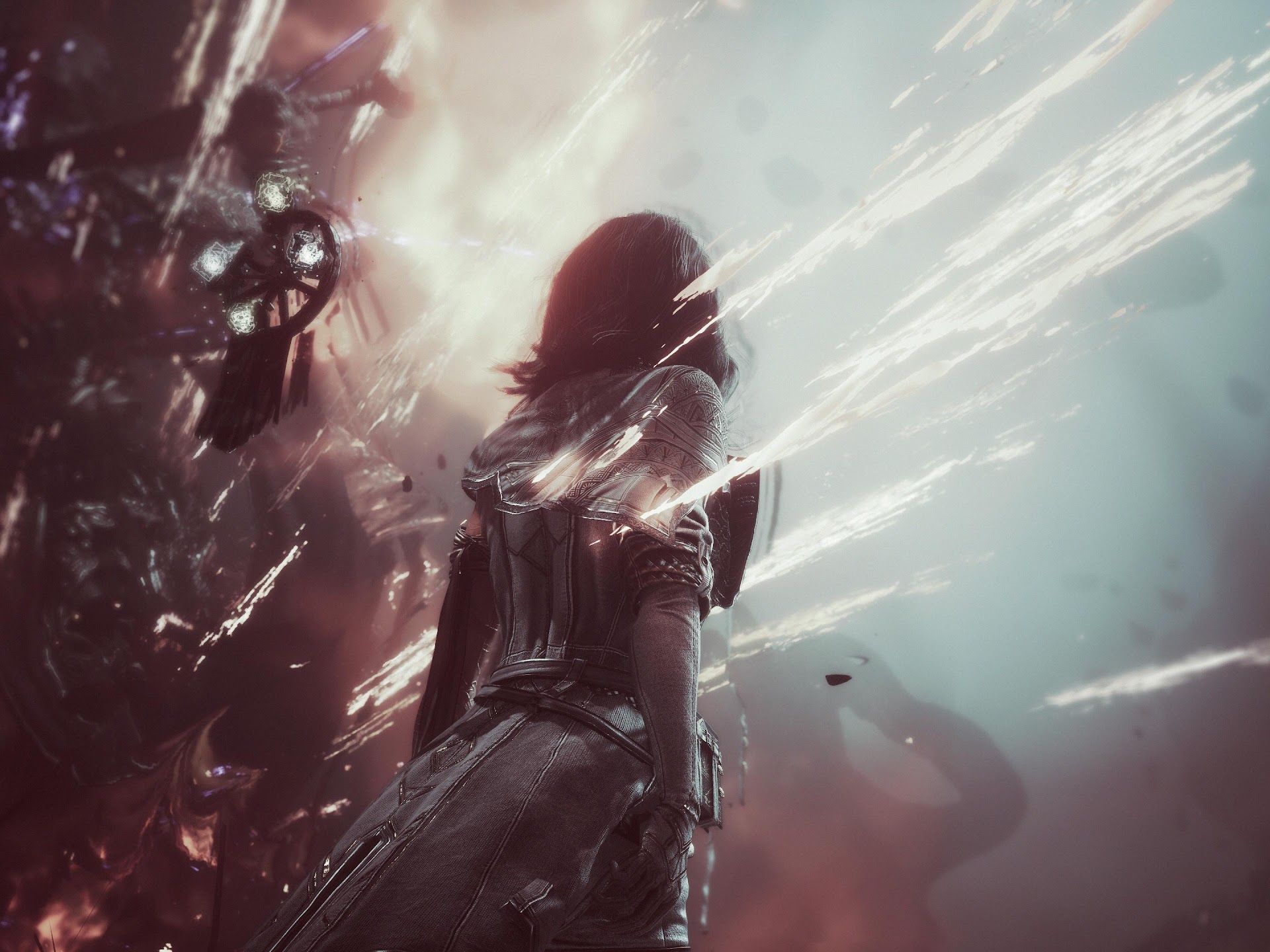 A hooded warrior figure stands facing a chaotic, powerful energy mass with dramatic light rays streaming across the scene.