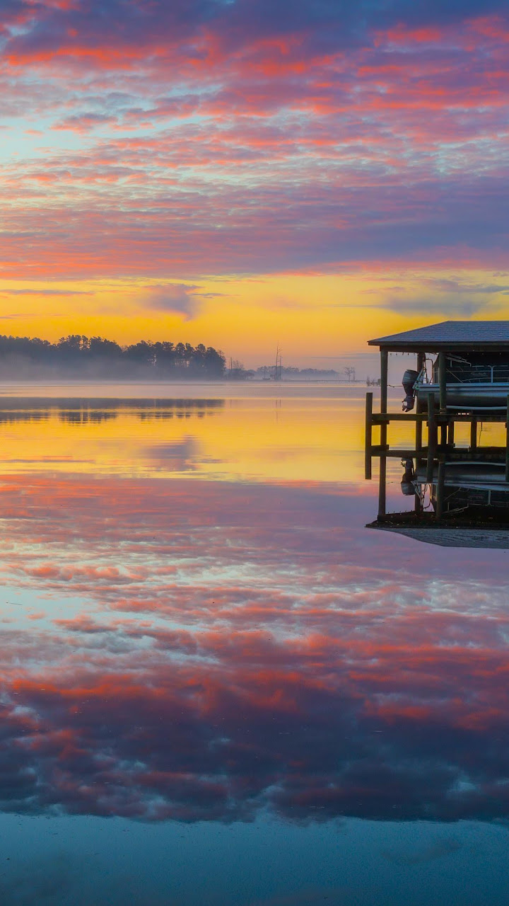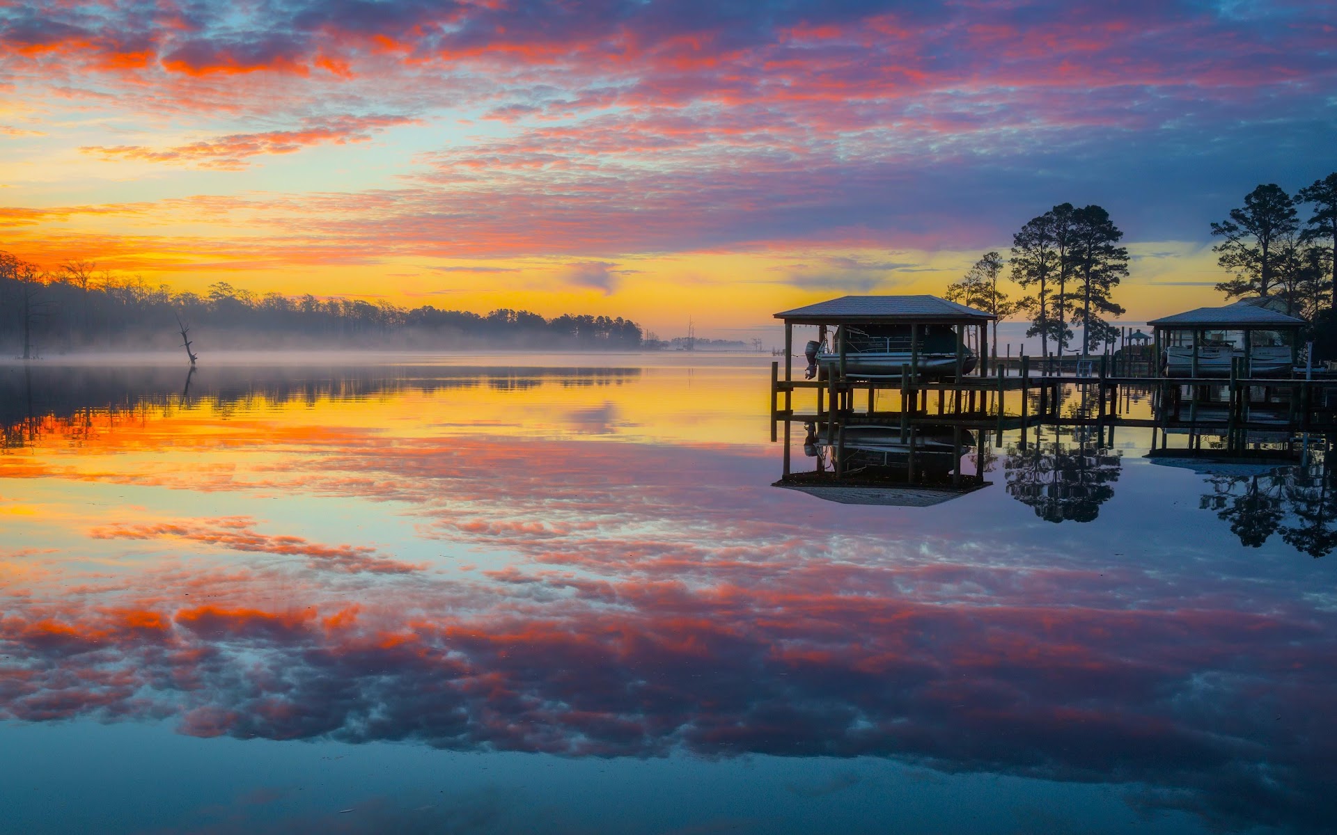 Small boat docks stand on calm water reflecting the fiery orange and red clouds of the beautiful sunset.