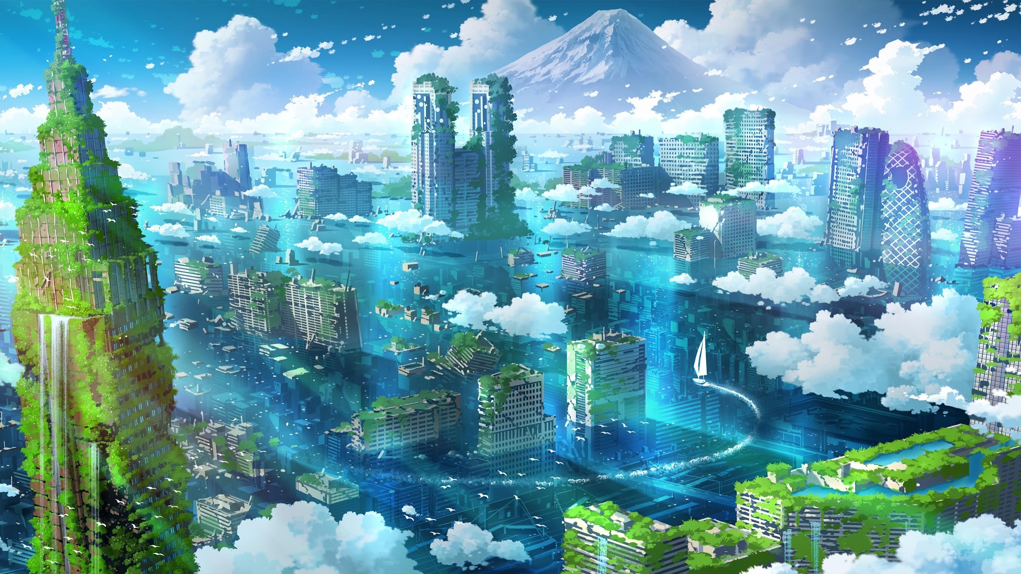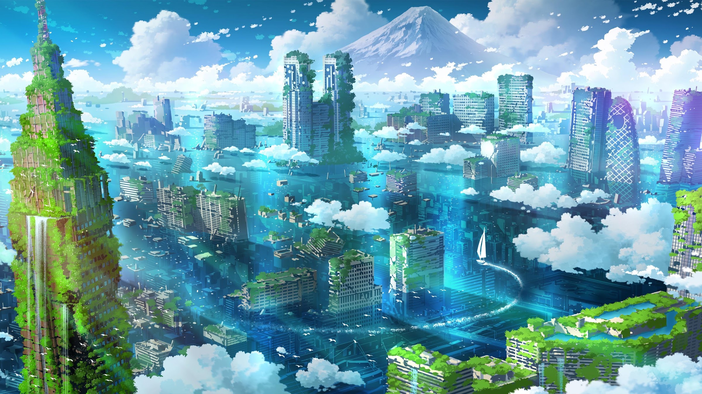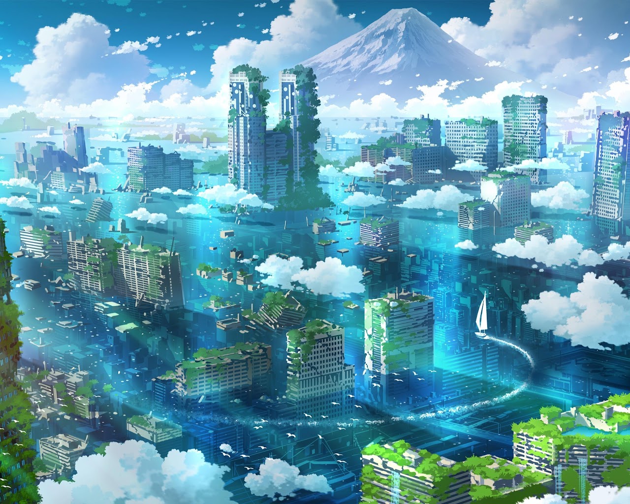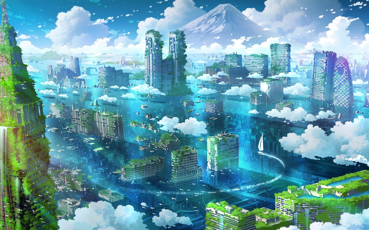 Futuristic Cityscape, Climate Fiction, Overgrown Architecture, Anime Art 2K Desktop Wallpaper