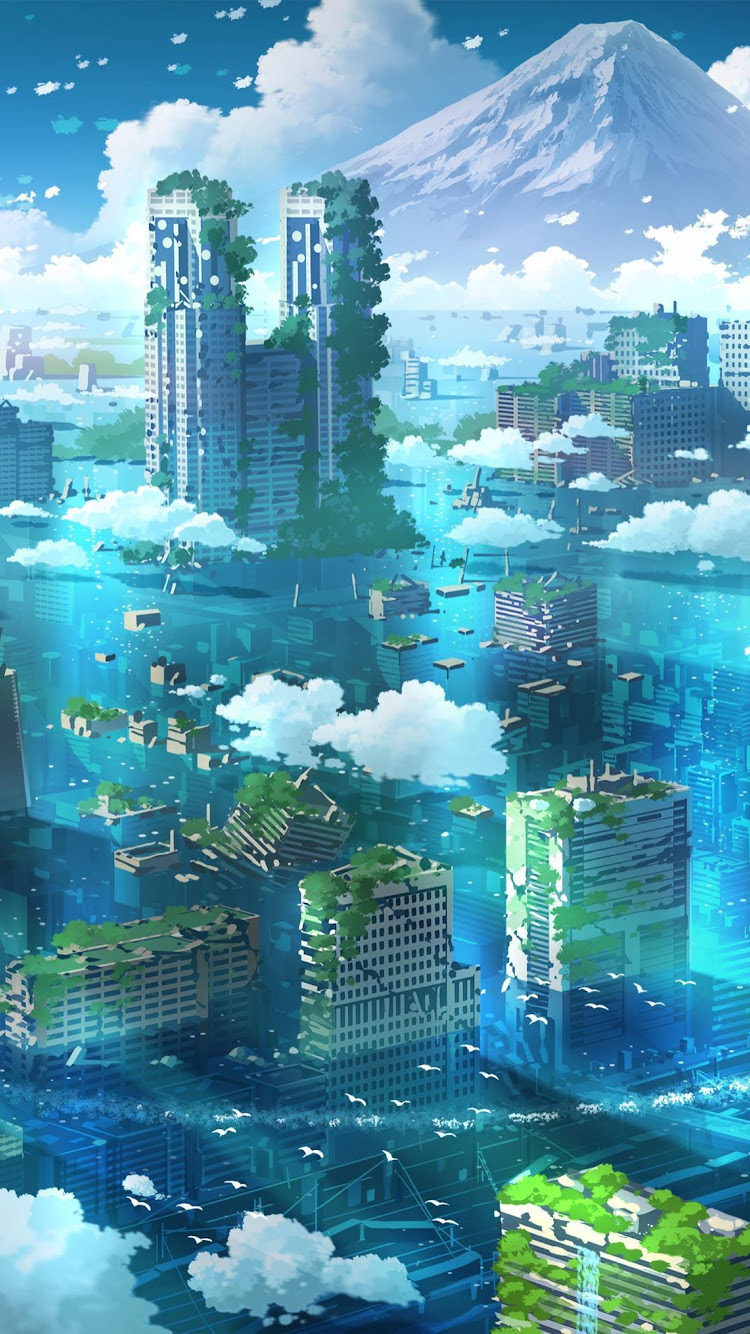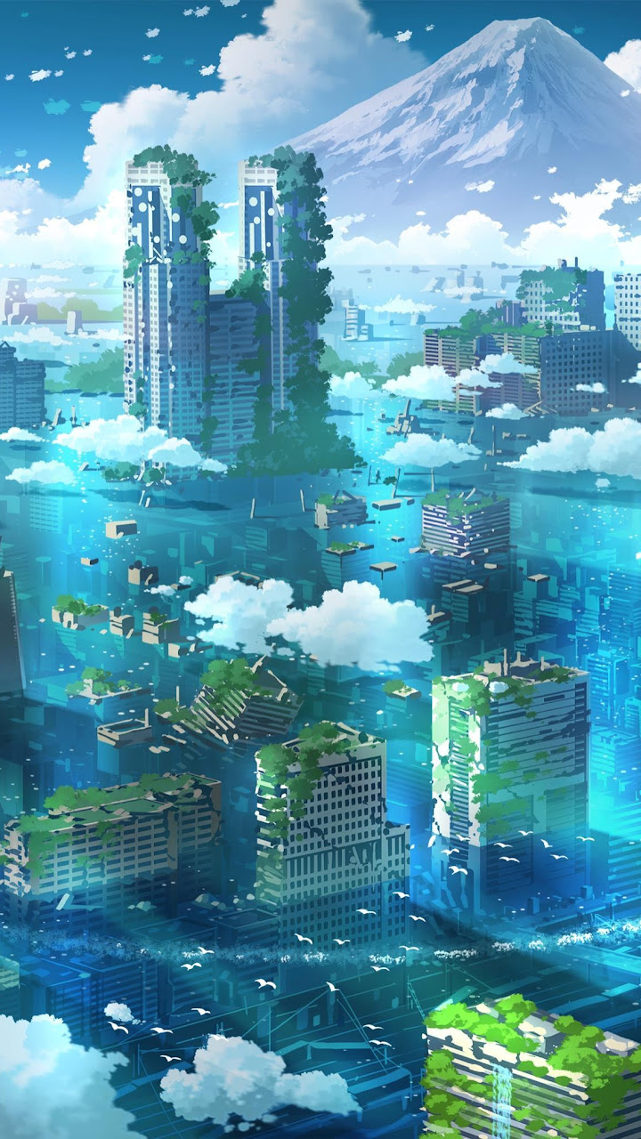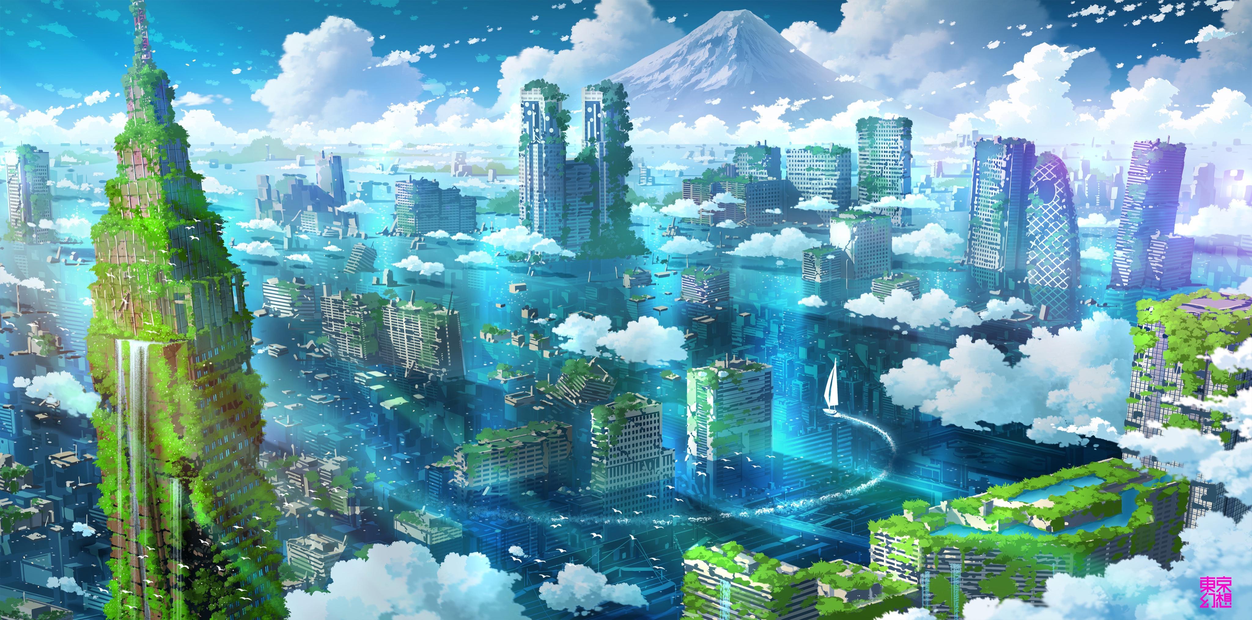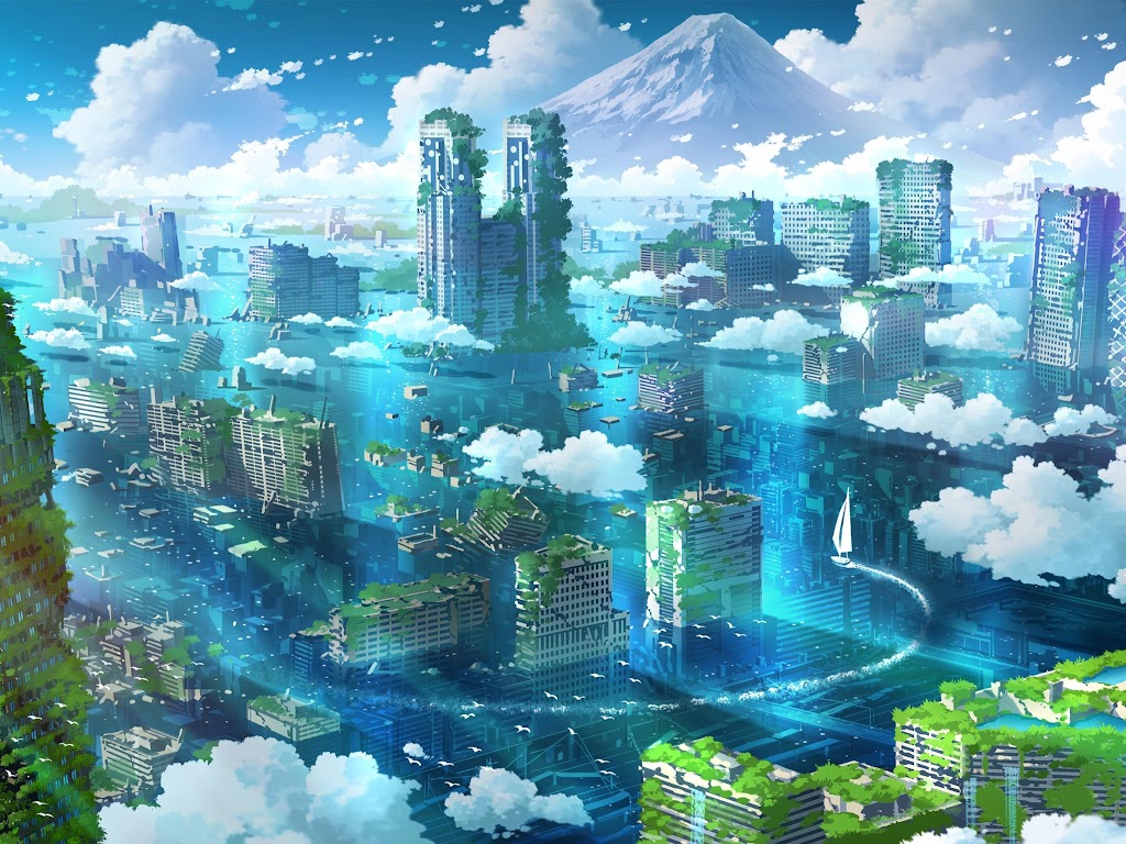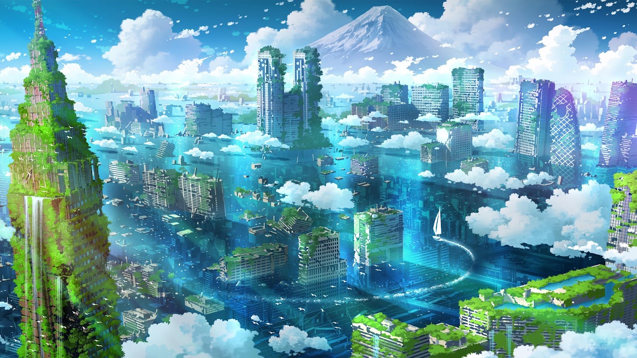 Futuristic Cityscape, Climate Fiction, Overgrown Architecture, Anime Art 2K Desktop Wallpaper
