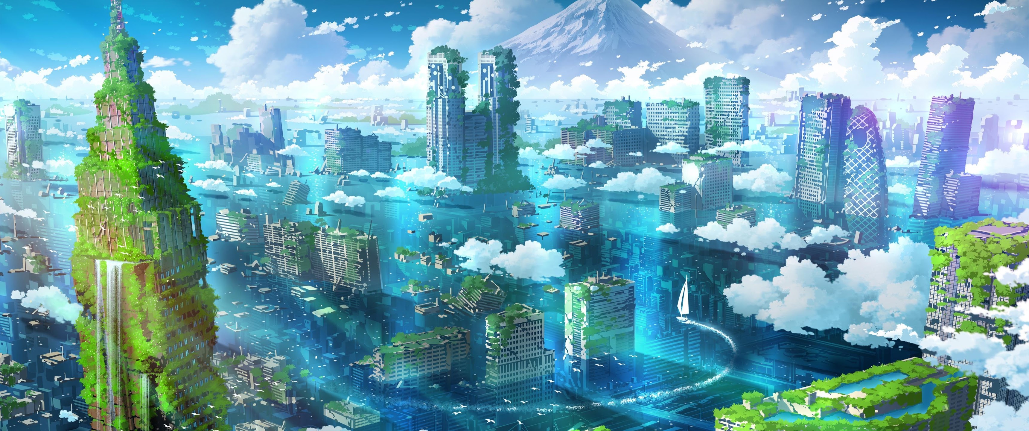 Futuristic Cityscape, Climate Fiction, Overgrown Architecture, Anime Art 2K Desktop and Mobile Wallpaper Background with a maximum resolution of 4096x2030 px.