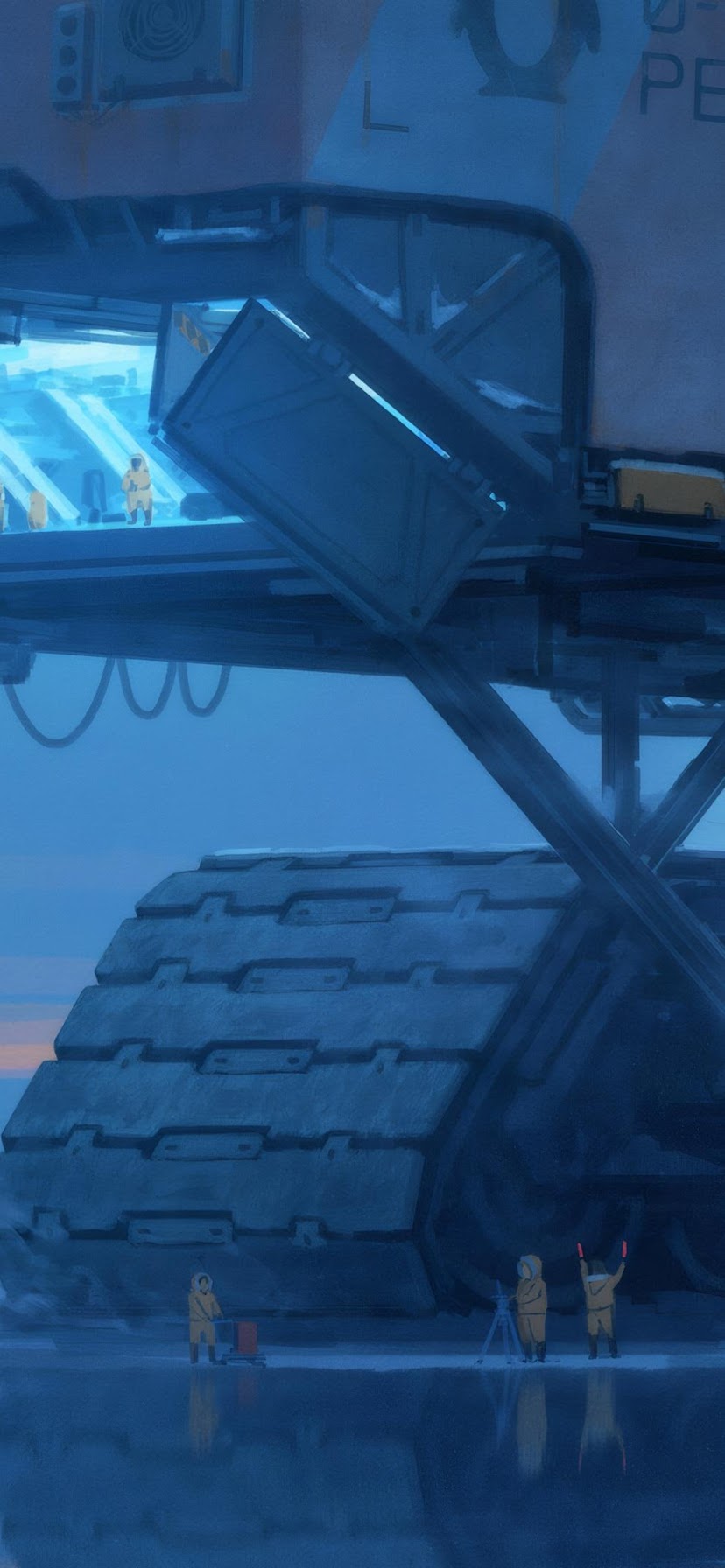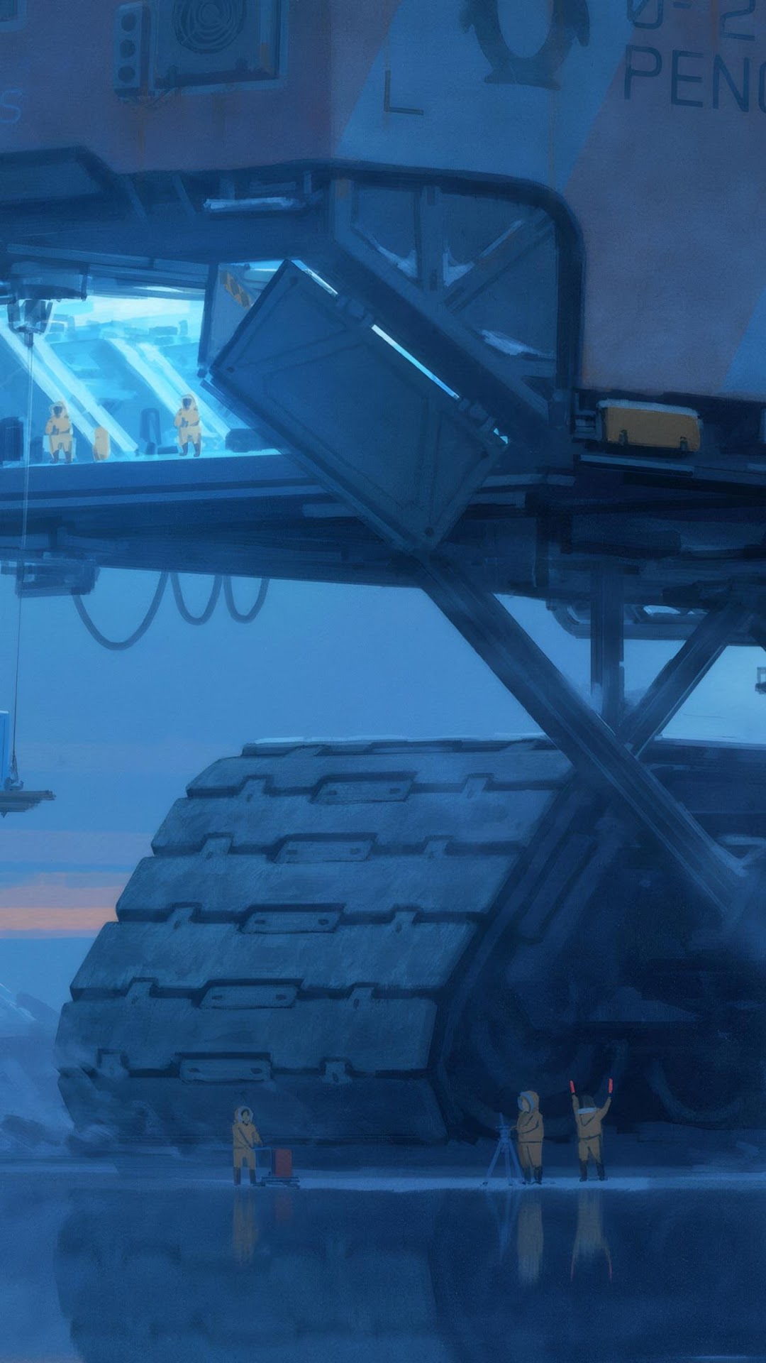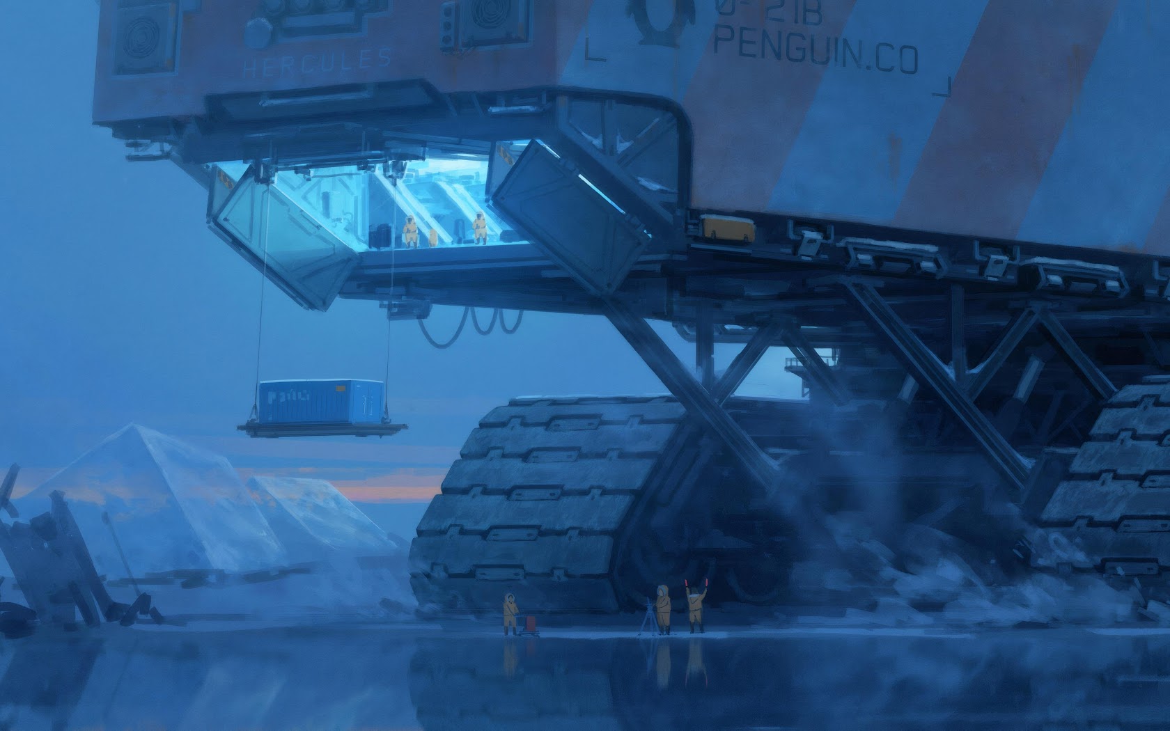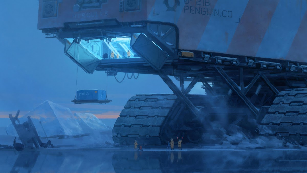 A giant tracked vehicle named Hercules lands on a frozen tundra with workers in yellow suits waiting below the loading bay.