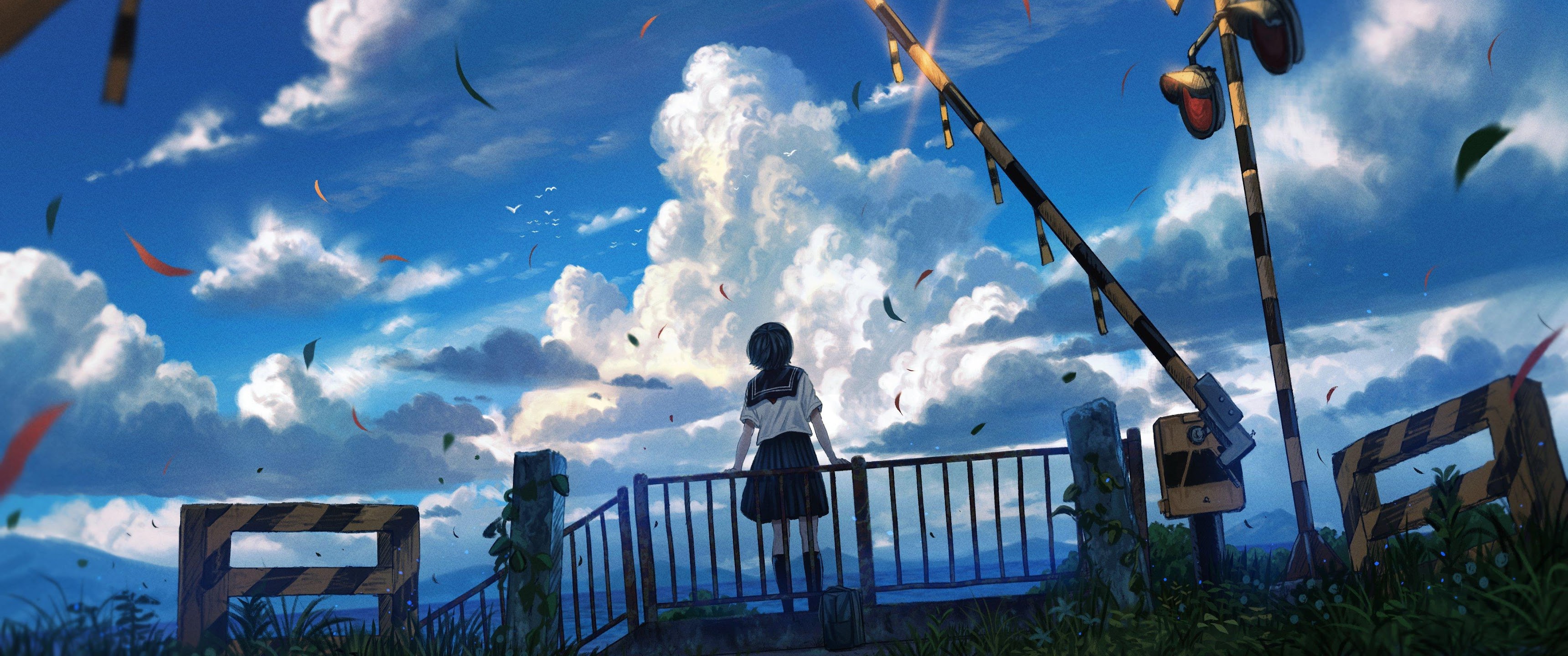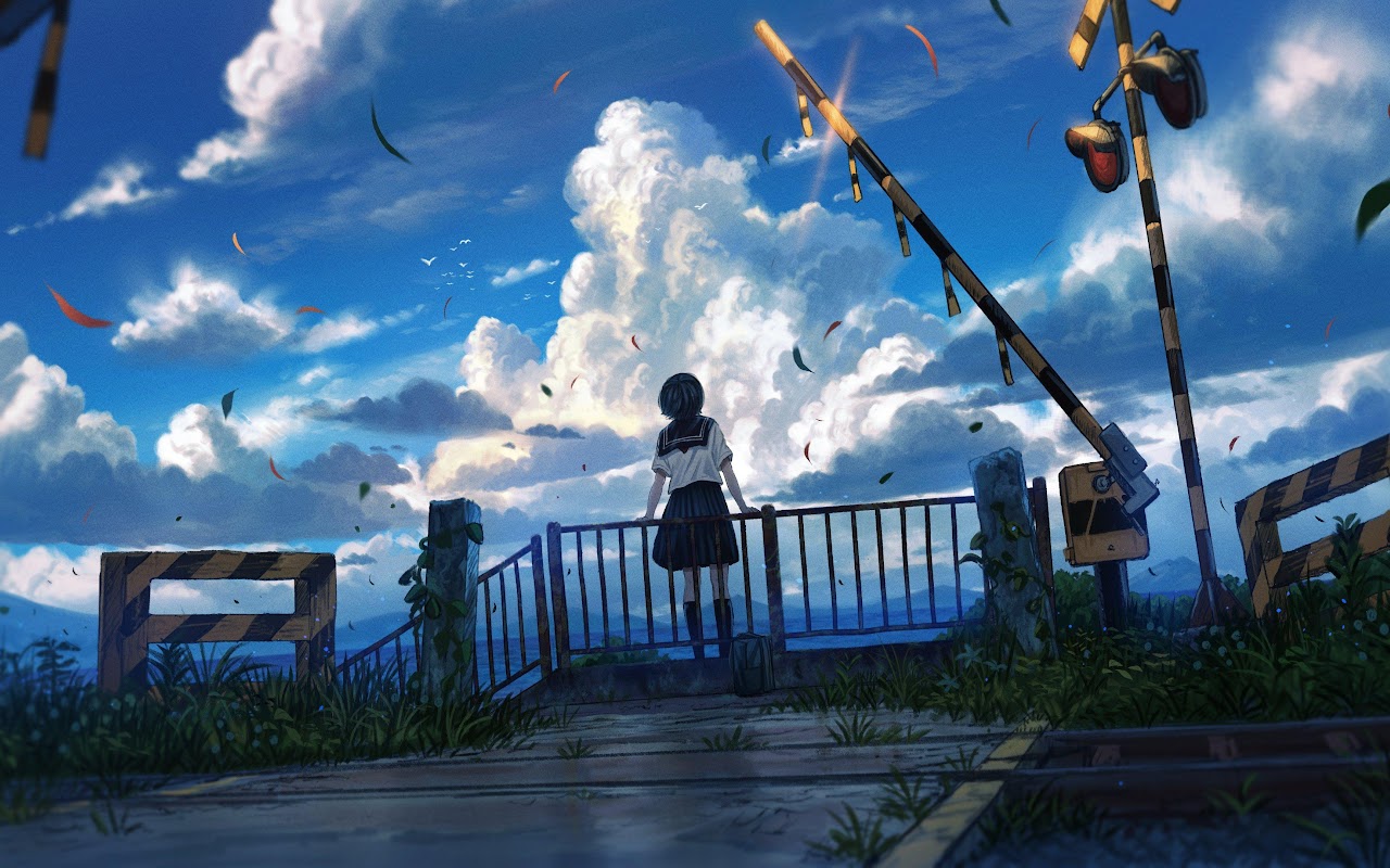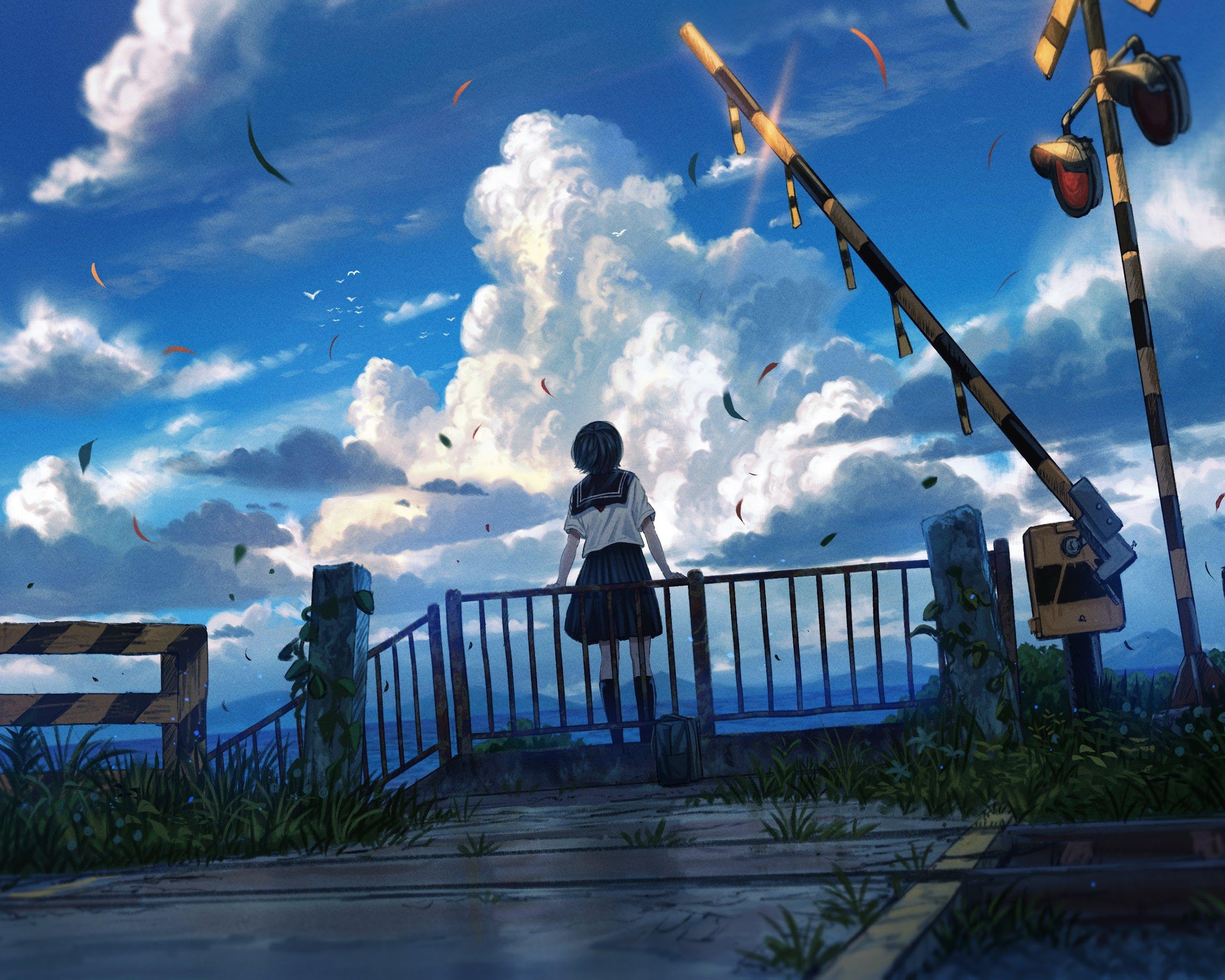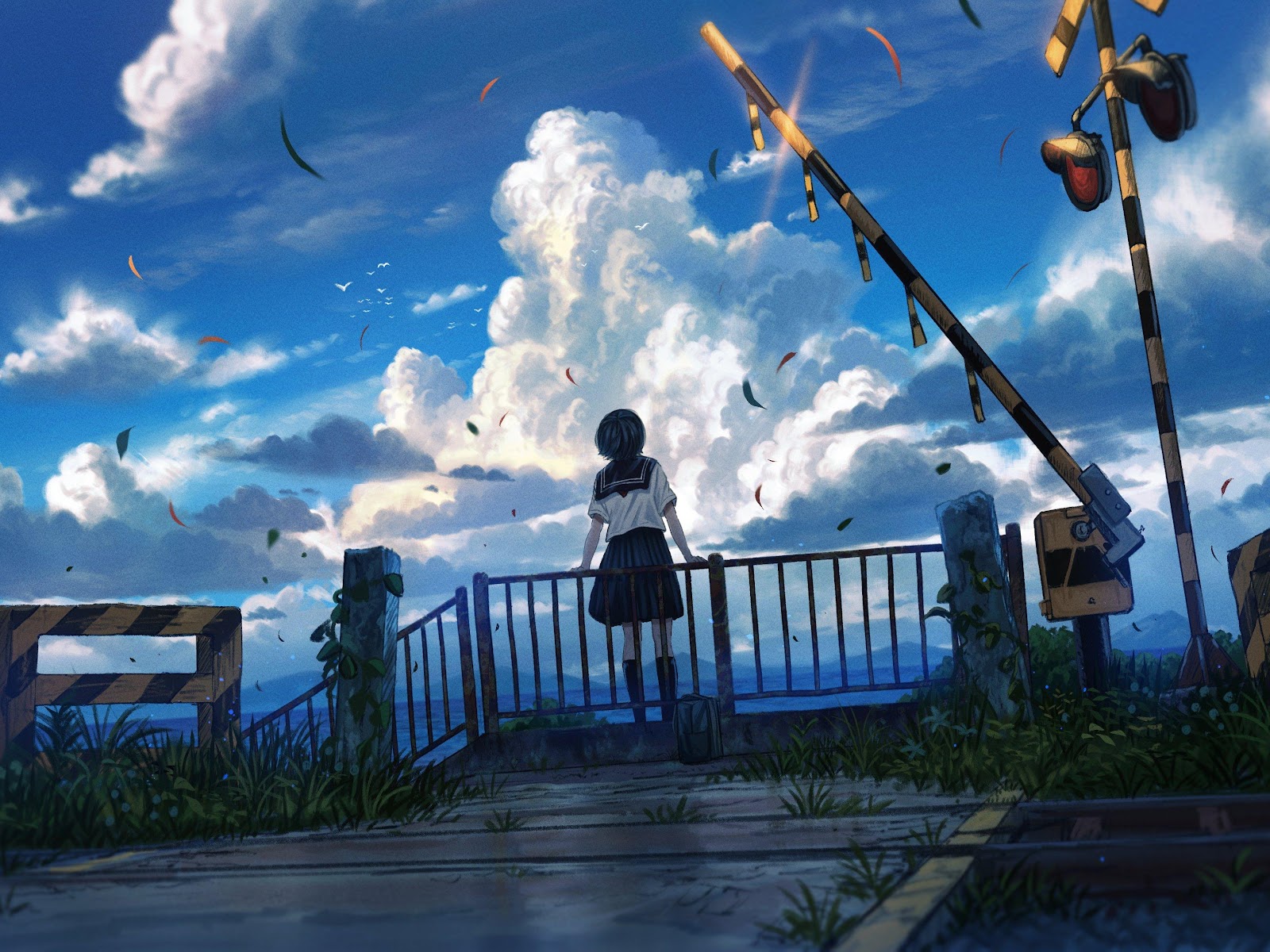 A young girl in a school uniform stands at a railway crossing fence looking up at the immense, sunny cumulus clouds in the sky.