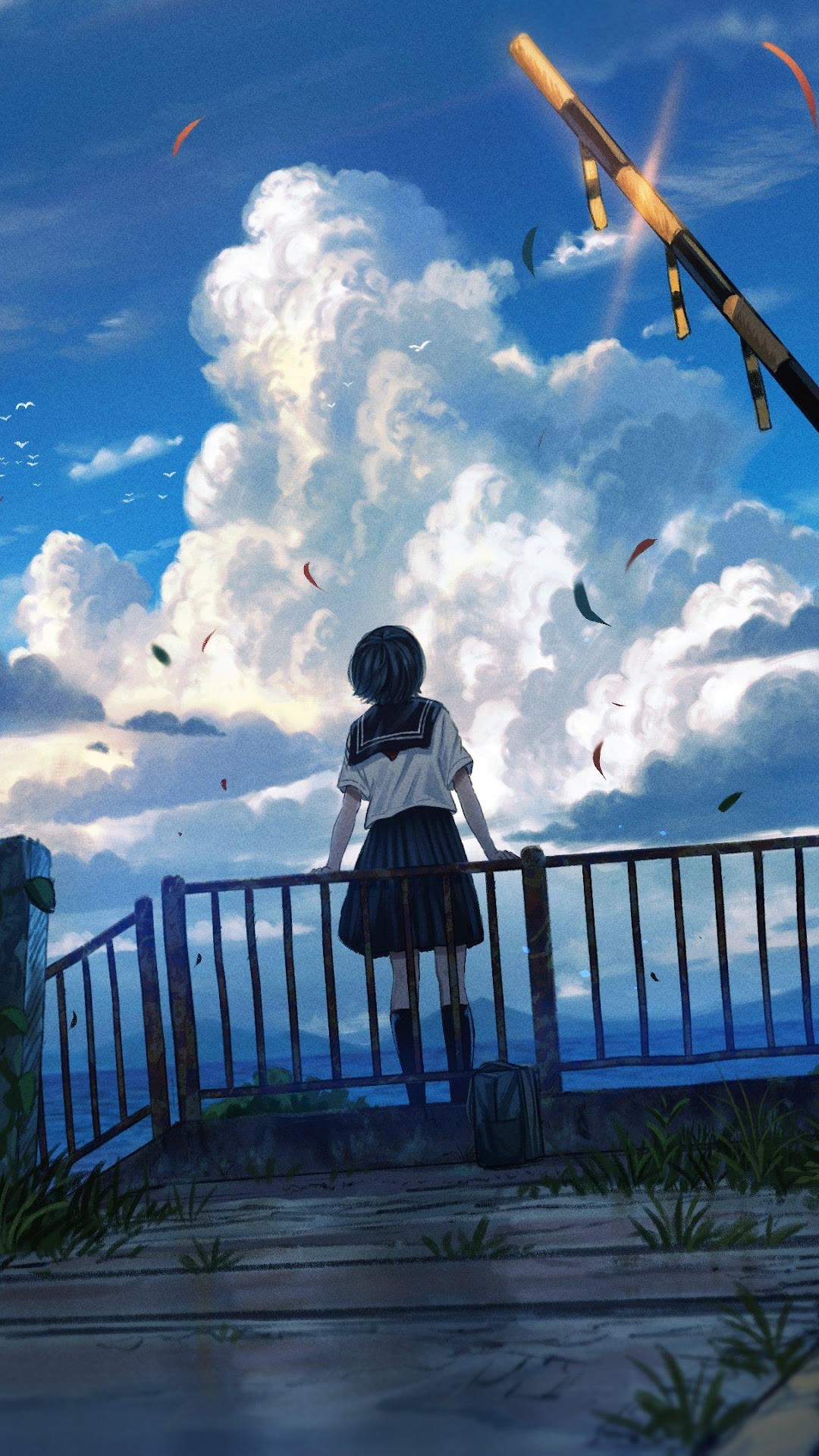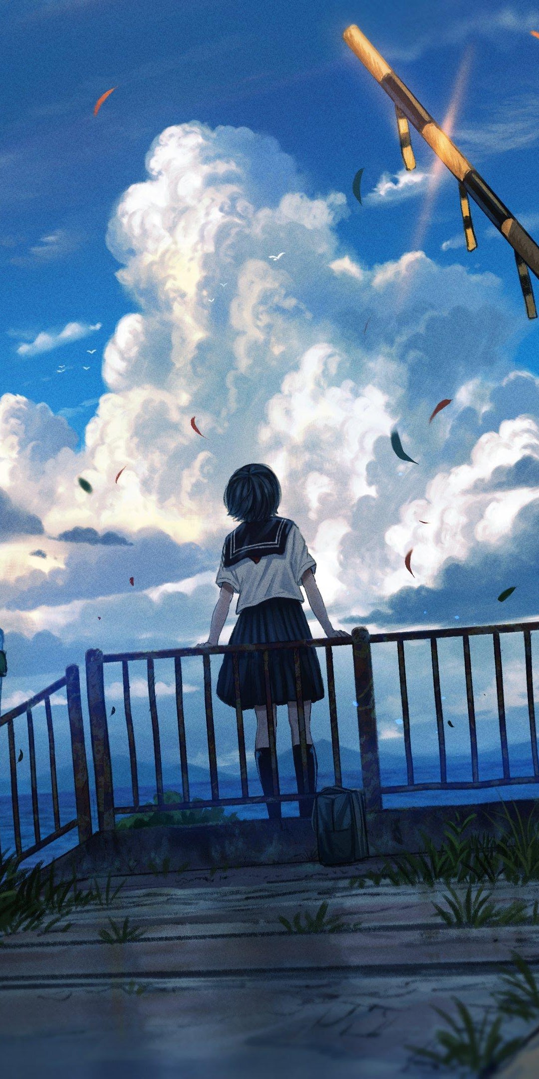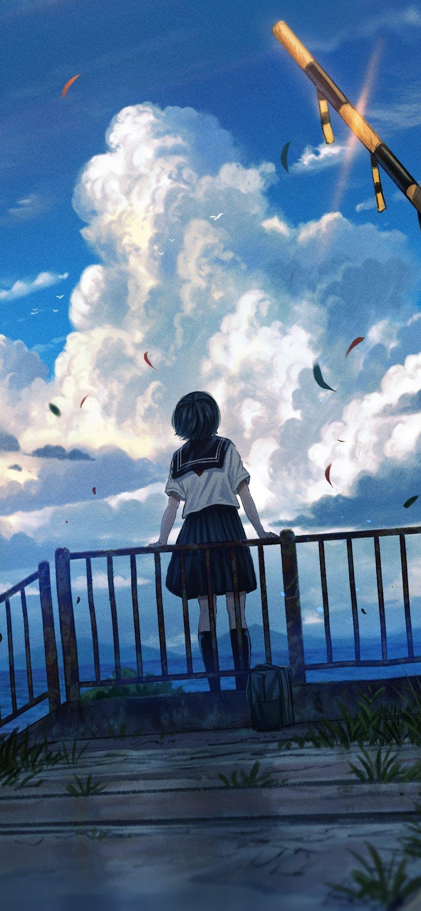 A young girl in a school uniform stands at a railway crossing fence looking up at the immense, sunny cumulus clouds in the sky.