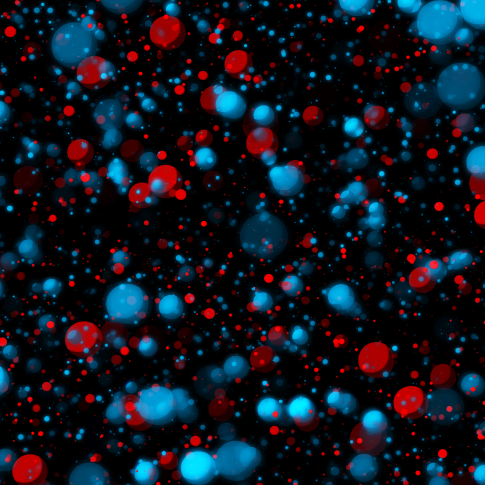 Red and cyan glowing particles float across a deep black background, creating a vibrant digital bokeh effect.