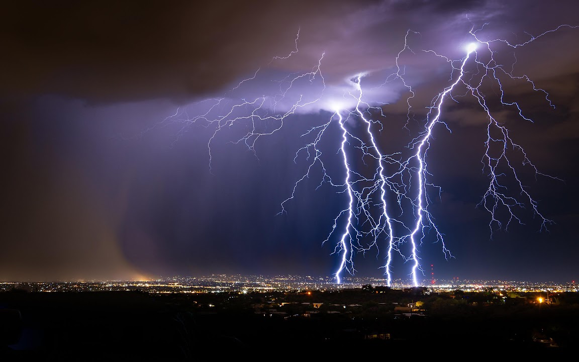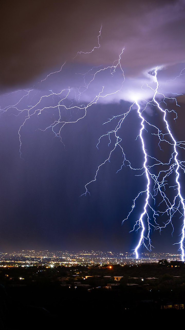 Bright, jagged lightning bolts strike down from dark purple clouds over a sprawling city skyline, showing a powerful night storm.