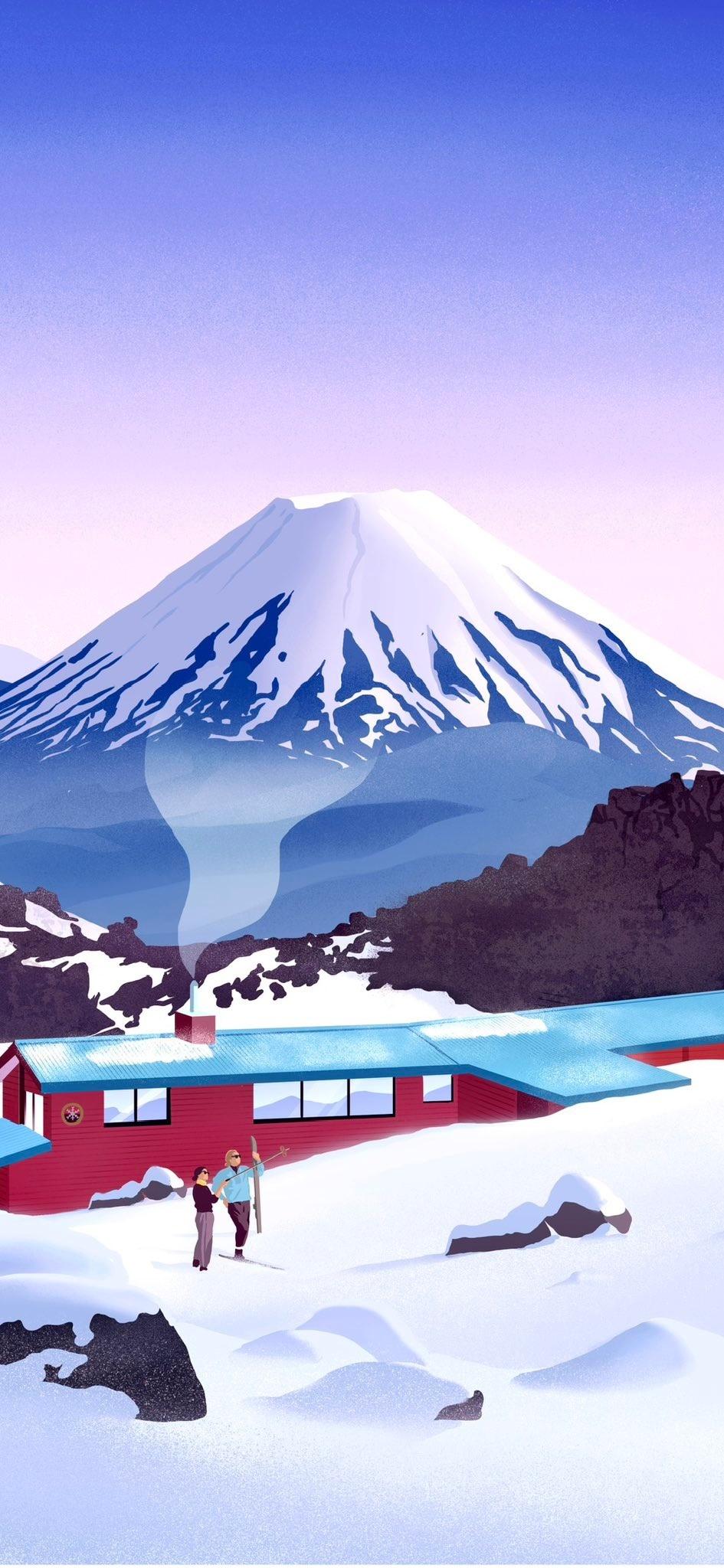 Mount Fuji Art, Winter Landscape, Skiing Illustration, Mountain Lodge Graphic iPhone Wallpaper Background with a maximum resolution of 945x2048 px.