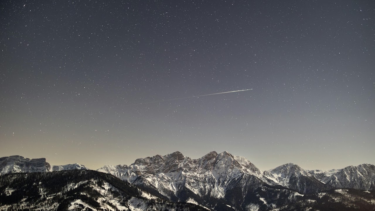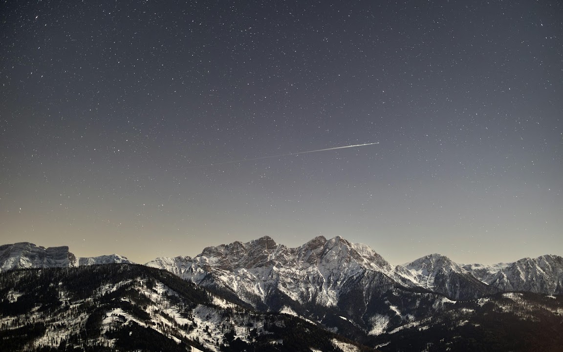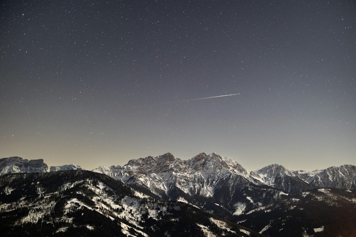 Dark mountain peaks covered in snow stand under a wide, starry night sky showing an airplane trail.