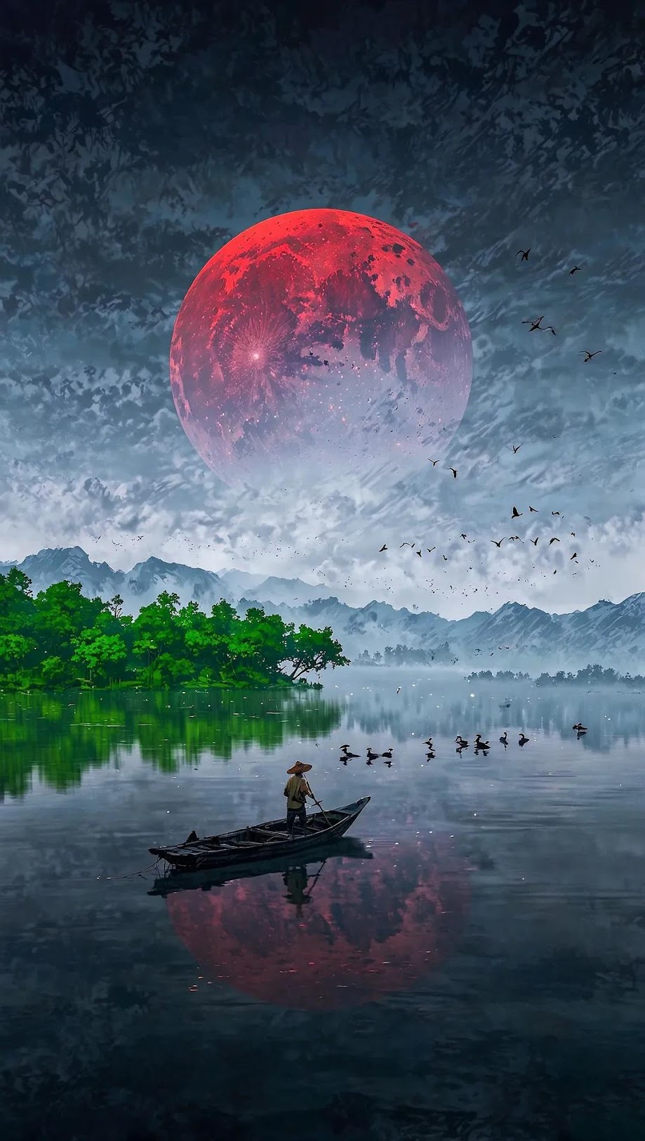 Red Moon, Asian Landscape, Fantasy Art, Boat iPhone Wallpaper Background with a maximum resolution of 1080x1909 px.