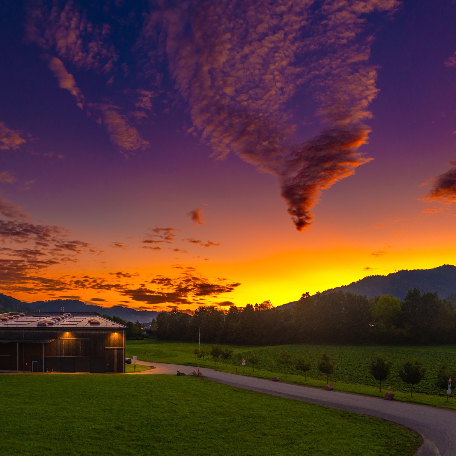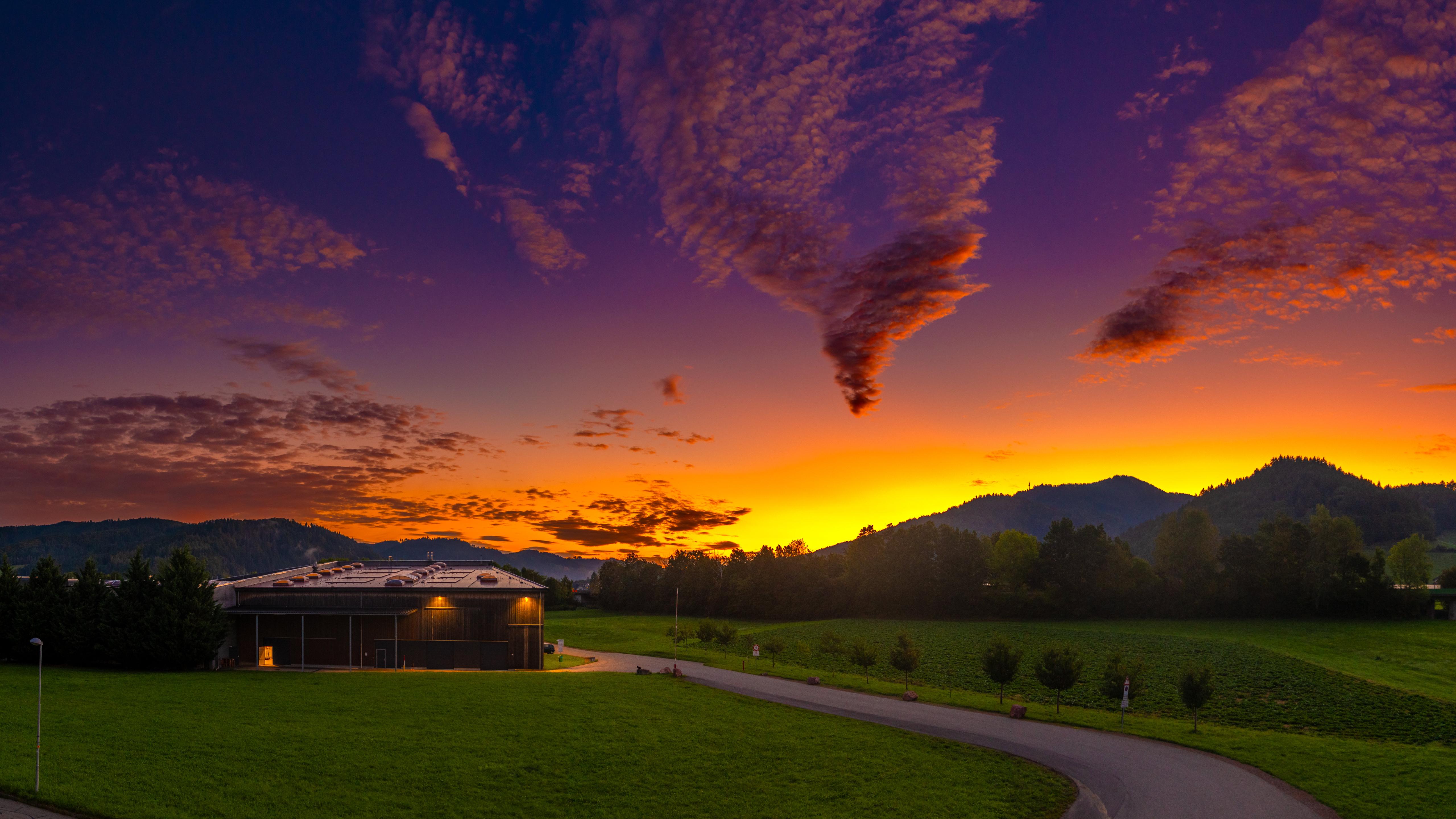 Sunset Landscape, Dramatic Sky, Mountain Scenery, Rural Architecture 5K Desktop Wallpaper