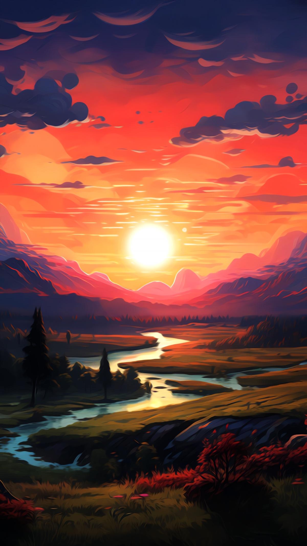 Sunset Landscape, Vibrant Nature Scene, Mountain River Art, Fantasy Scenery Full HD iPhone Wallpaper Background with a maximum resolution of 1200x2133 px.