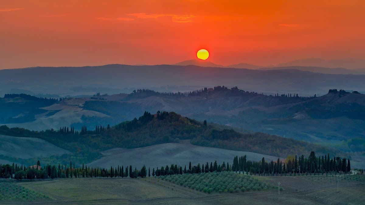 Tuscany, Sunset, Italian Landscape, Cypress Trees 5K Desktop Wallpaper