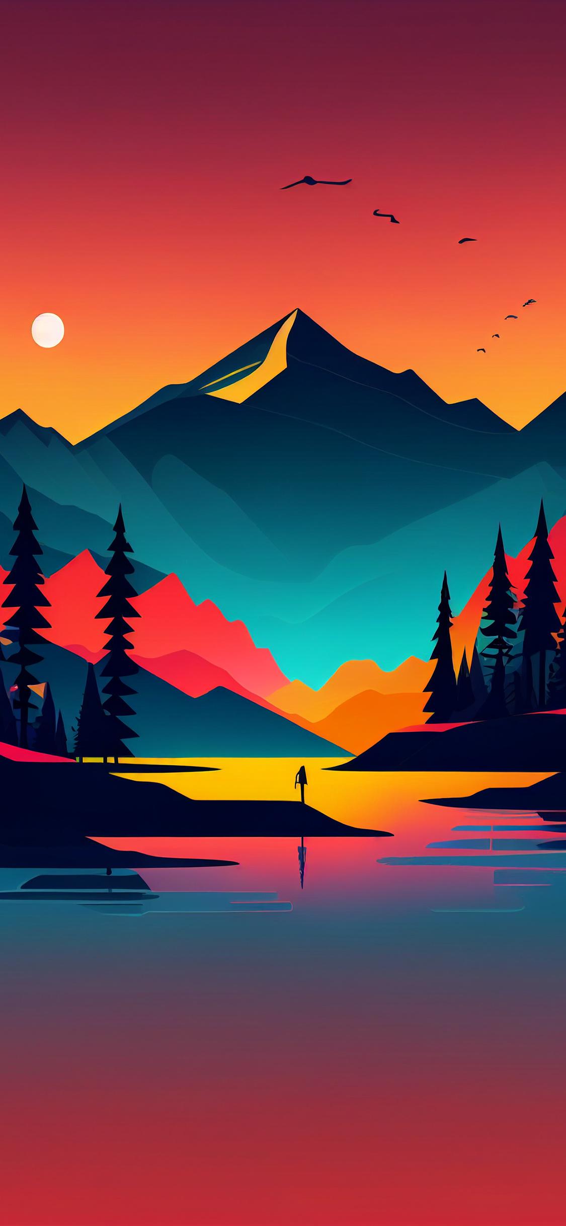 Vector Illustration, Mountain Sunset Art, Minimalist Landscape, Vibrant Nature Scene Full HD iPhone Wallpaper Background with a maximum resolution of 1125x2436 px.